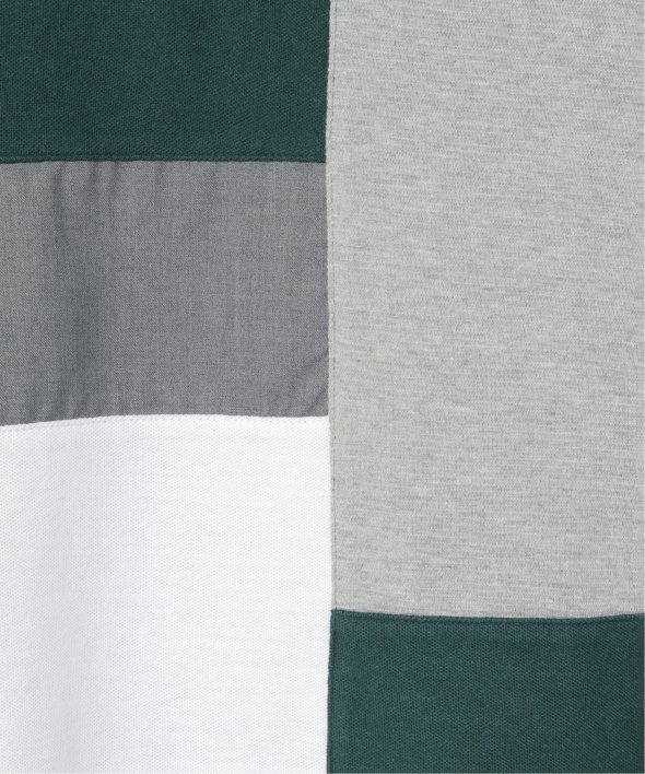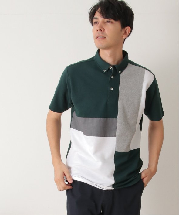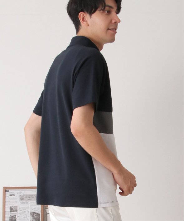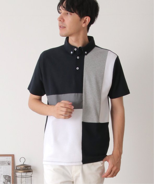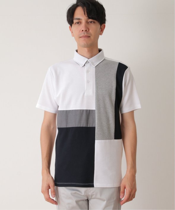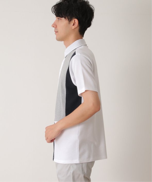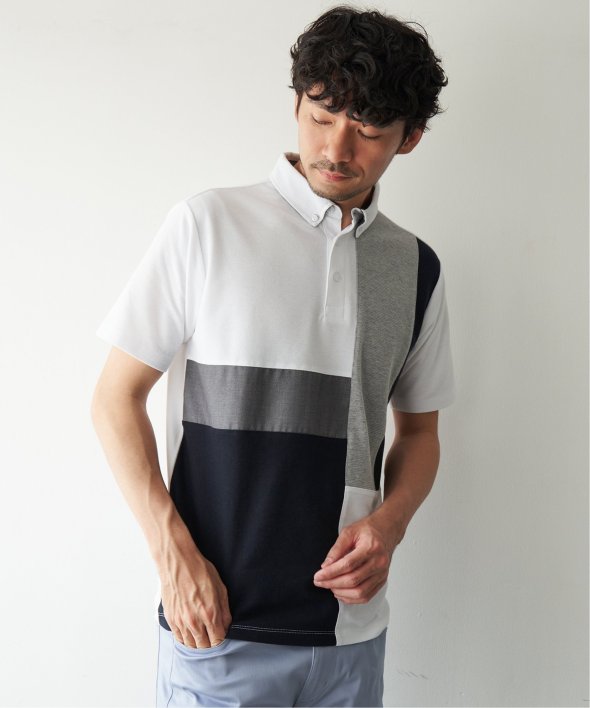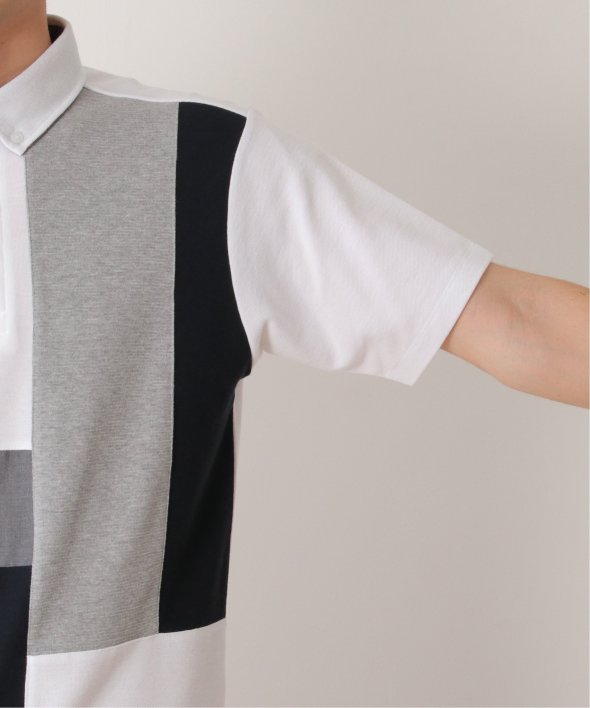 鹿の子・リップル・布帛の異素材切り替えコンビネーションポロシャツ。
