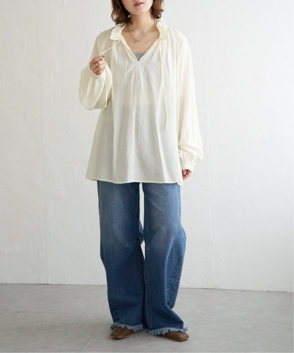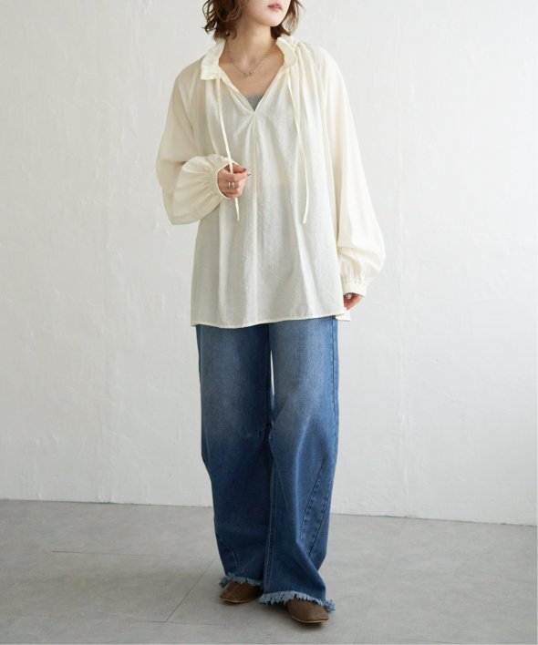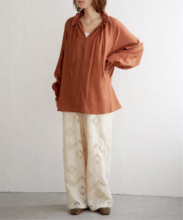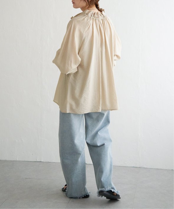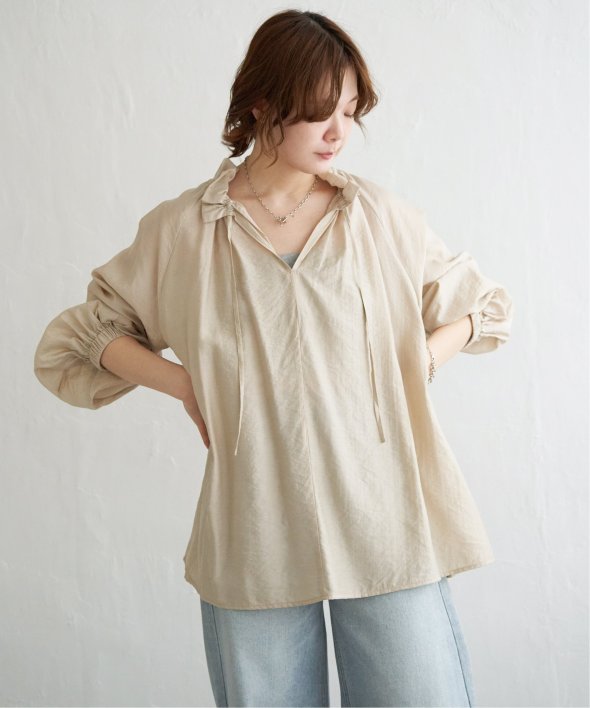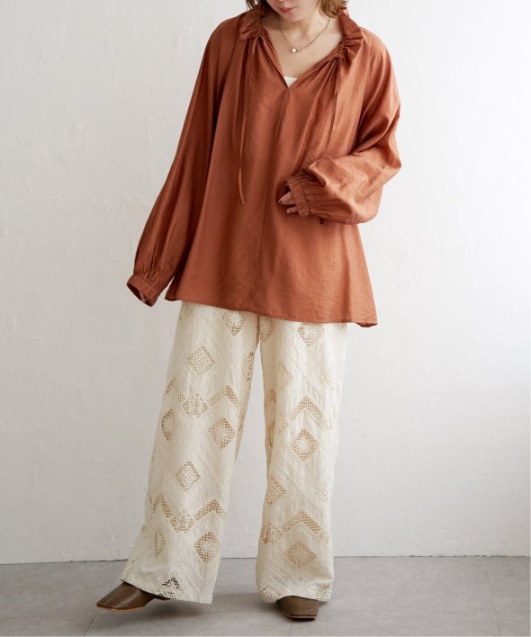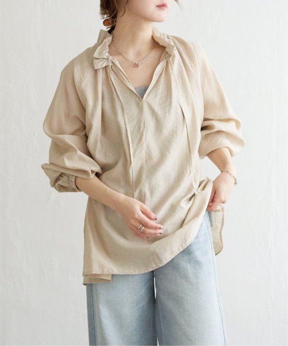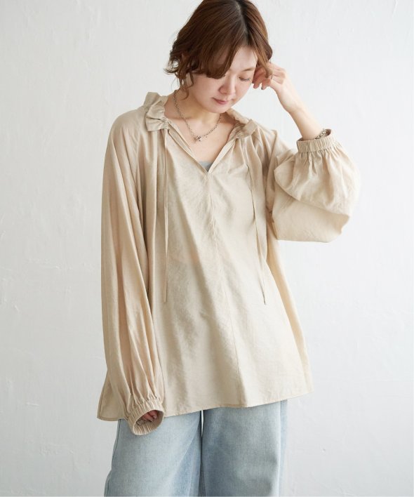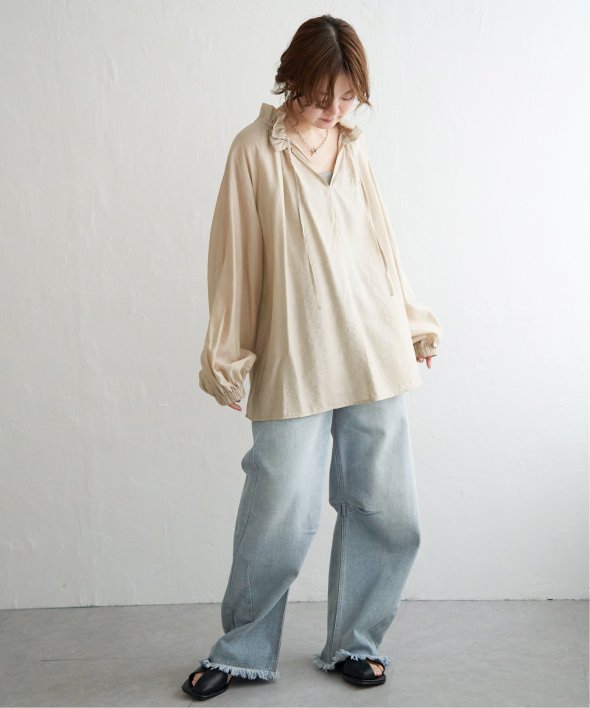 首元のフリルとボリュームスリーブがほどよい甘さを添え、ナチュラルカラーが大人っぽい抜け感をプラス。