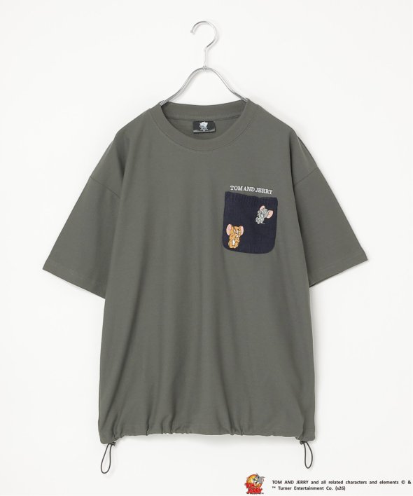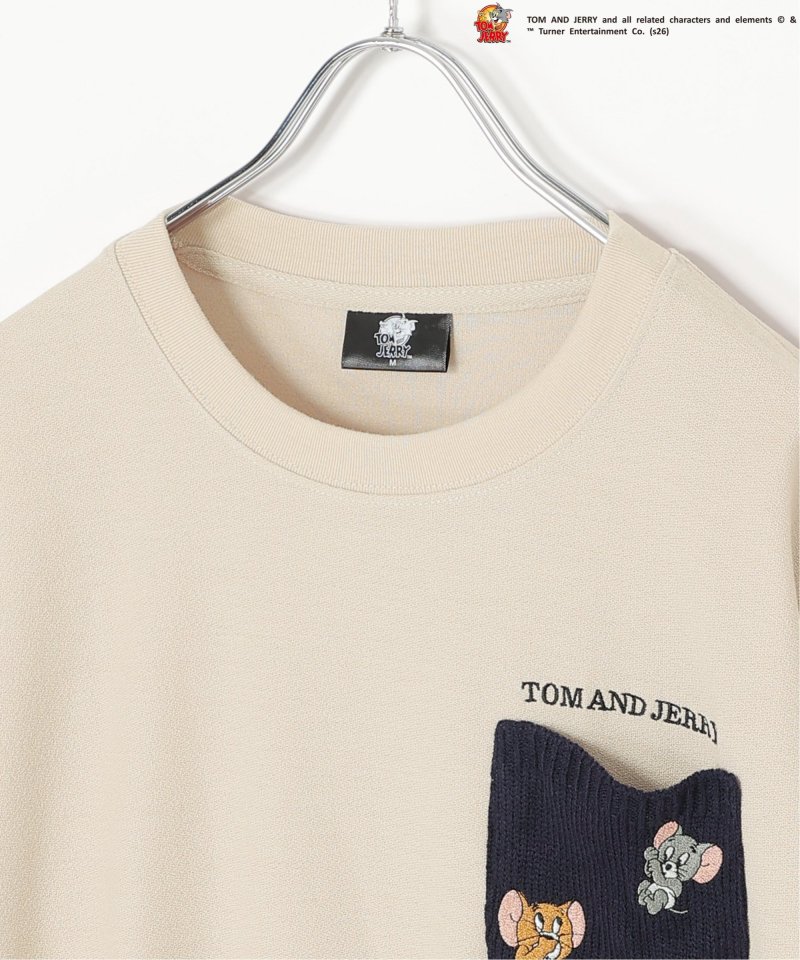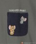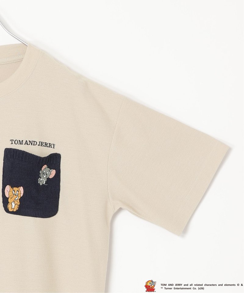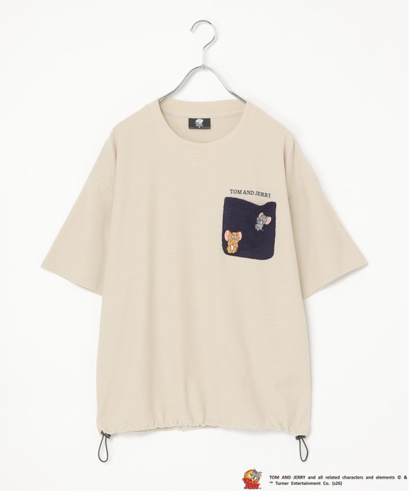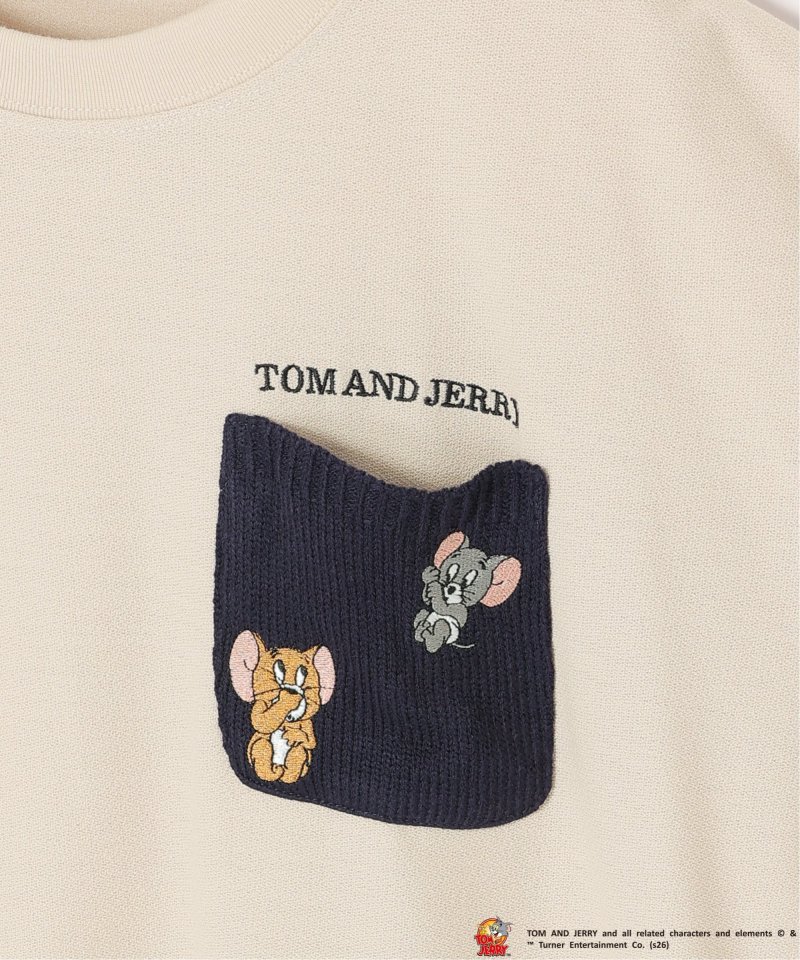 見つめあうジェリーとタフィーの刺繍を取り入れた配色ニットポケットTシャツ。