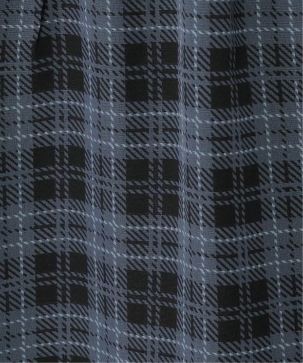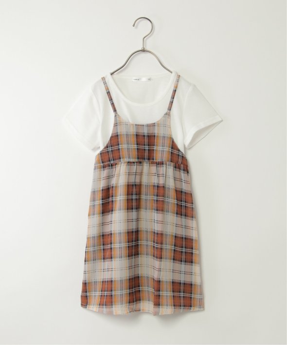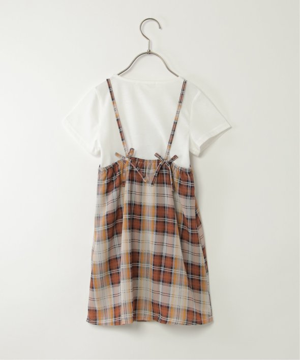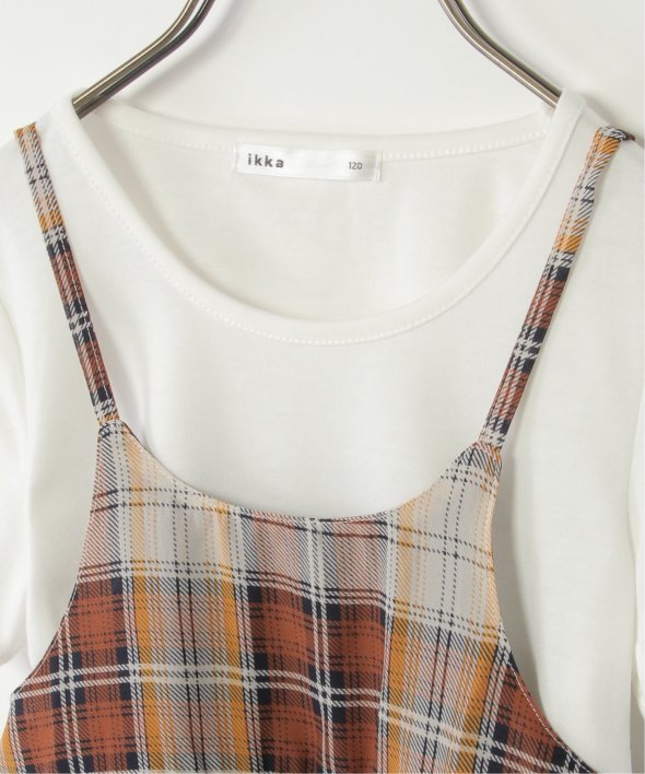 白のシンプルなTシャツとチェック柄キャミワンピースのセット。