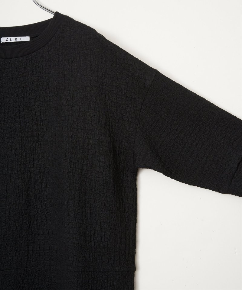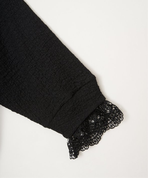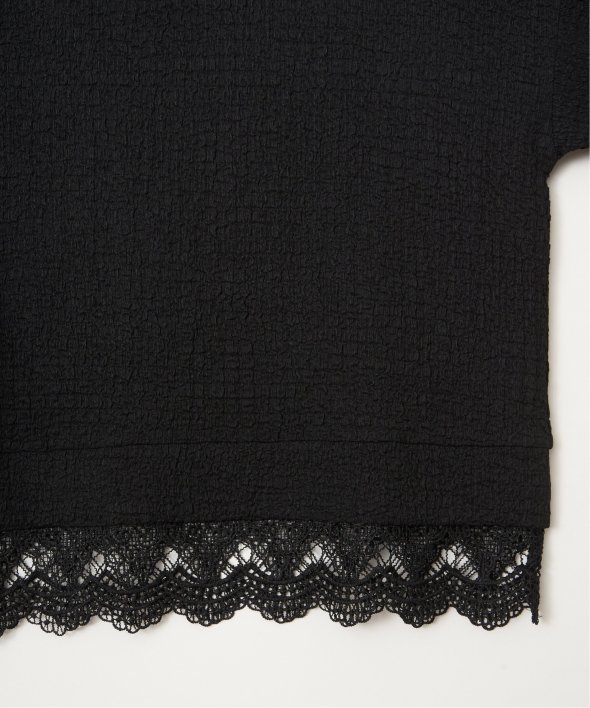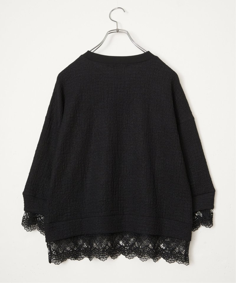 表面にポコポコとした表情のあるカットソー素材を使用したプルオーバー。裾と袖にはレースを重ねたようなフェイクレイヤードデザインです。【素材】ポコポコ表面感のあるカットソー素材に、微ラメ裾と袖にフェイクレイヤードのレース付き。【デザイン】リブ使いのクルーネックプルオーバー。【ポイント】トレンドのレースレイヤードの着こなしを一枚で簡単に楽しめるデザインプルオーバー。甘くなりすぎないカラーリングとレース柄がポイントです。