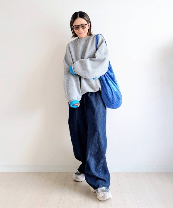 袖をまくって配色を見せるだけで、シンプルなボトムスも新鮮な印象に仕上がります。