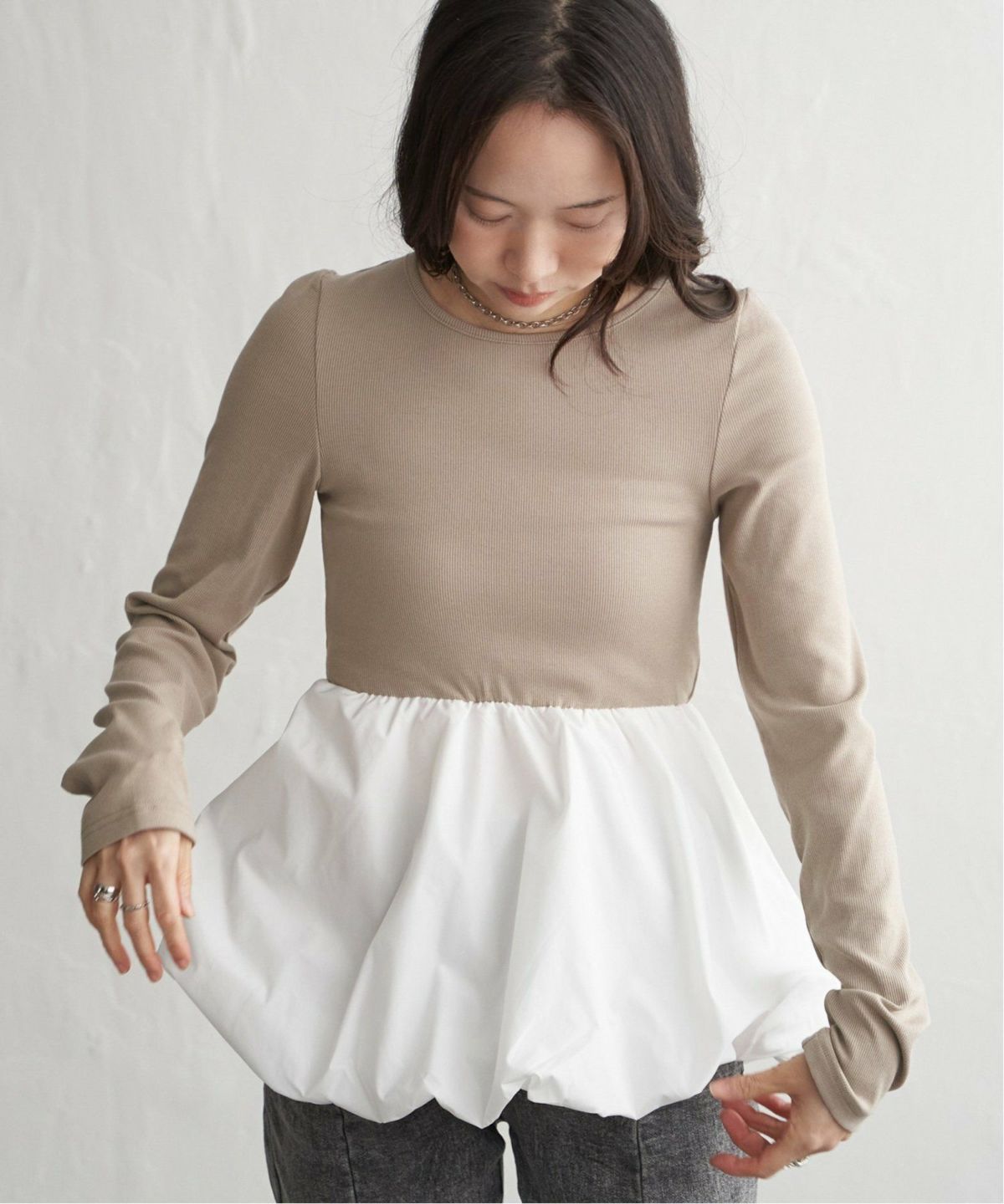 異素材のコントラストで、着るだけで立体美が叶う 異素材コンビバルーンチュニック