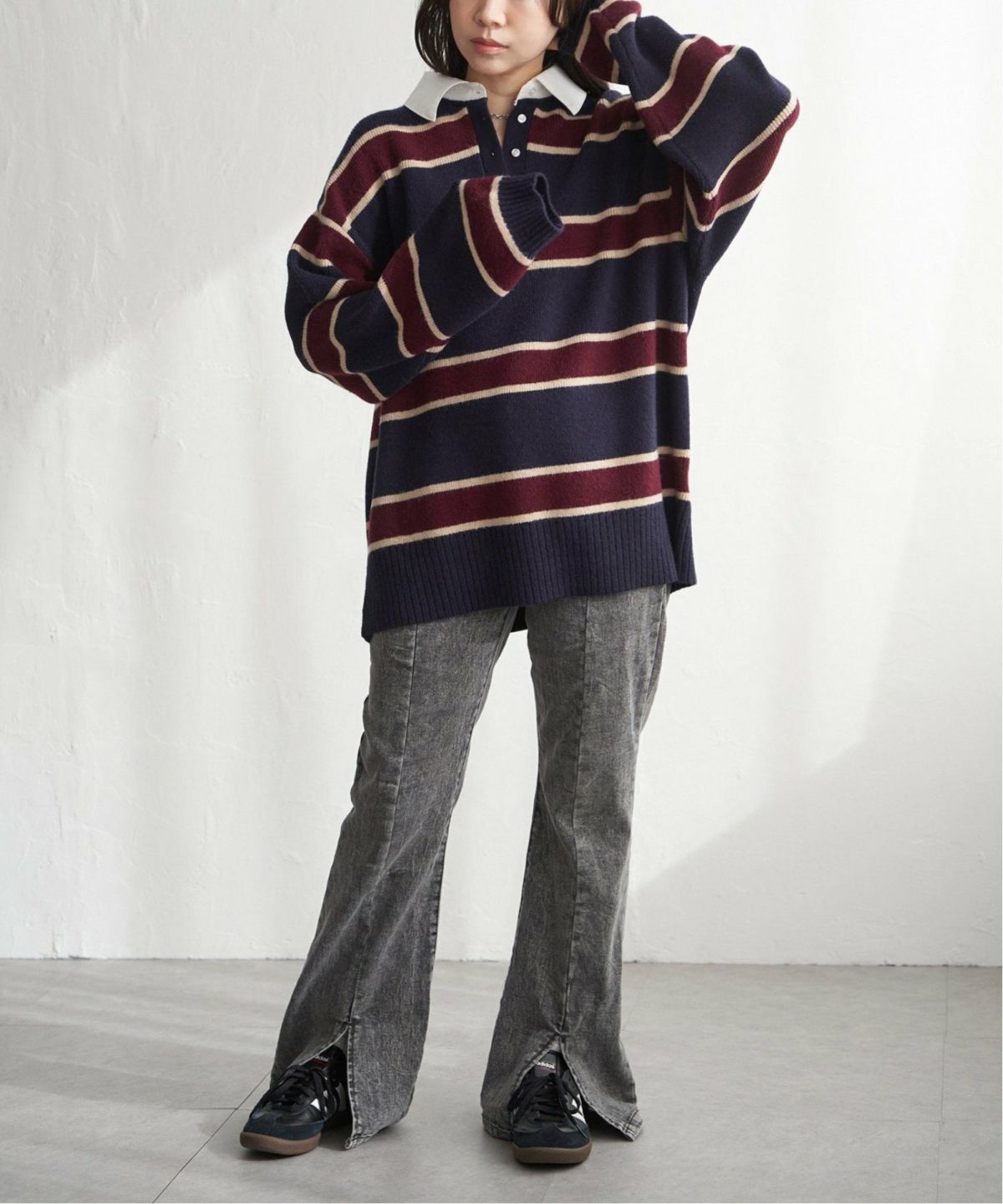 配色レイヤードが効いた、シンプル以上な一枚 12G配色ヘンリープルオーバー