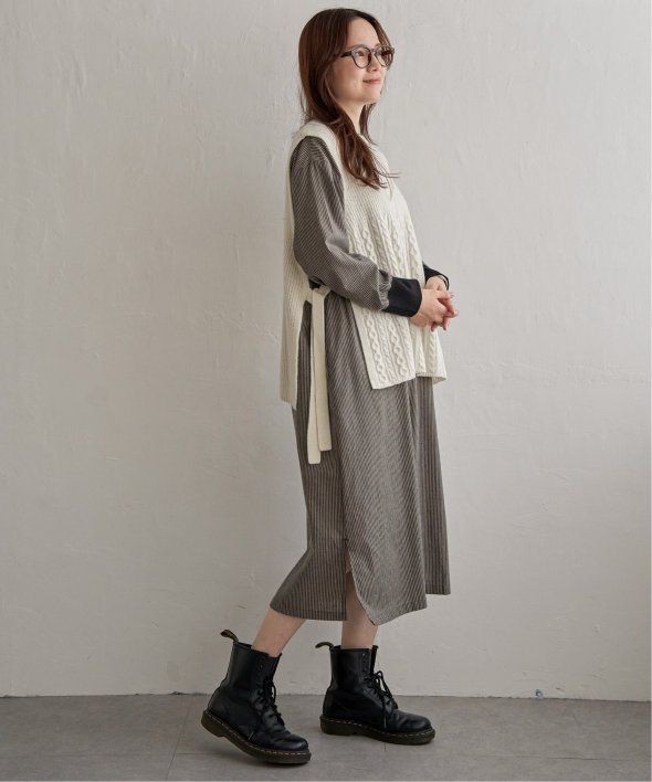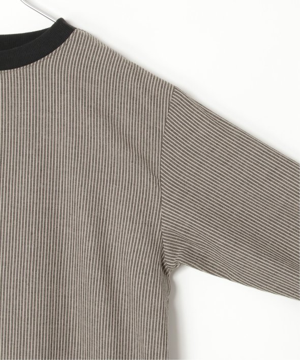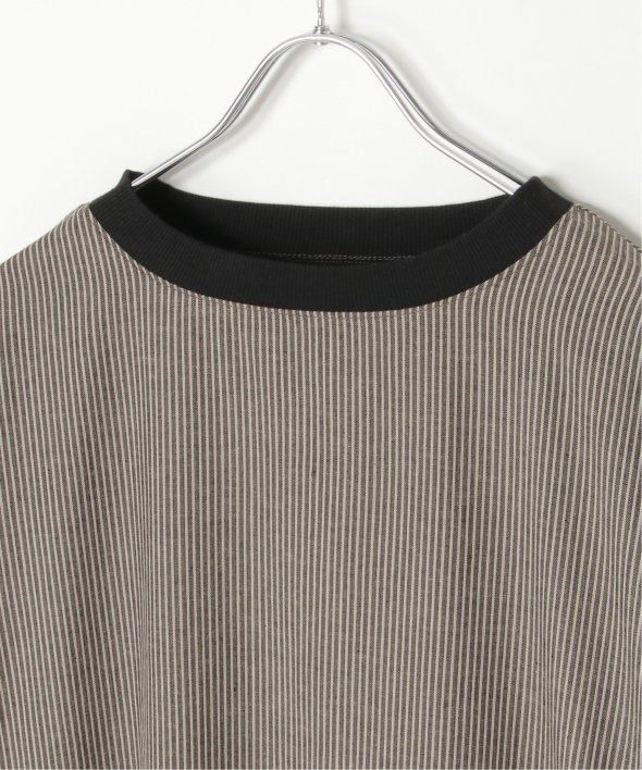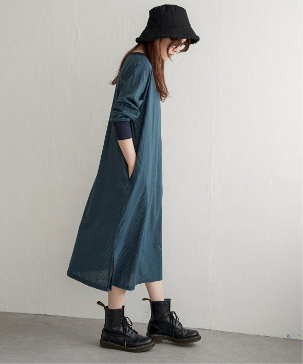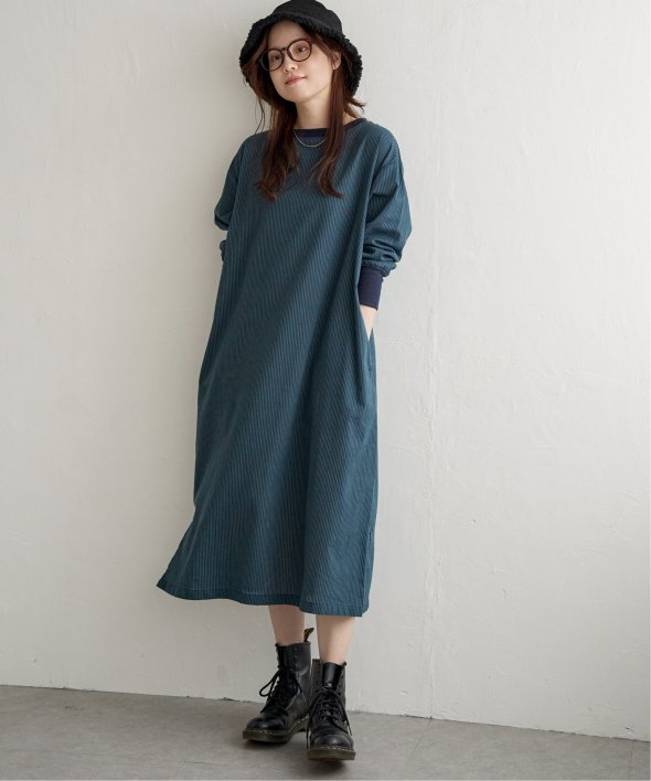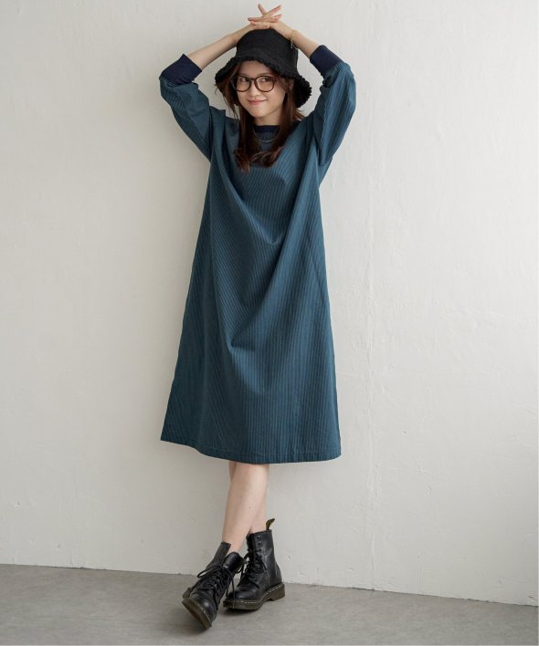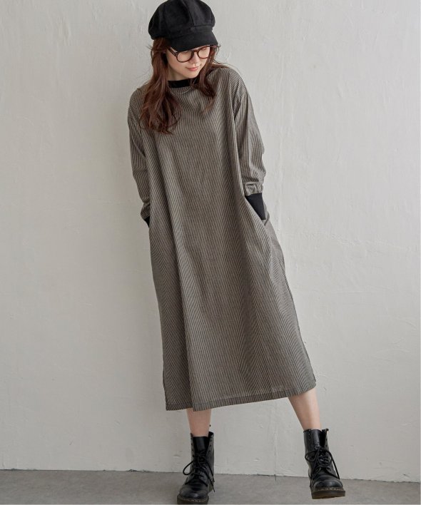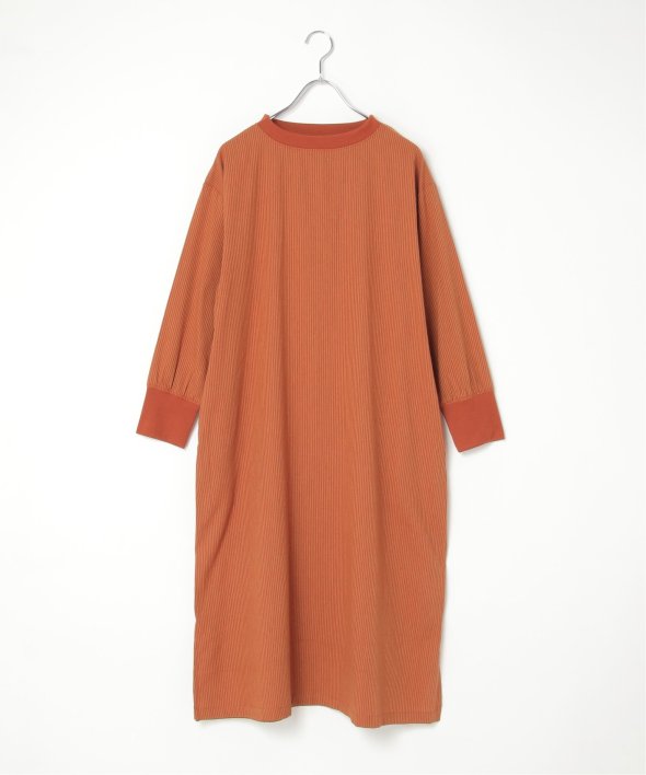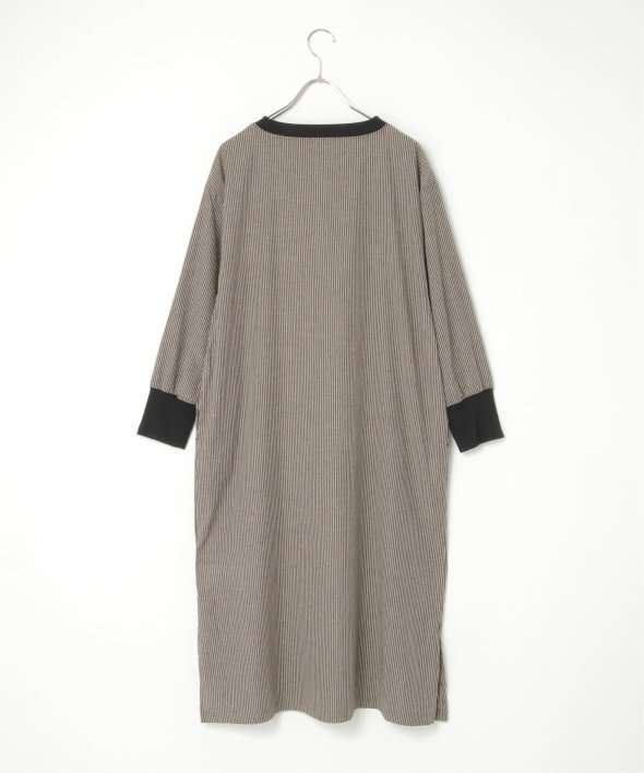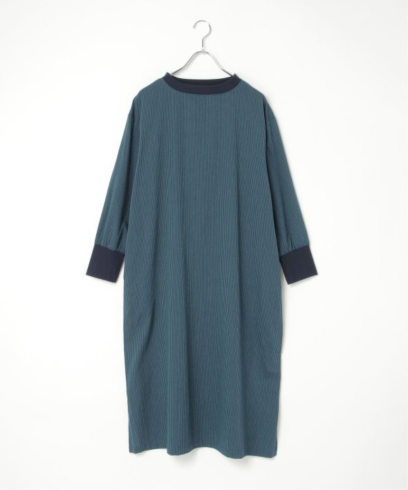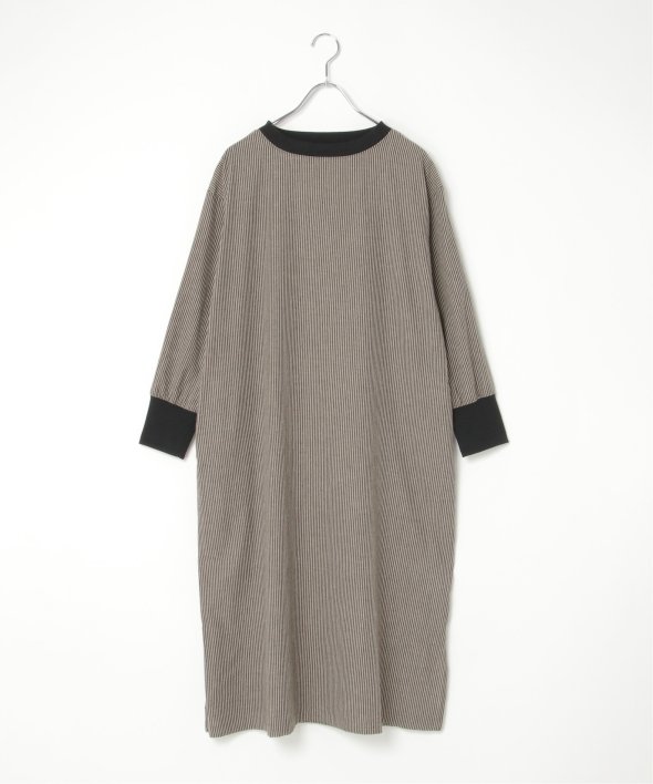 ネックラインと袖口にリブ切り替えを施したストライプ柄のワンピース。
