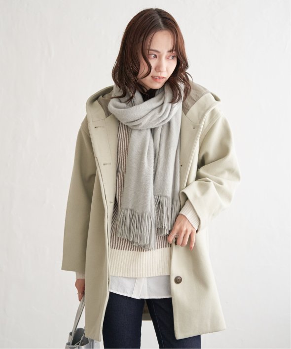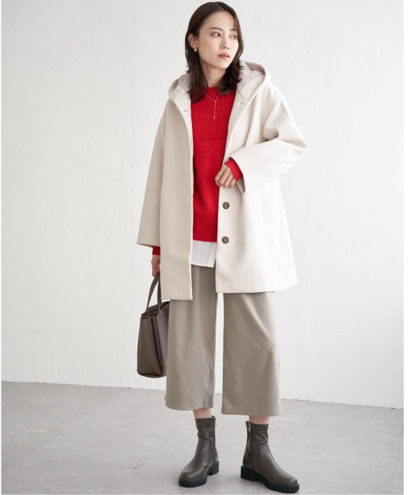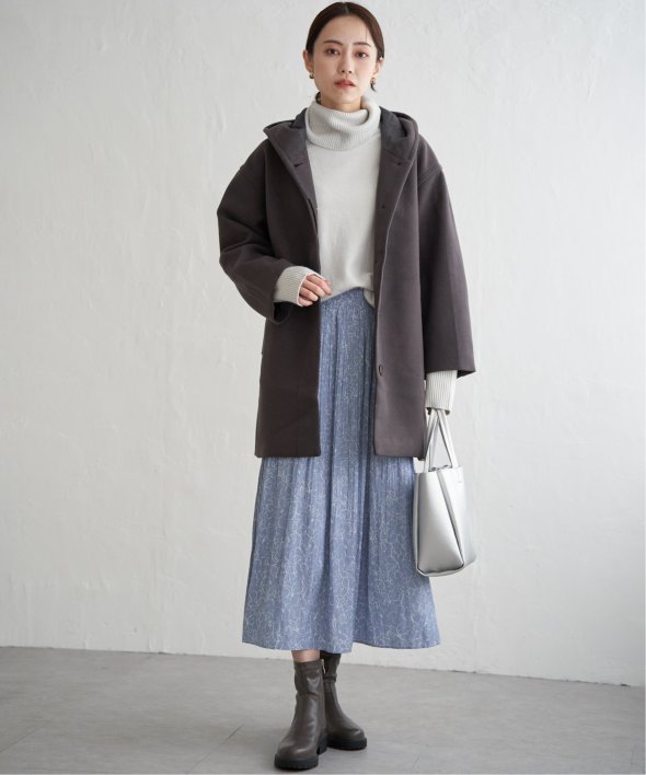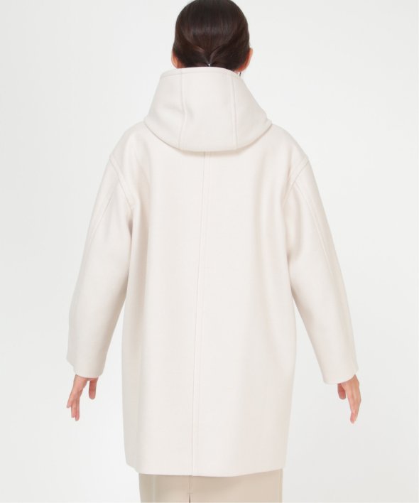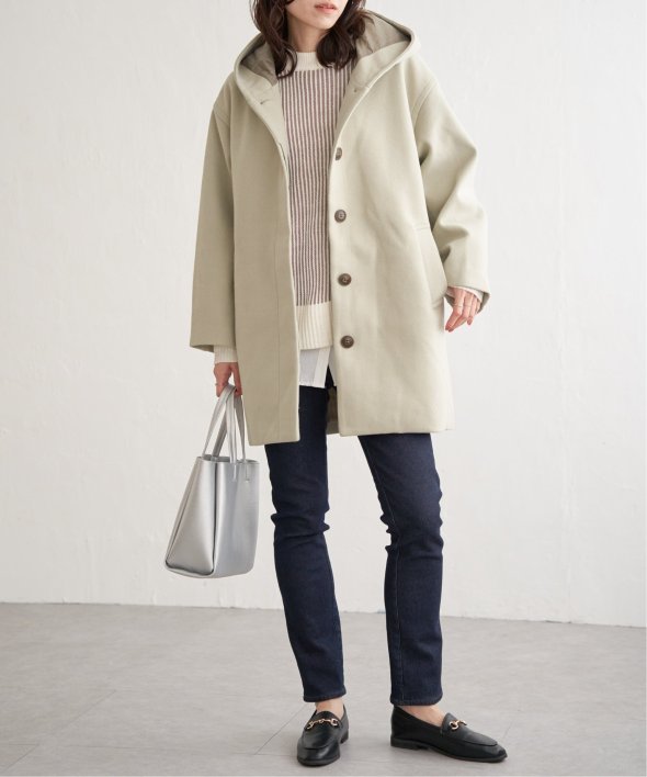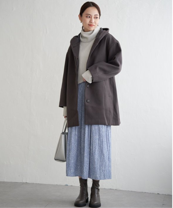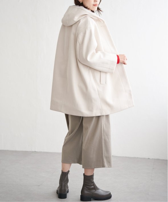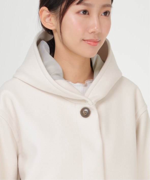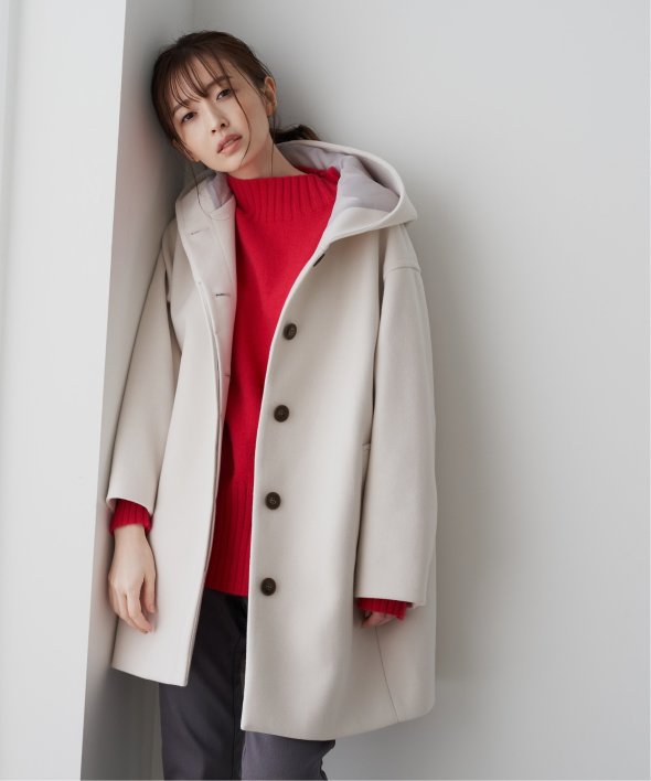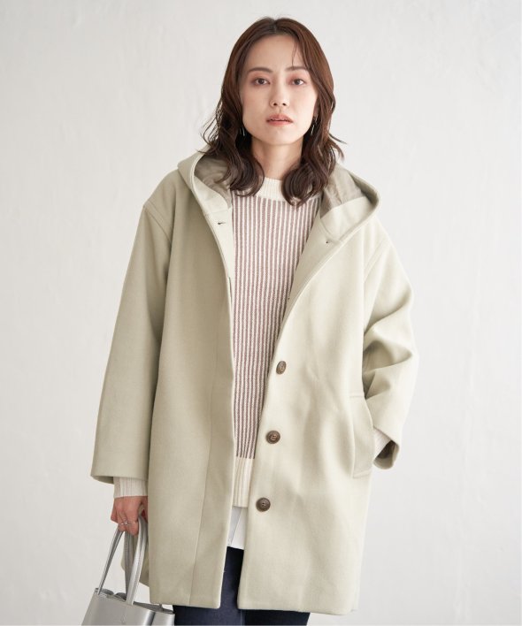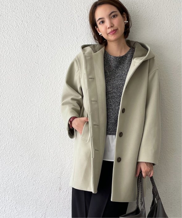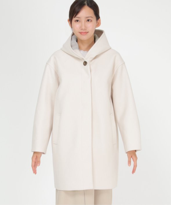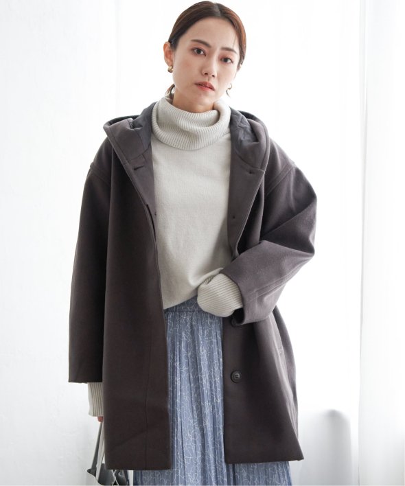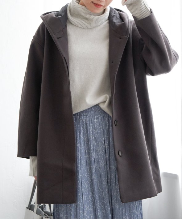 コクーンシルエットで肩回りにゆとりのあるフード付きのミドル丈コートです。