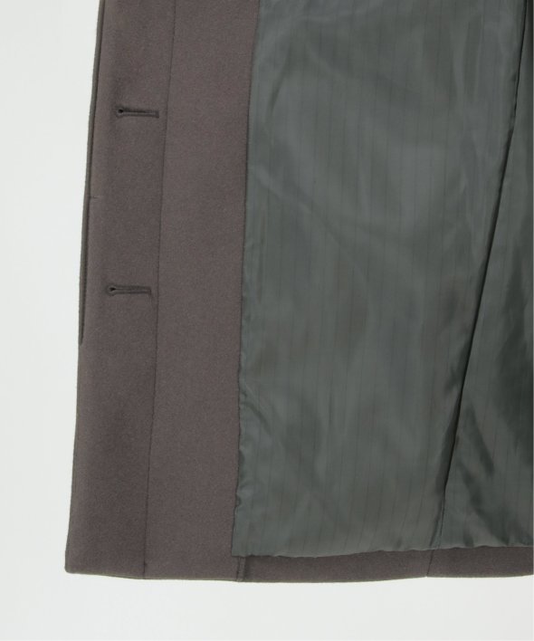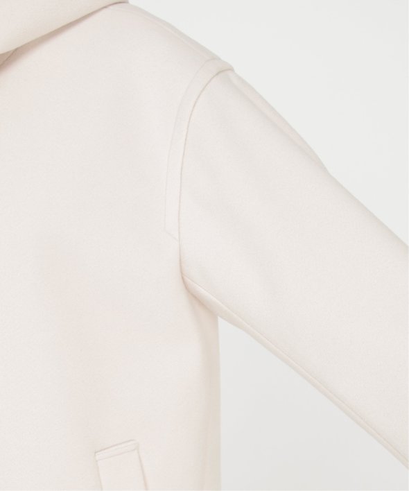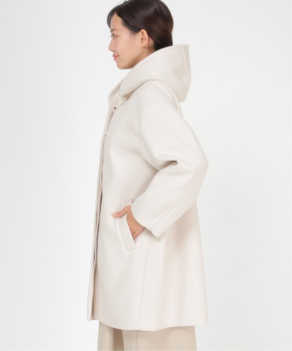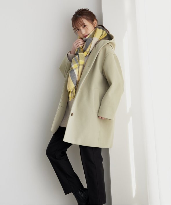 メルトン加工を施した起毛素材のミドル丈フード付きコートです。