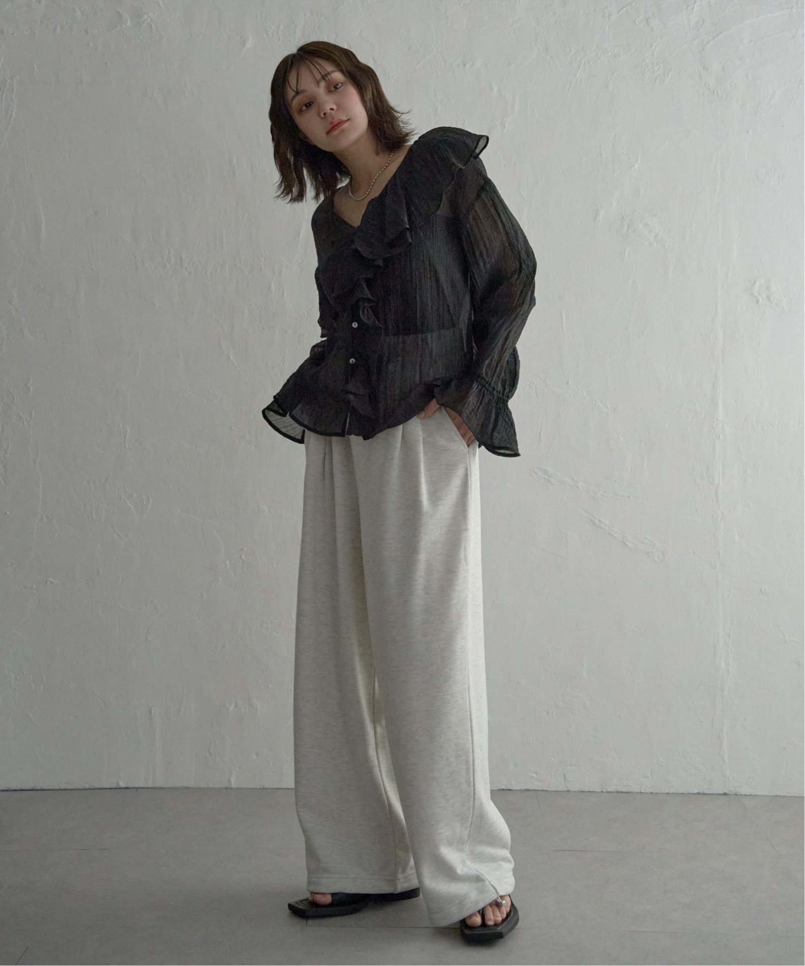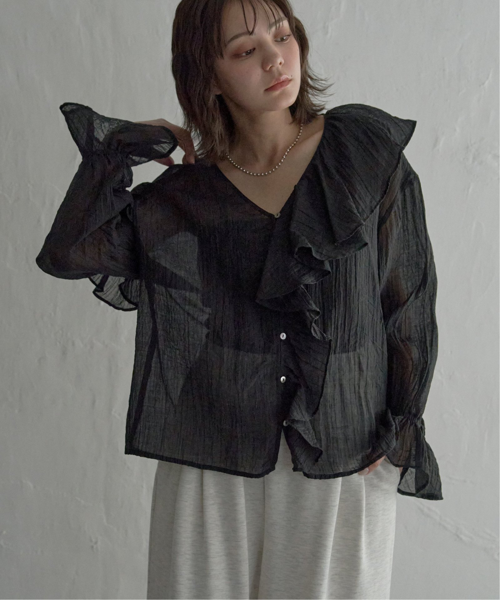 甘さを楽しむ大人のフェミニンスタイル フリルシャツ