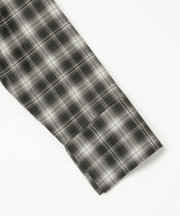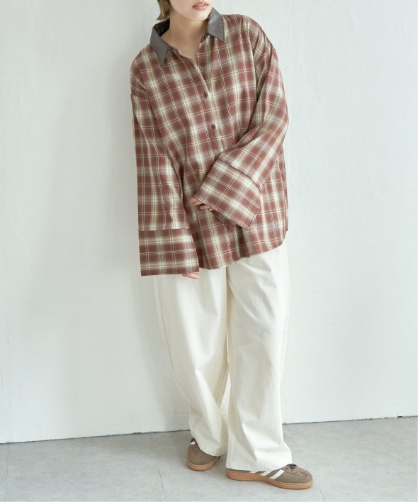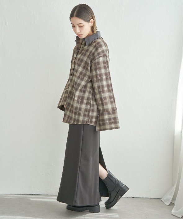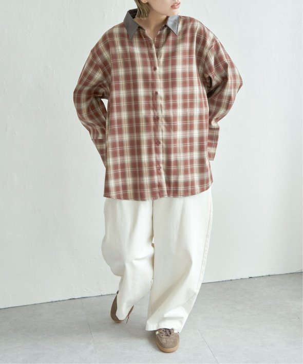 襟を合皮に切り替えたことで、カジュアルなチェックシャツに都会的なニュアンスをプラス。