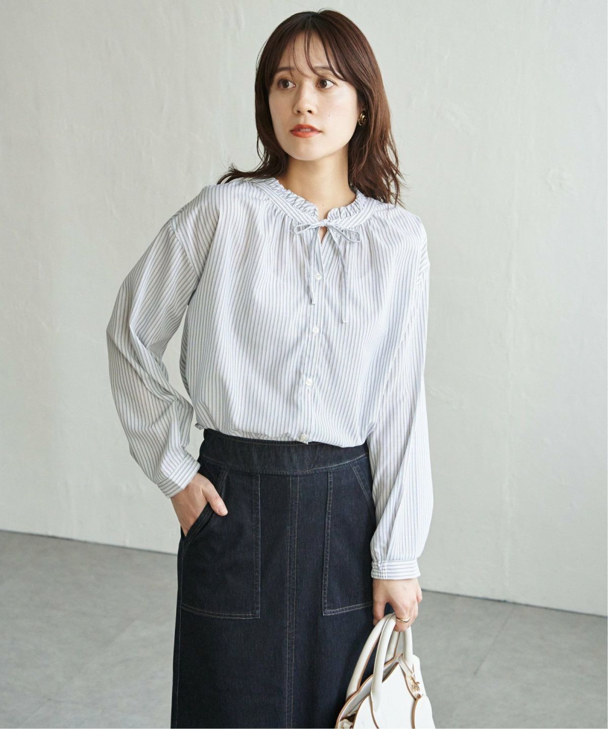 甘さをほどよく効かせたブラウス デニムコットンシャーリングブラウス