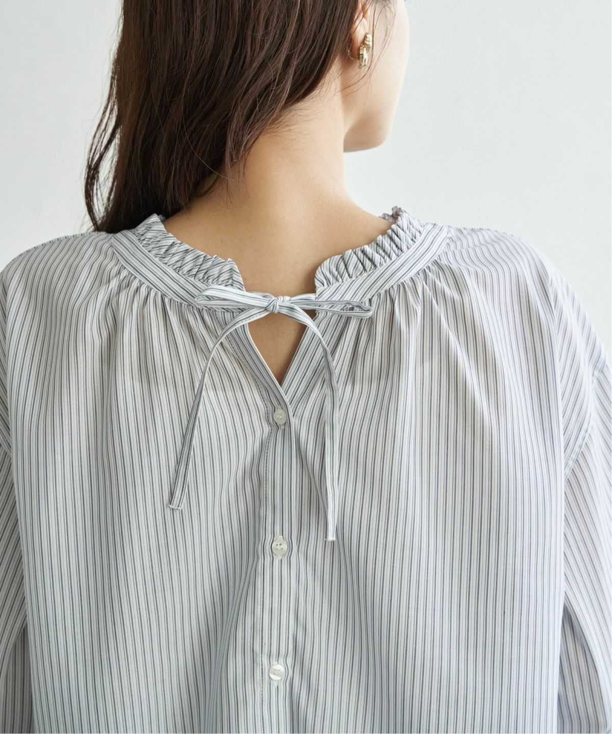 ストライプとリボンが描く余裕のあるムード バンドカラーセットアップシャツ