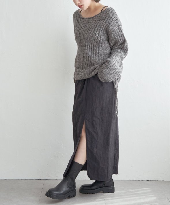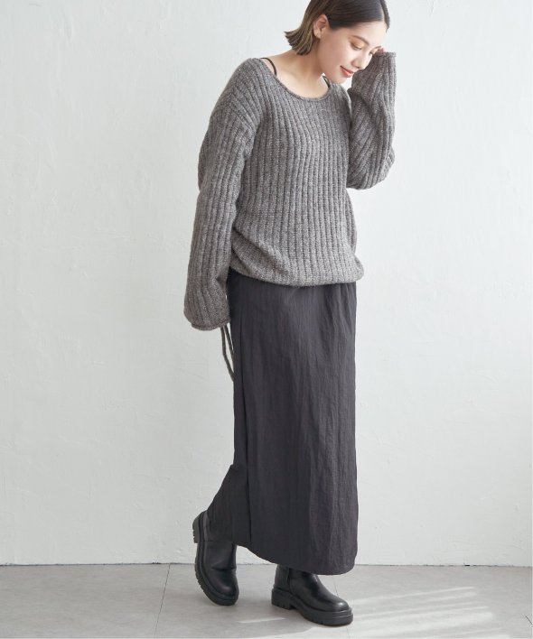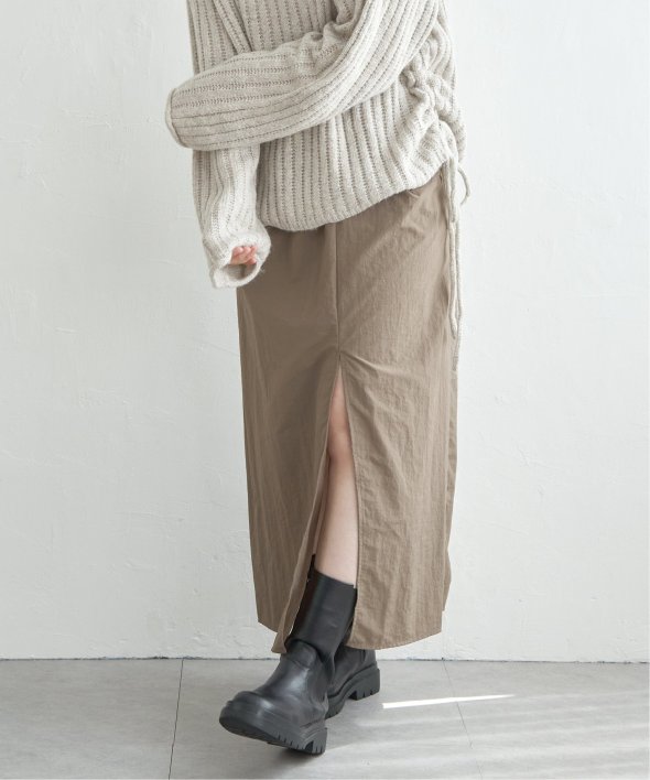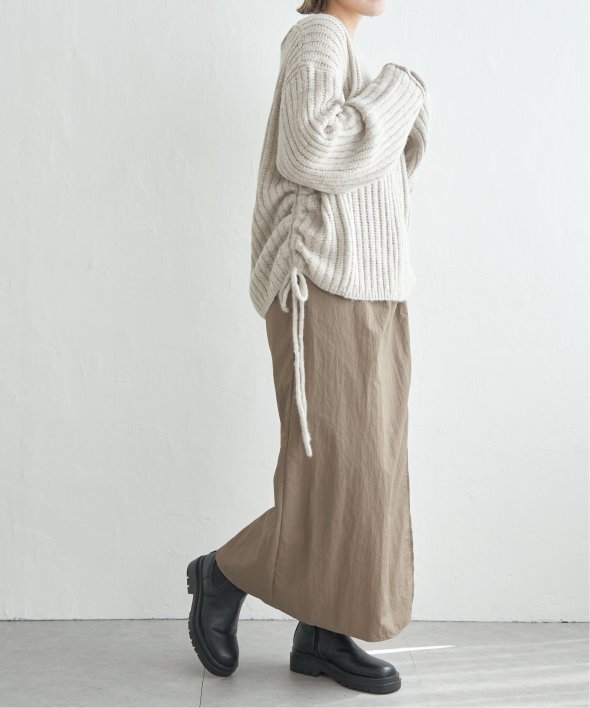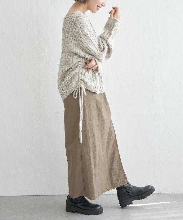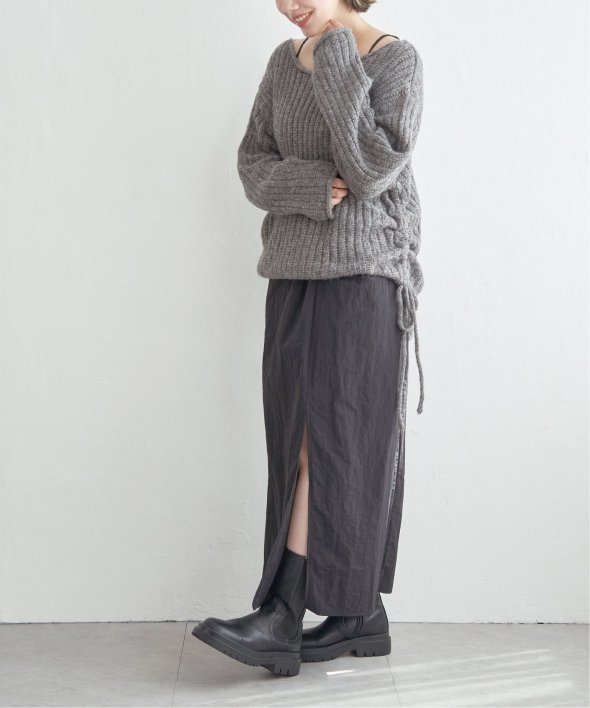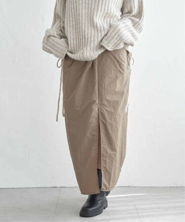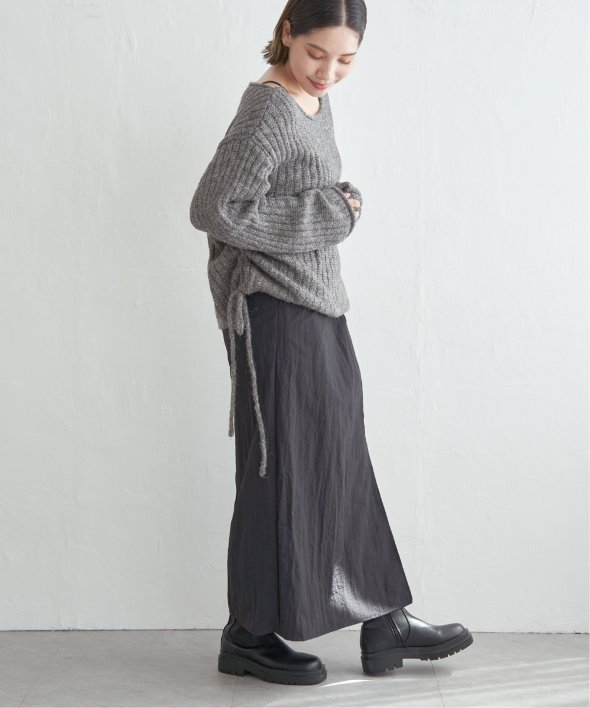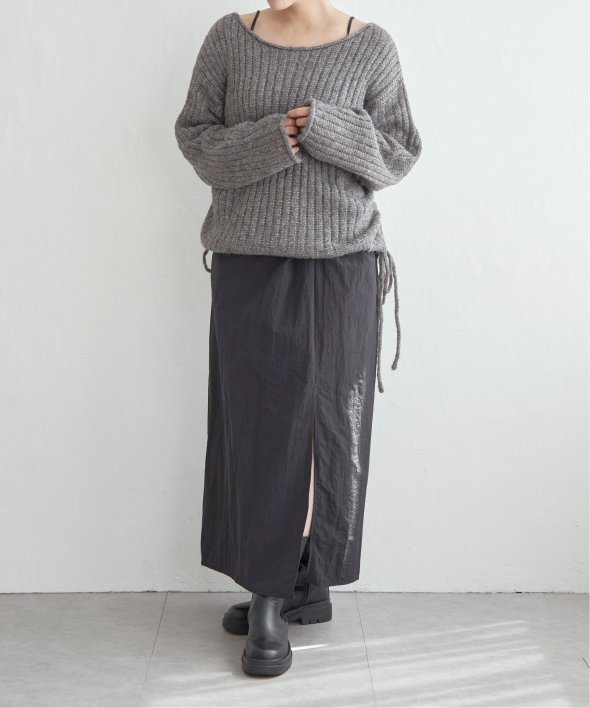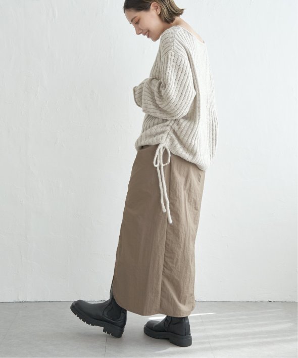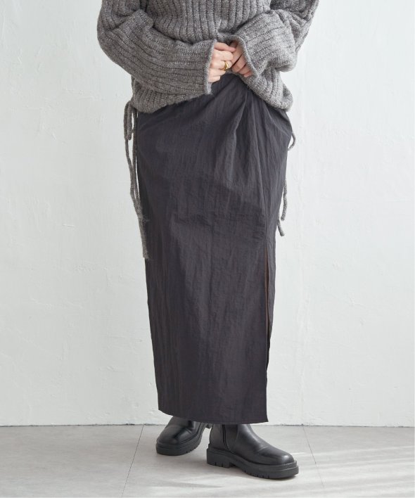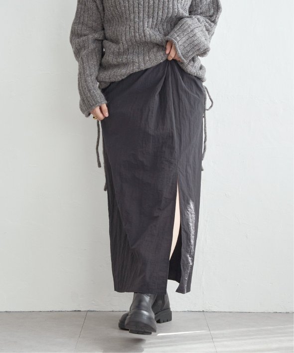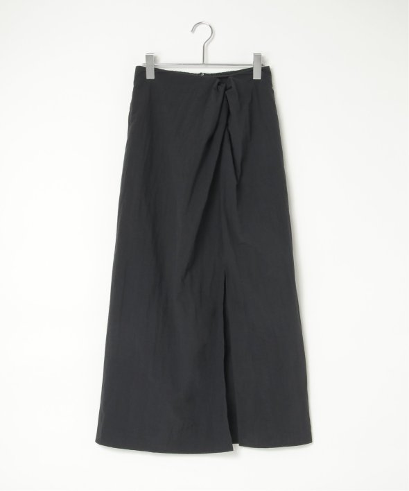 ツイストによる立体的なデザインが、シンプルながら存在感のあるスカートスタイルを演出します。