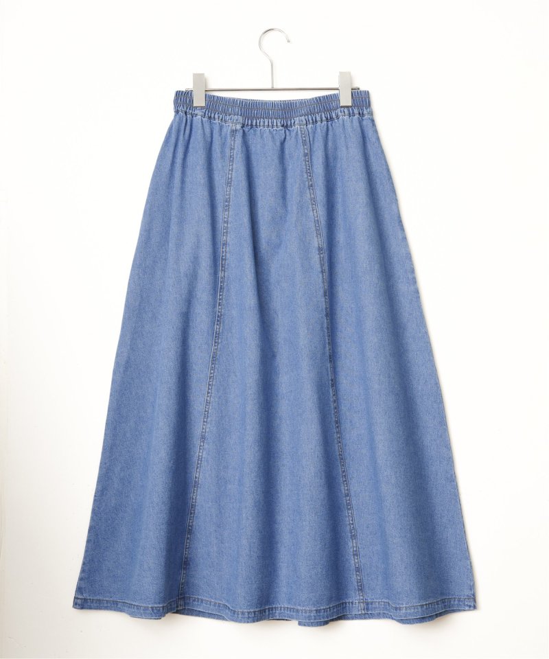 やわらかなデニム、綿ツイルのバリエーションを揃えたフレアスカート。ワークポケットを効かせたデザインが、シンプルな中にほどよいアクセントを添えます。ウエストは総ゴム仕様で、見た目とラクさを両立した一枚です。【素材】やわらかデニムと綿ツイル。【デザイン】ロング丈のフレアシルエット。【ポイント】ワークポケットがアクセントのフレアスカート。ベーシックで着やすいアイテムに仕上げました。ウエストはゴム使いで、内側にドロストもあるのため調整しやすくらくちんです。