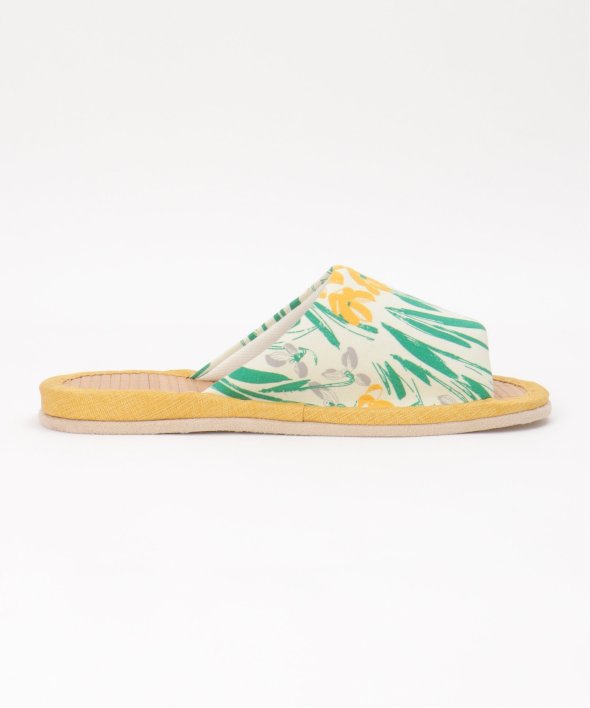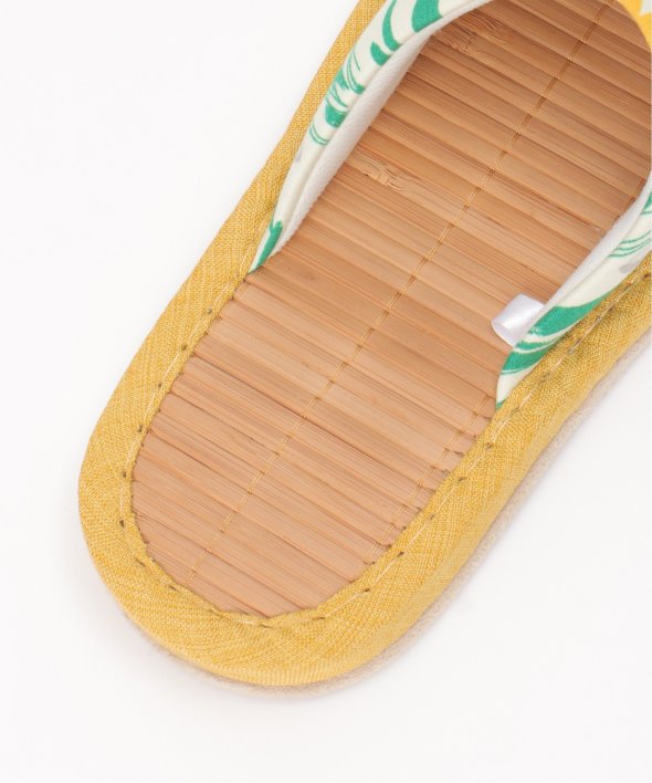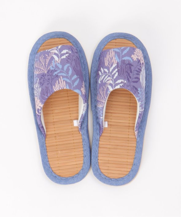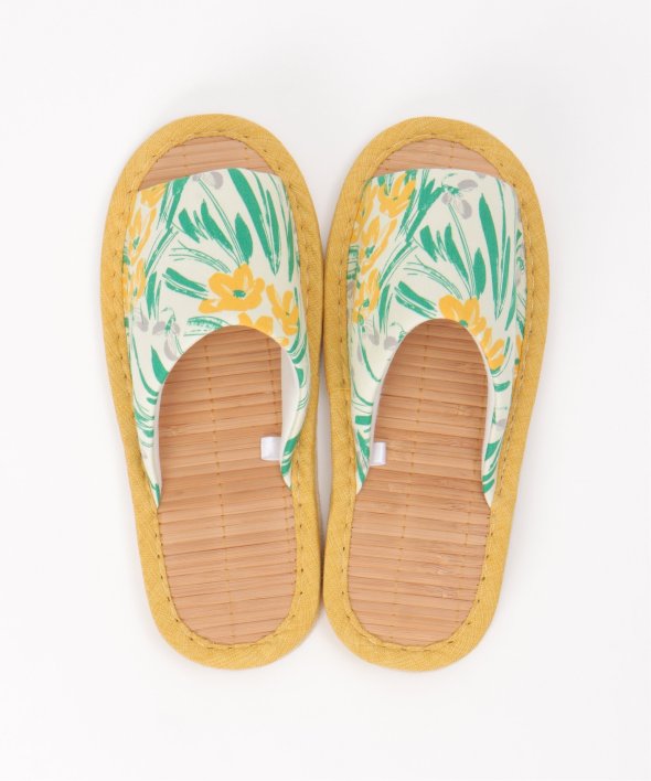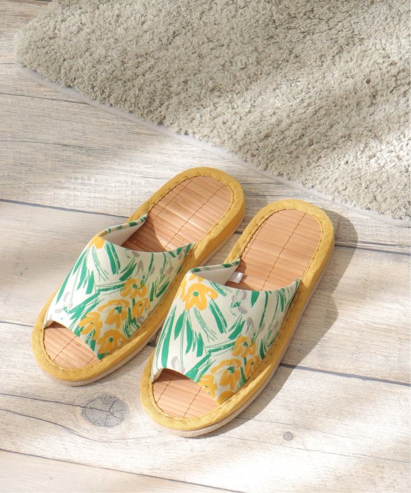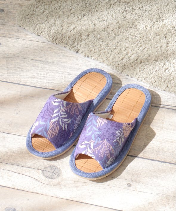 細めの竹をすだれのように繋いで作った、見た目にも涼しげなスリッパです。【素材】中敷きに竹を使用しており、べたつきにくい!【デザイン】ひんやりと心地よい竹インソールのスリッパ。底材をフェイクスエードに改良し夏の床のべたつきを解消します。【ポイント】夏にぴったりのボタニカル柄、花柄のスリッパ。ぱっと目を引く色目と柄が新鮮なデザインと、さらっとした生地が涼し気で魅力的です。