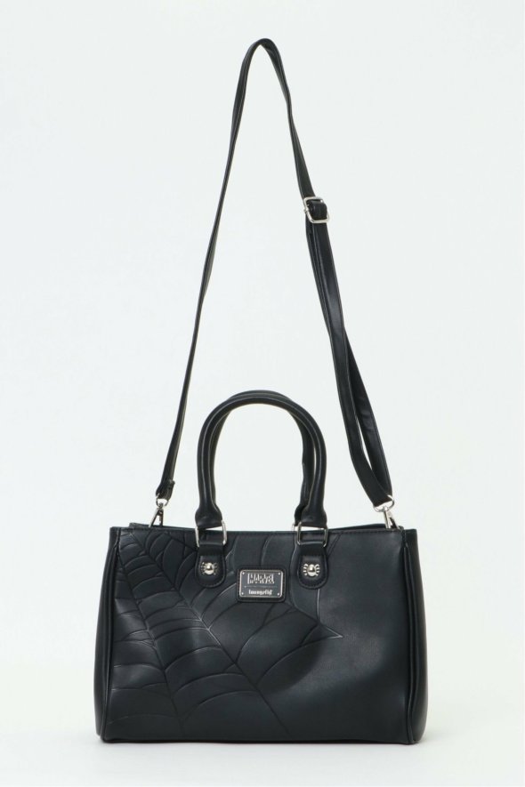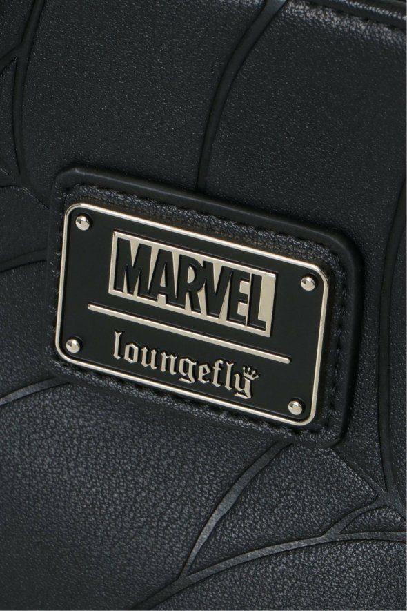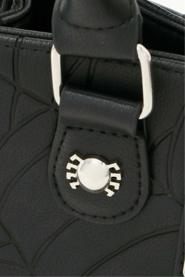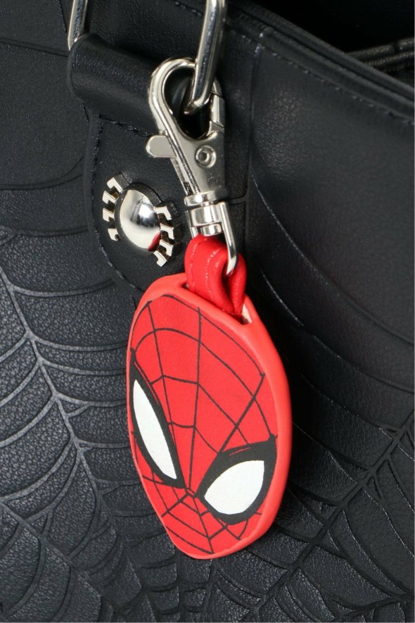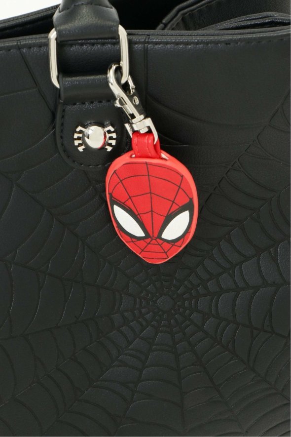 [アイテム説明]スパイダーマンのウェブ(クモ糸)を型押しデザインしたハンドバッグ。長さを調節できるストラップが付いているので、ショルダーバッグとしてもお使いいただけます。底鋲付きで安定感も抜群です。収納に便利な4ポケットと、スパイダーマンのチャームがポイント。Loungefly/ラウンジフライ