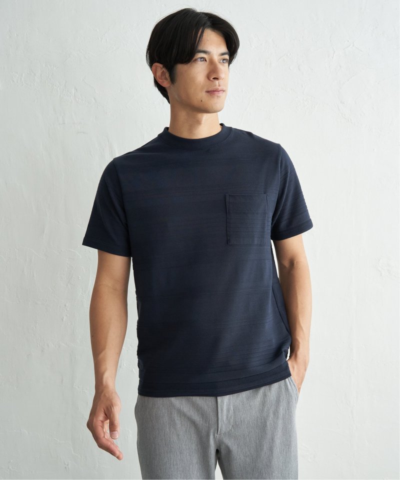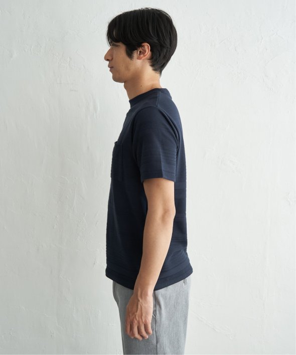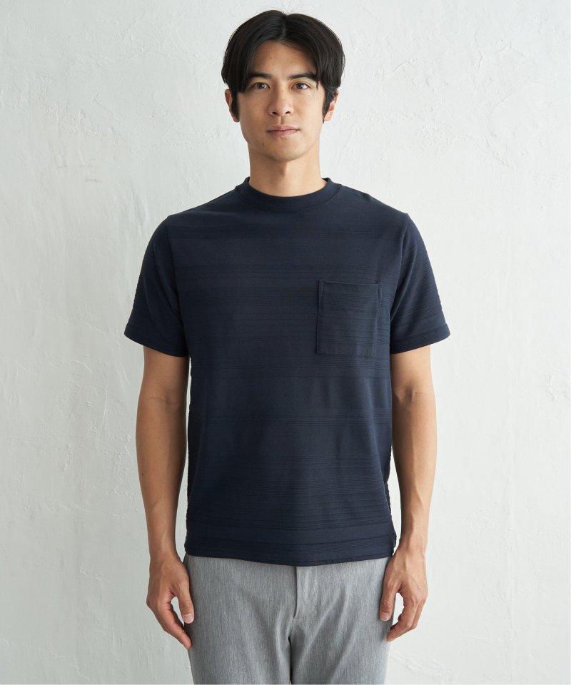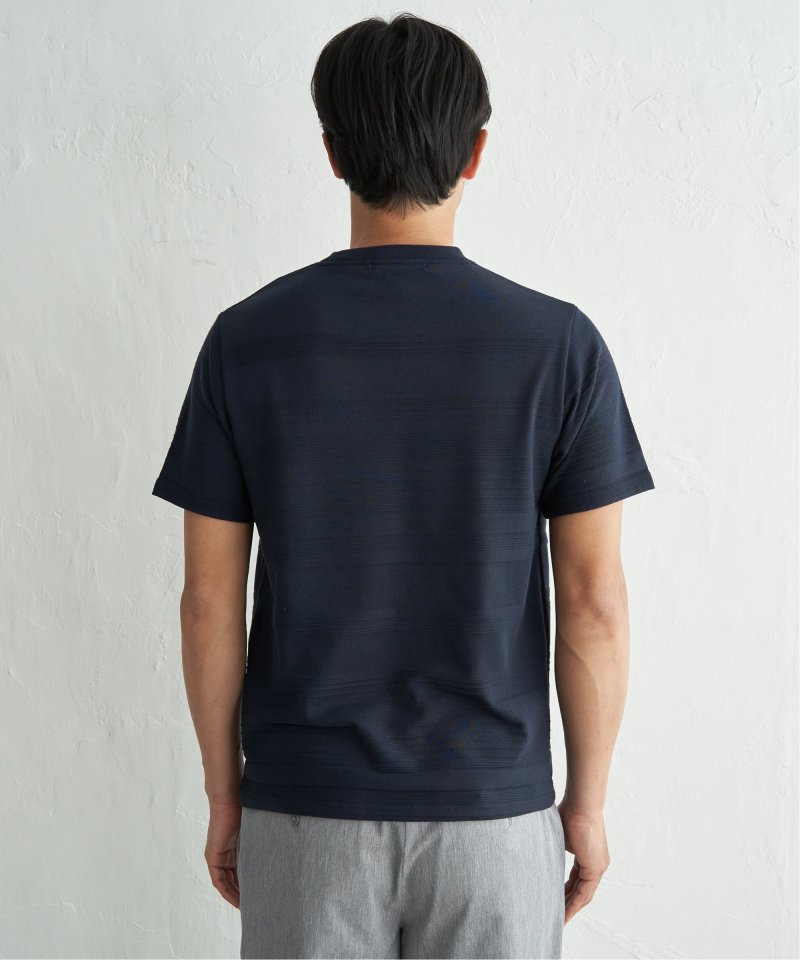 シンプルな半袖のクルーネックTシャツですが、生地の表面に凹凸のある地柄のランダムボーダーが特徴。
