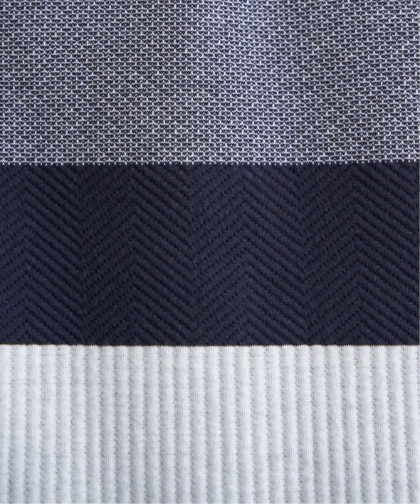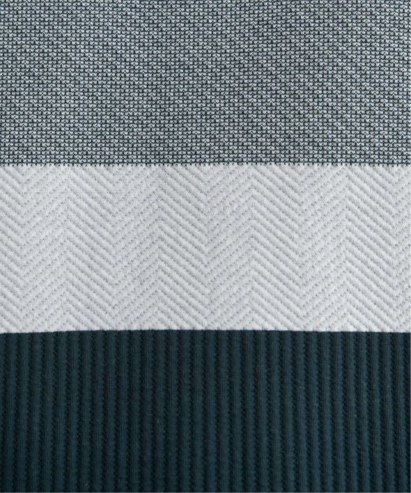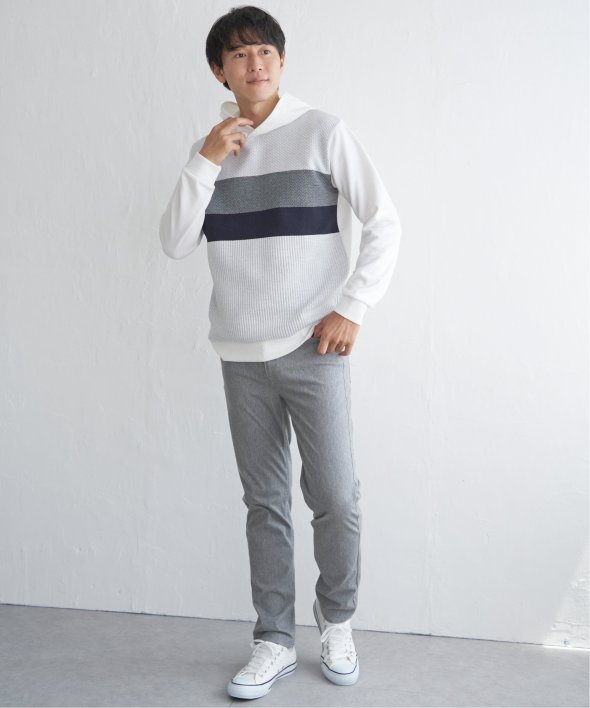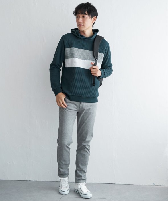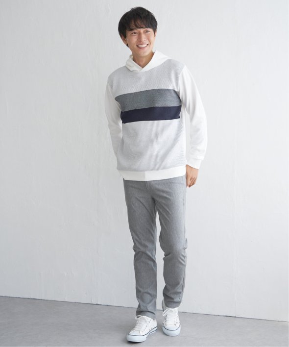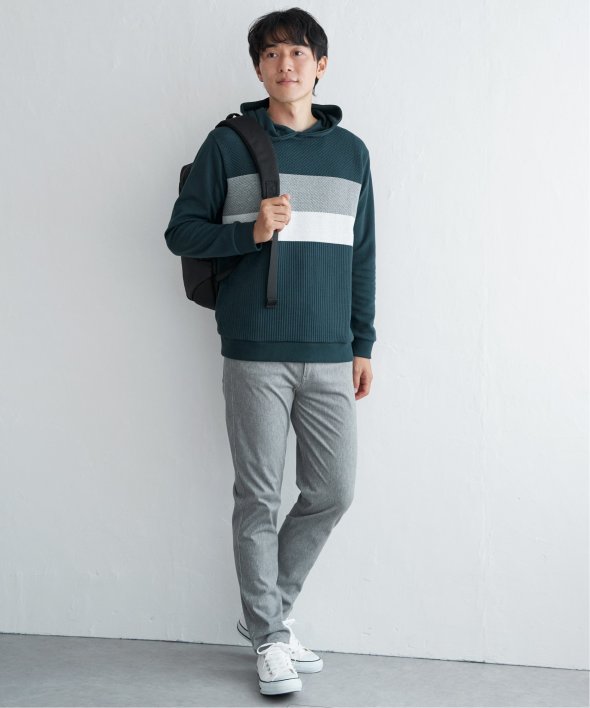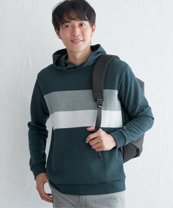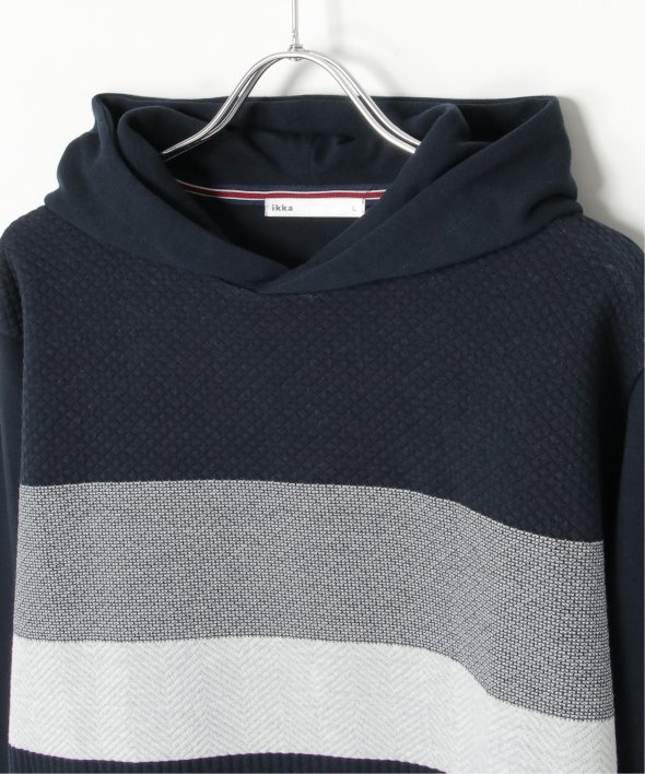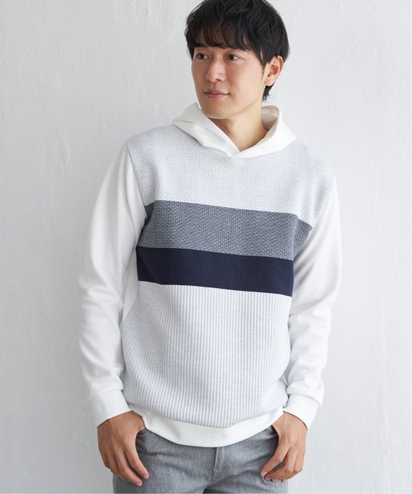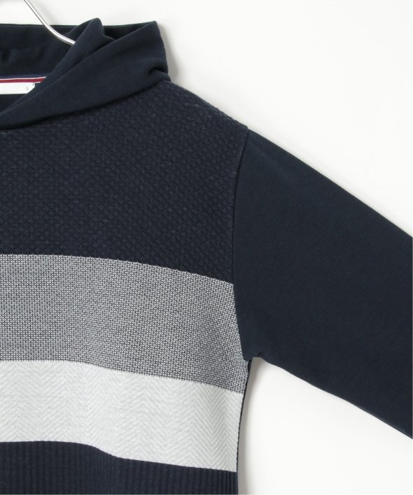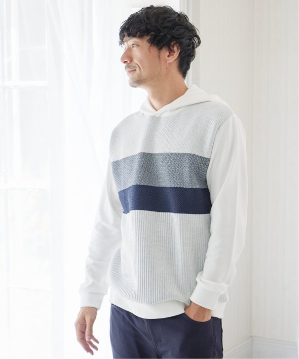異素材のミックスと、配色ボーダー柄が目を引くプルオーバーパーカー。