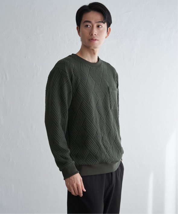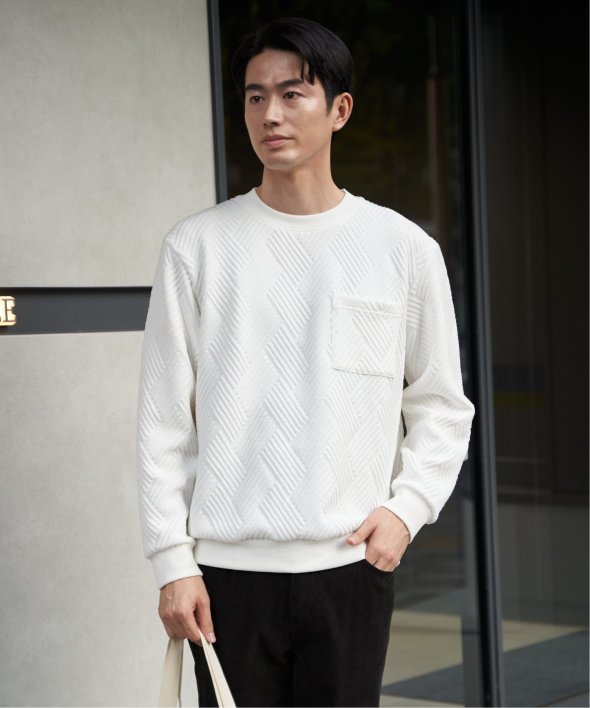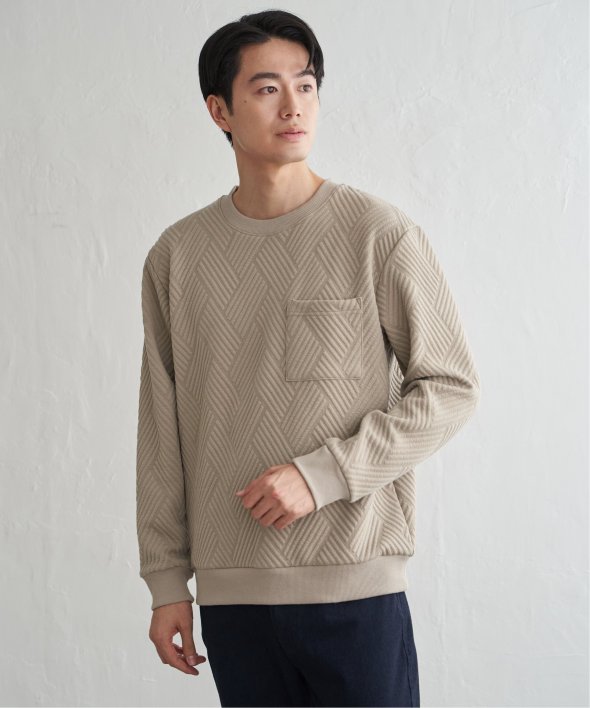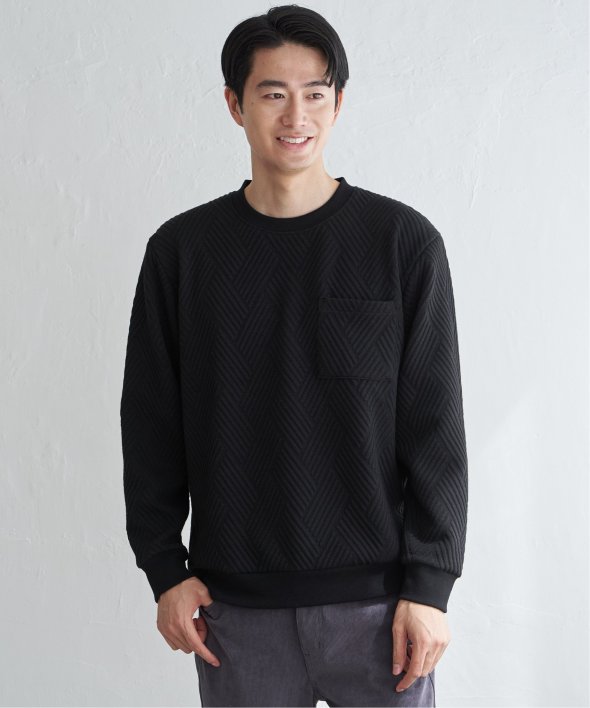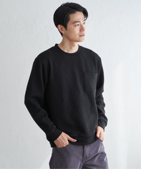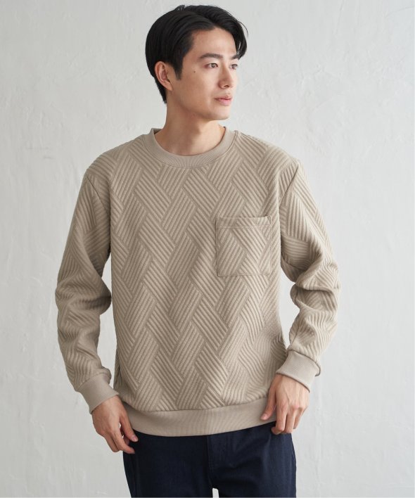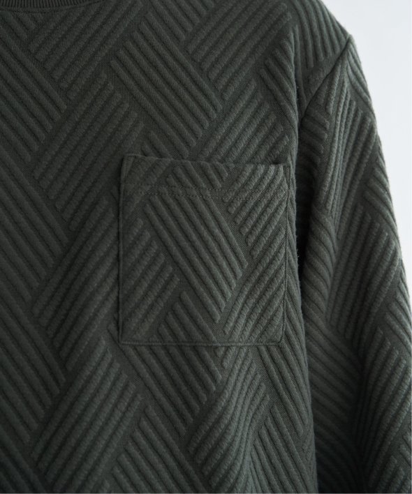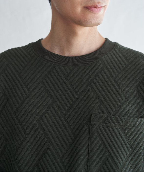 生地の表面の凹凸が特徴的な胸ポケット付きのクルーネックプルオーバー。