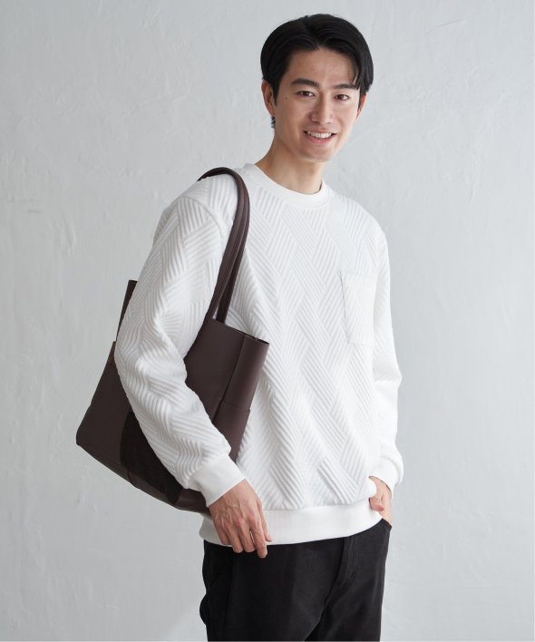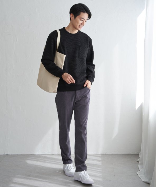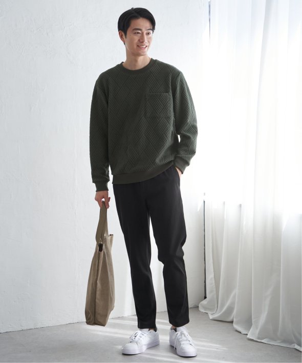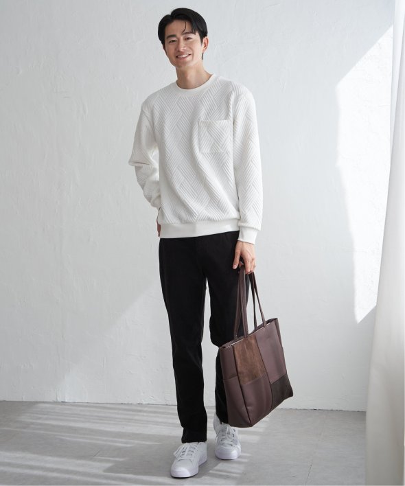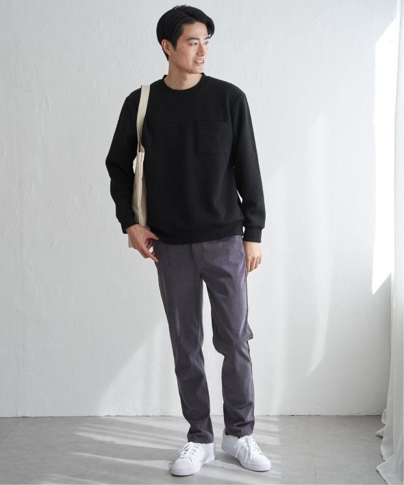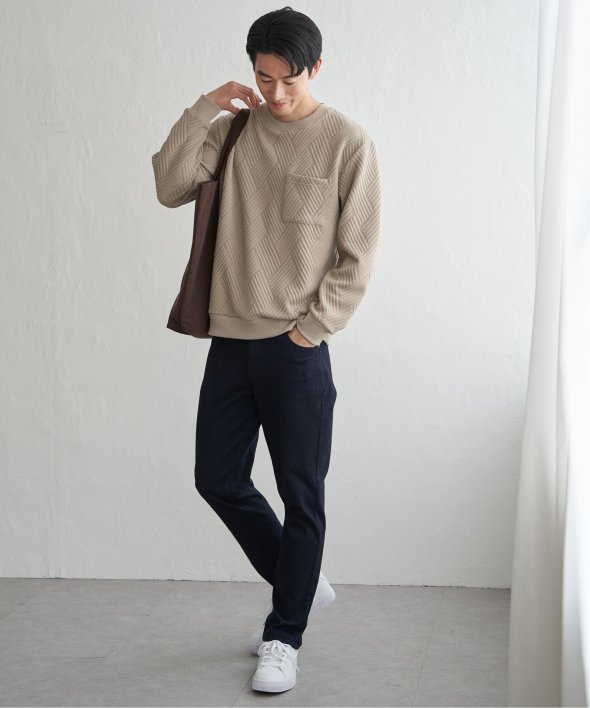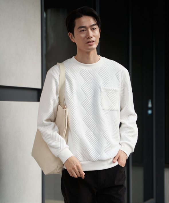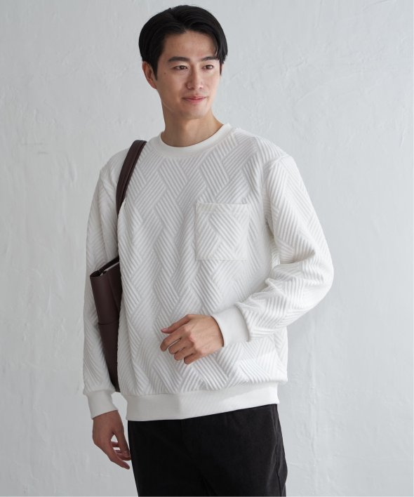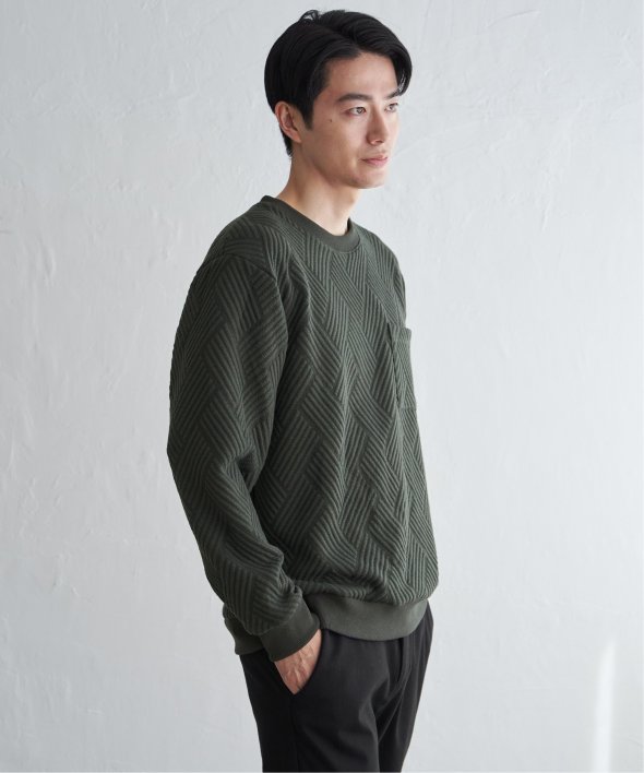 生地の表面の凹凸が特徴的な胸ポケット付きのクルーネックプルオーバー。