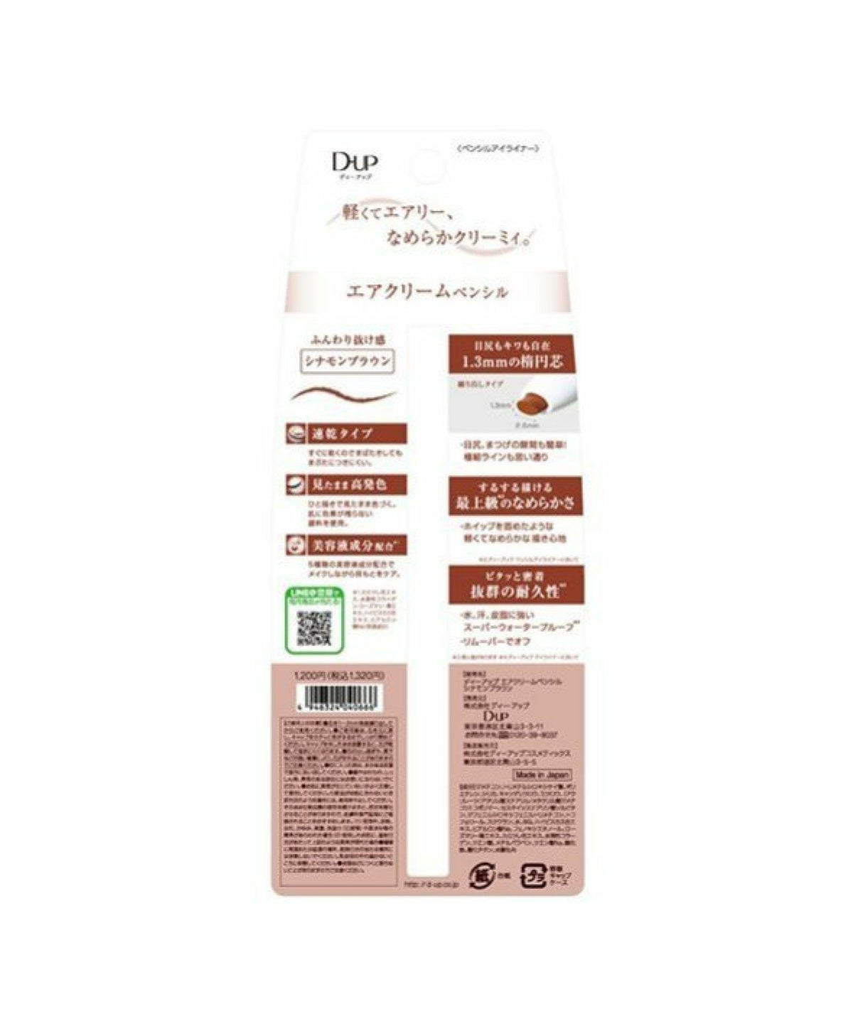 ROU 他の画像を見る 軽くてなめらかな描き心地のペンシルアイライナー 目尻もキワも自在。繰り戻せる楕円芯 ディー・アップ D.U.P エアクリームペンシル シナモンブラウン ディーアップ D-UP エアクリームペンシル シナモンブラウン ¥ 1,320 税込 カートに入れる お気に入りに登録する