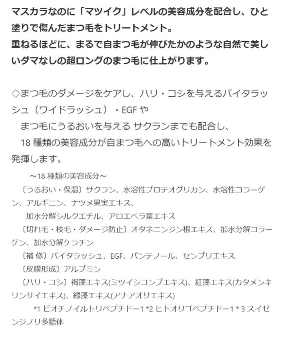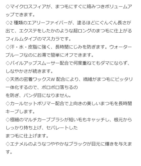 ■天然由来の密着ワックスW配合により、繊維がまつ毛にピッタリ一体化するので、ポロポロ落ちるのを防ぎ、パンダ目になりません。
