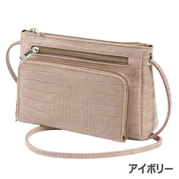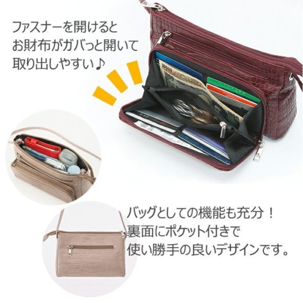 仕様:ファスナー開閉式、外側にファスナーポケット×2、お財布機能ファスナーポケット×1(内部にカード入れ×12、仕切りファスナーポケット×1、オープンポケット×2、札入れ×2)