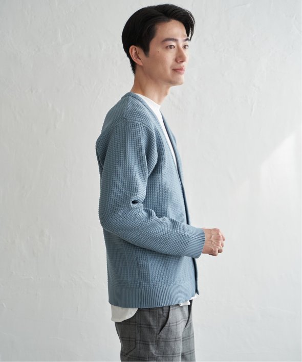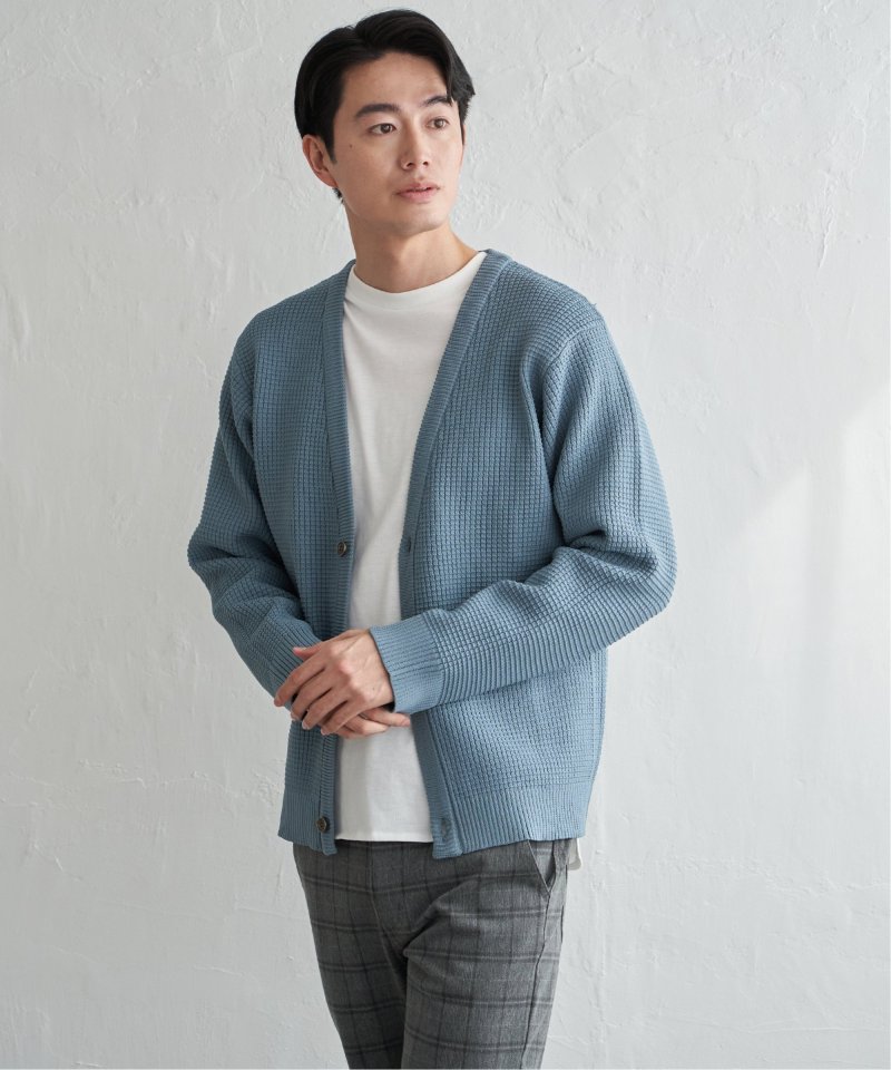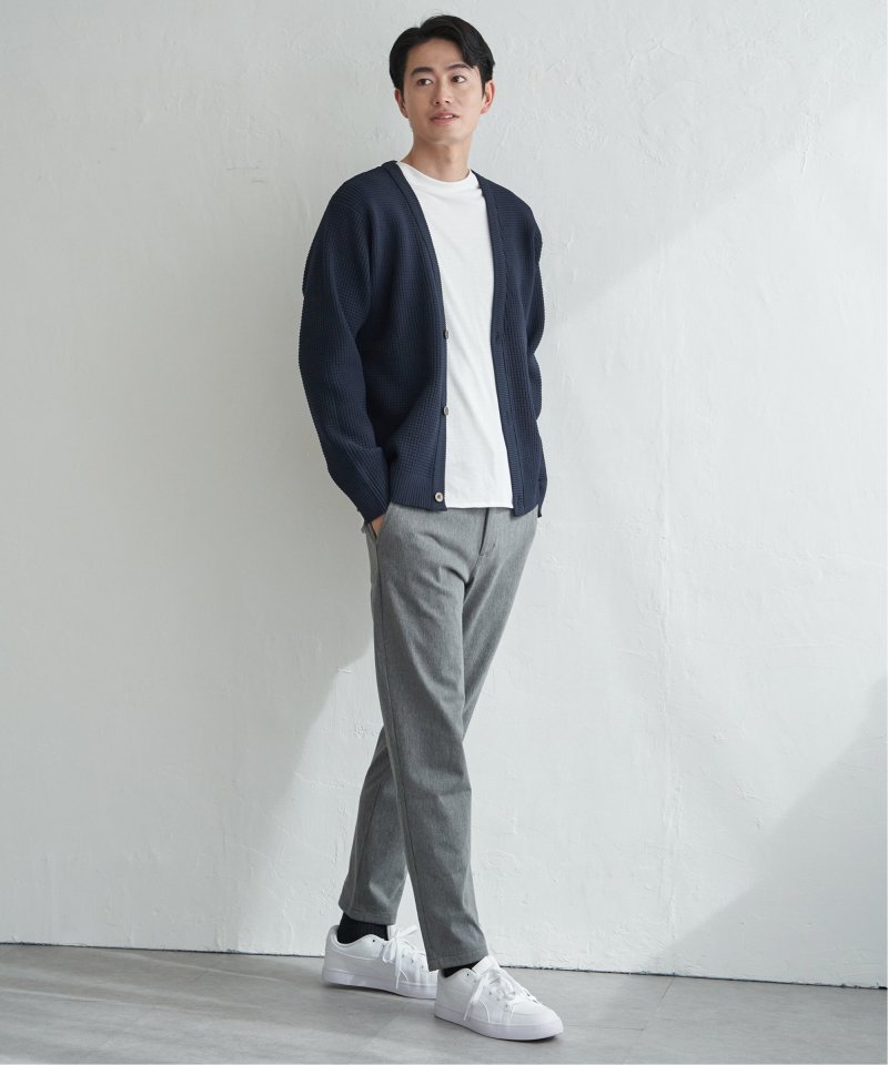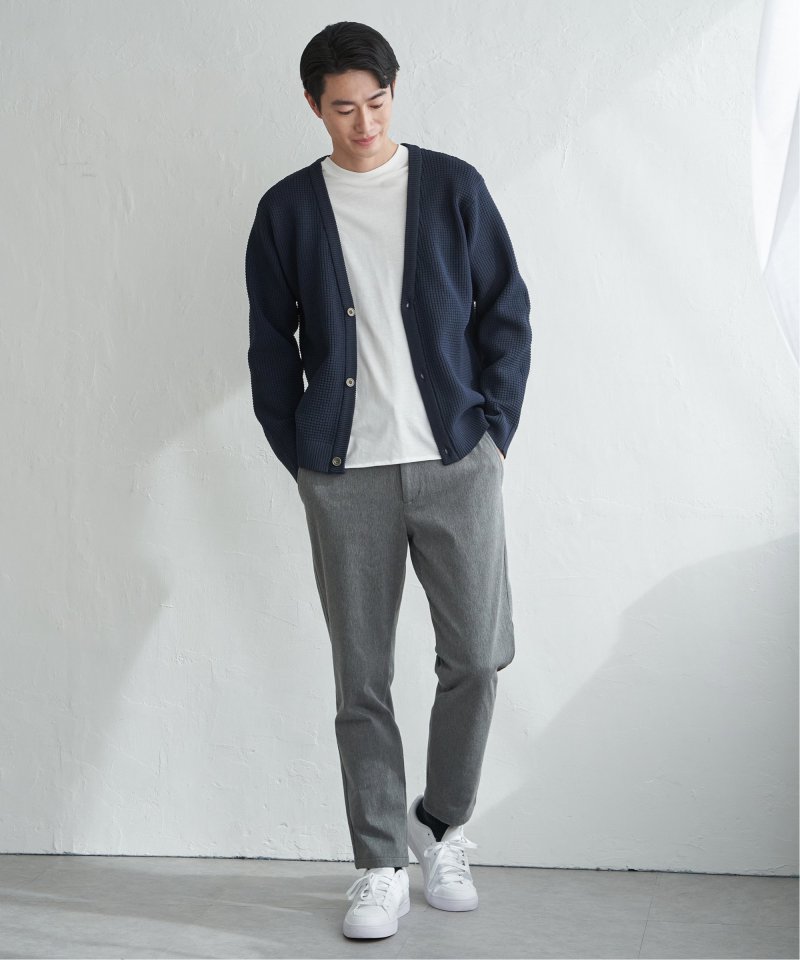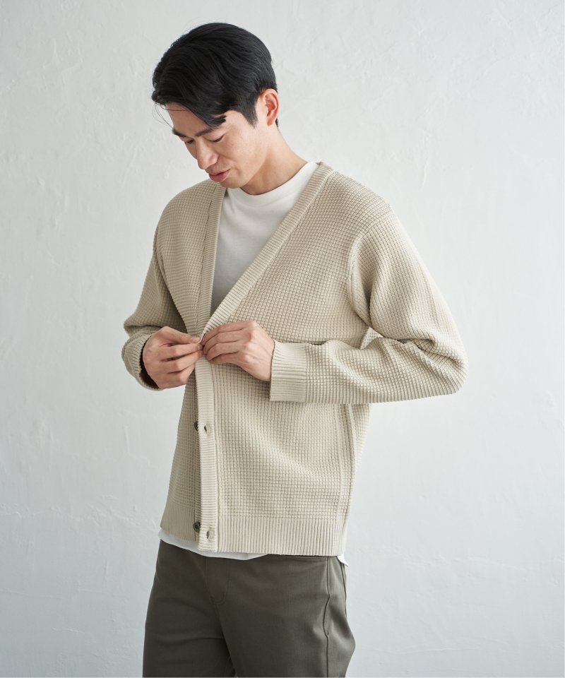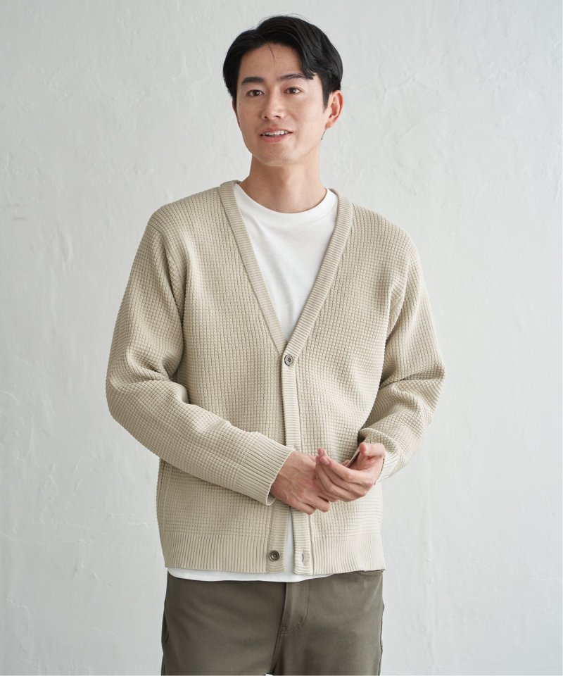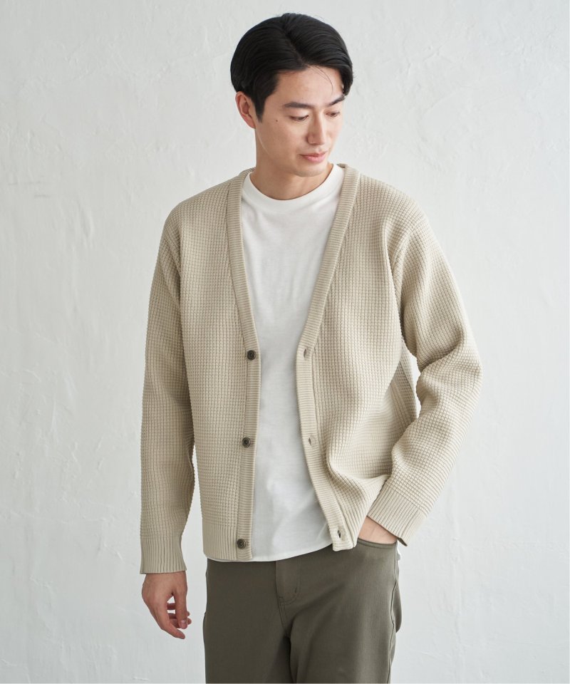 軽量なポリエステル素材で仕立てたニットカーディガンと、なめらかな天竺素材の長袖Tシャツを組み合わせたセットアイテム。