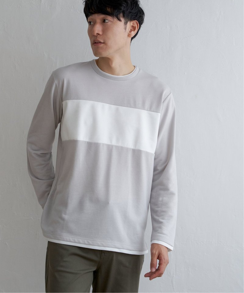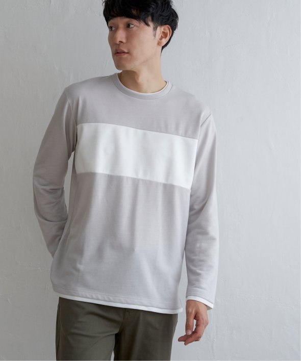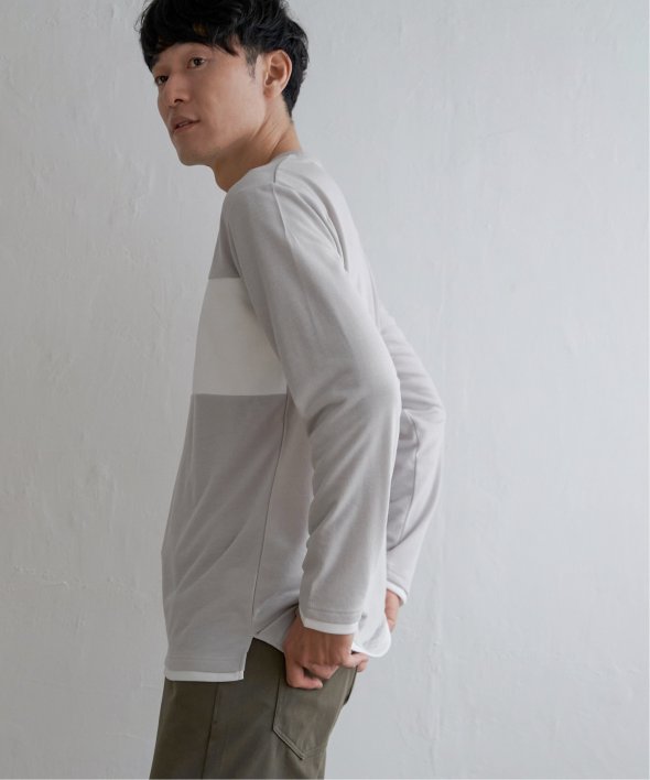 胸部分を異素材で切り替えた長袖クルーネックT。