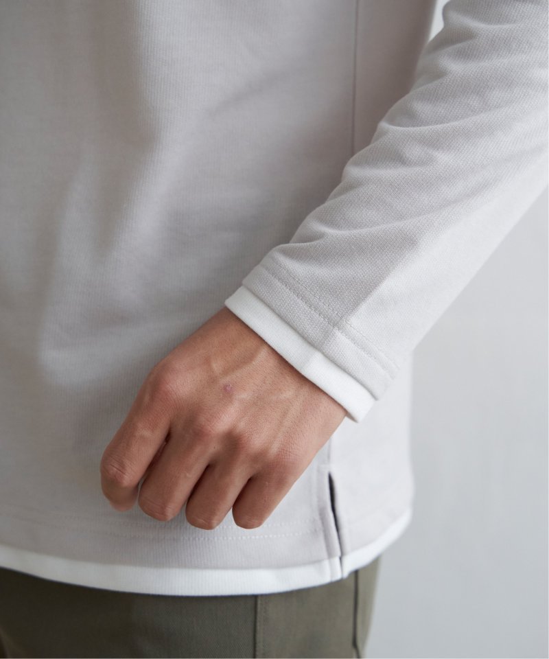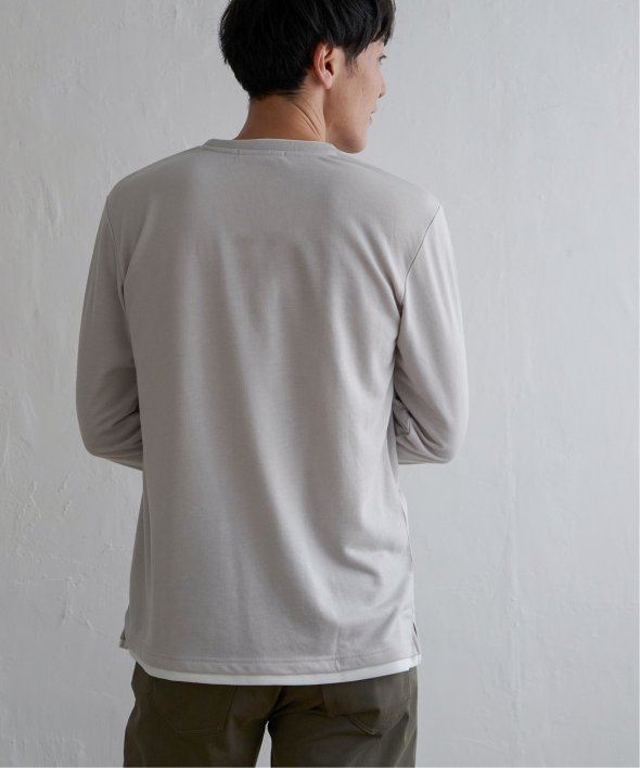異素材切り替えデザインの長袖クルーネックT。