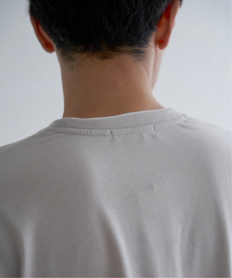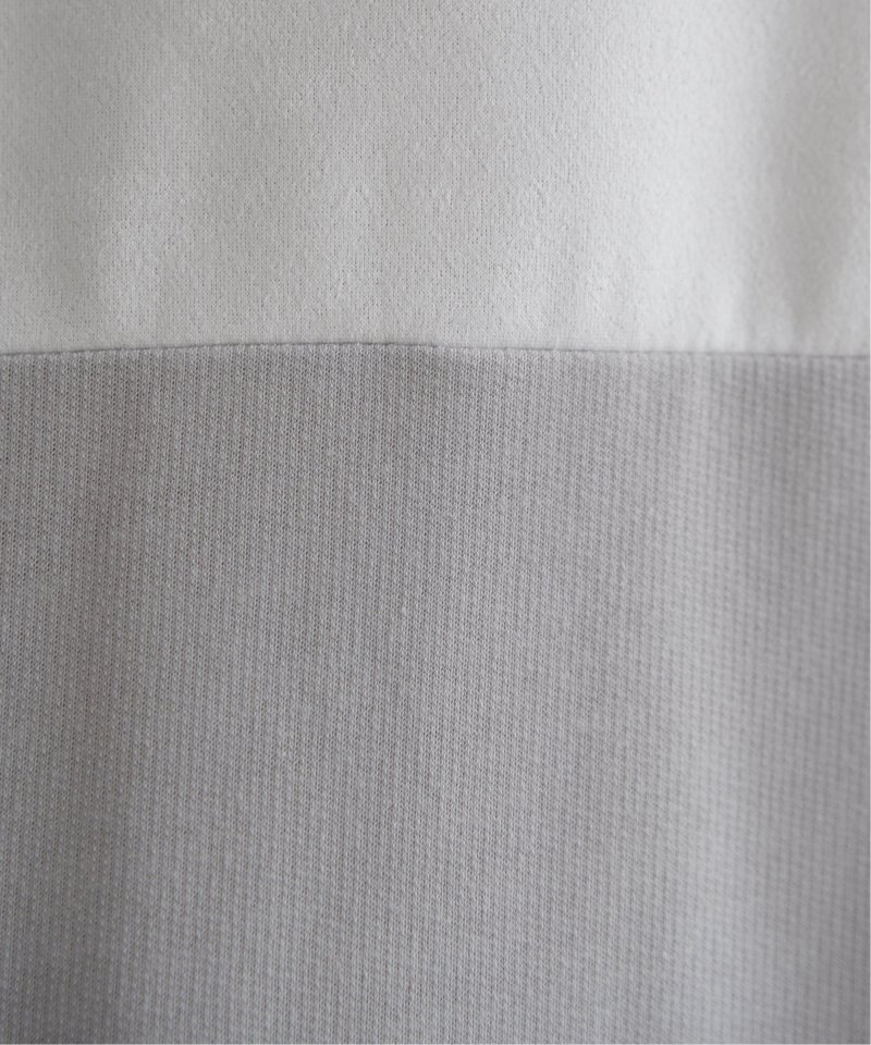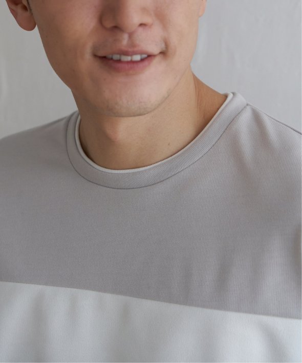 Tシャツにしてはやや厚手のミニ裏毛を使用し、切り替え部分に別地のフェイクスエード素材を配色使いで使用しています。
