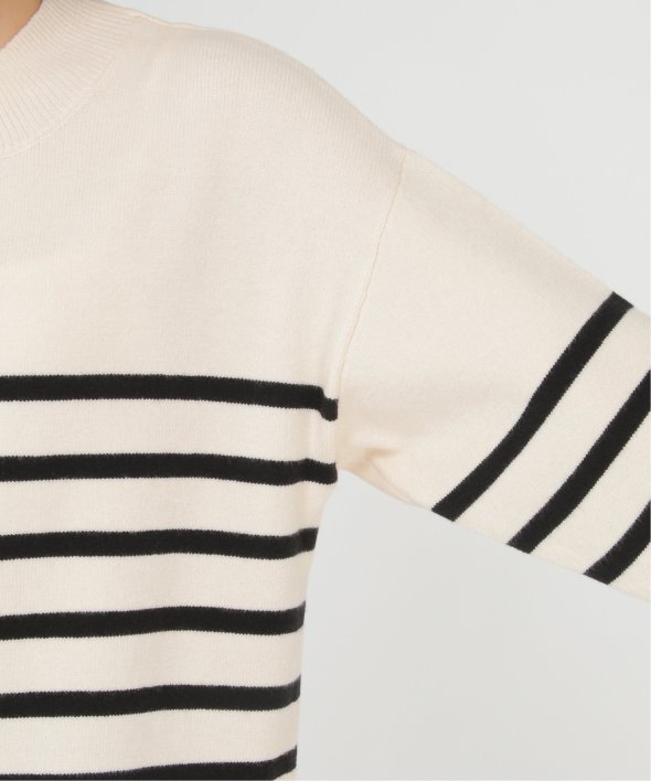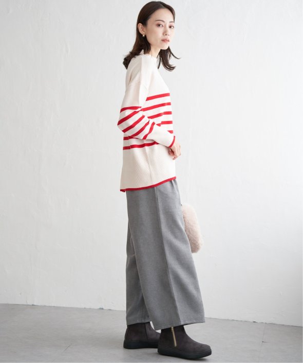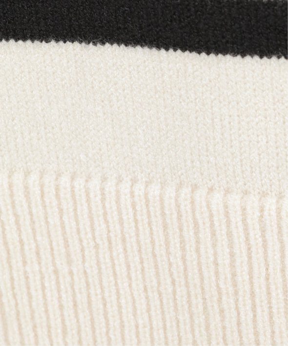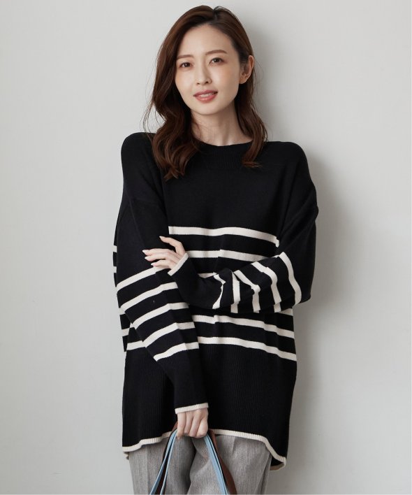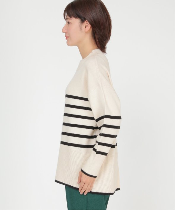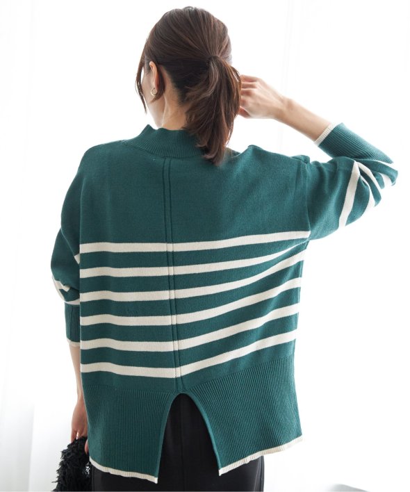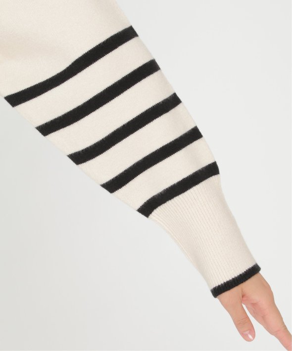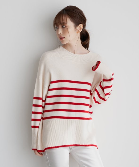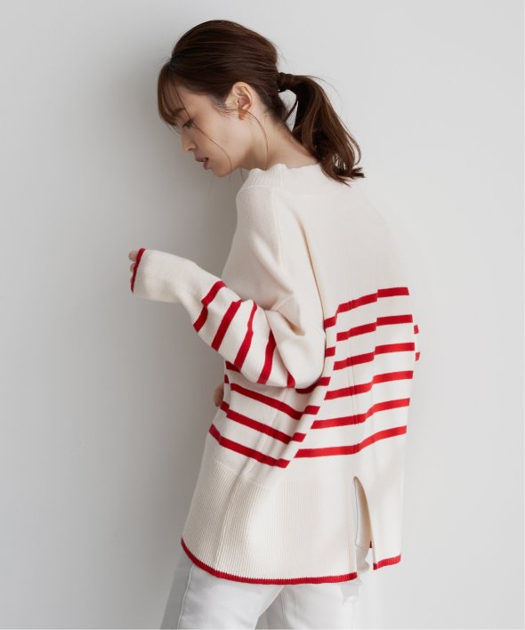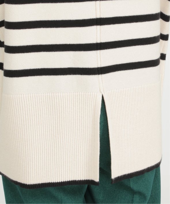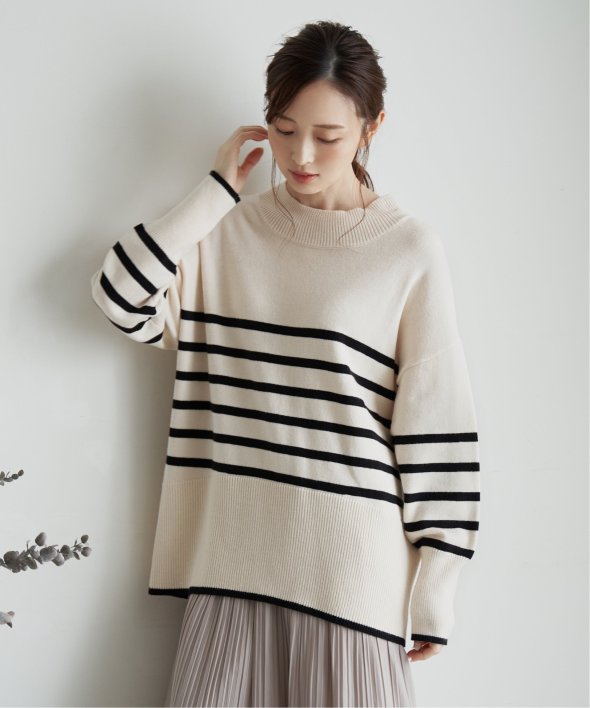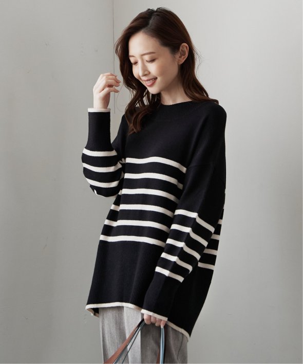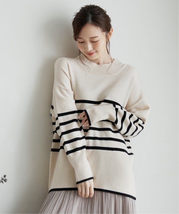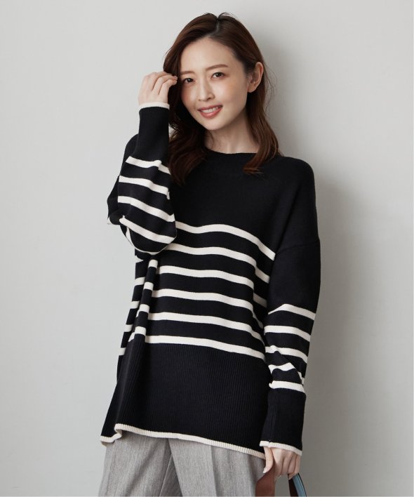 裾と袖口に配色デザインのあるボーダーニット。