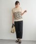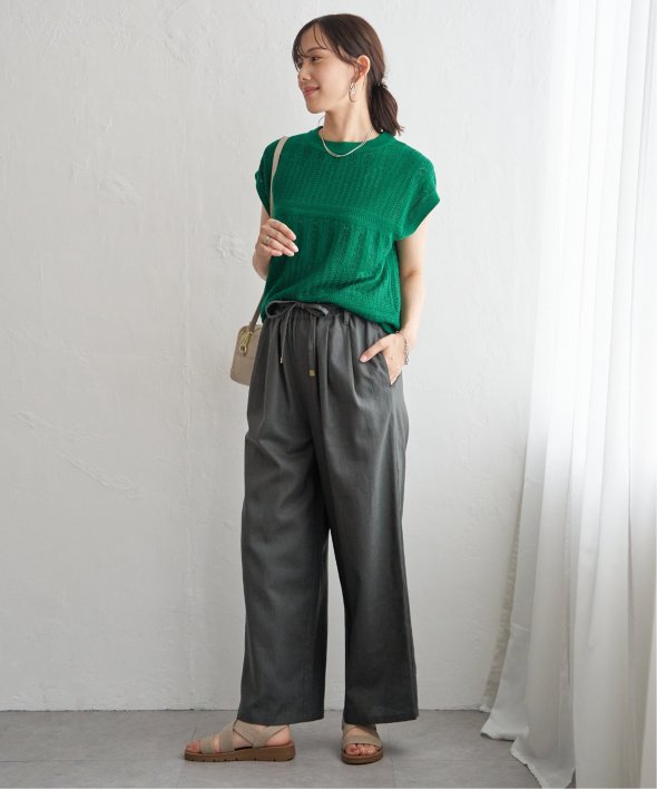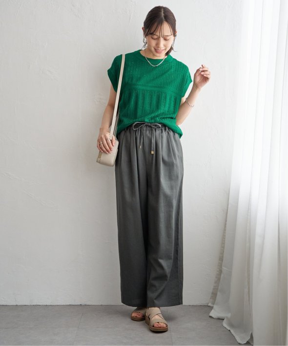 イージーなワイドシルエットのパンツに合わせて甘さをおさえたコーディネート。
