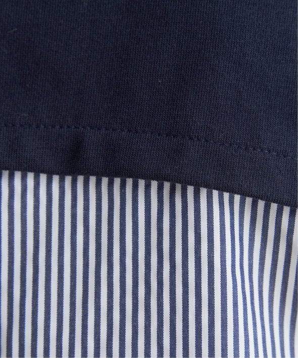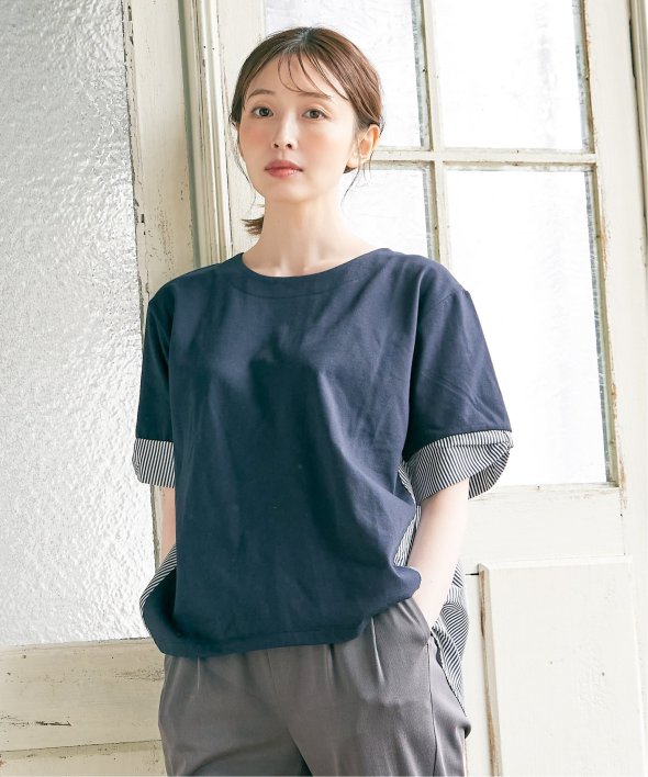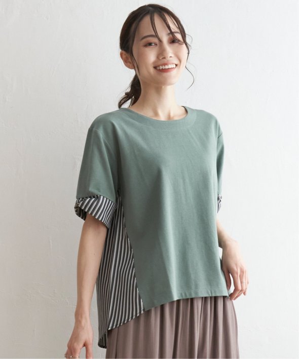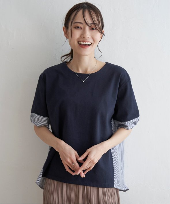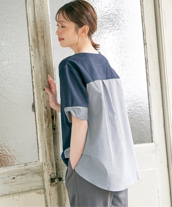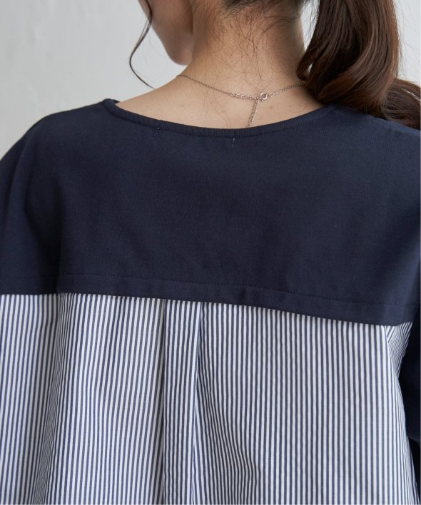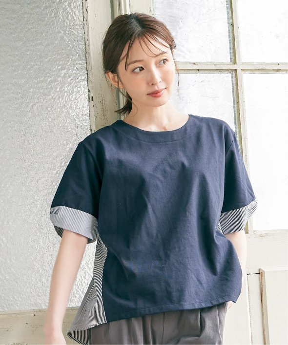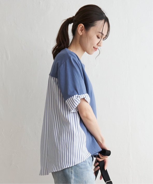 ほどよいカジュアル感がありながら、きれいめなカットソーとストライプシャツ地のコンビ素材。