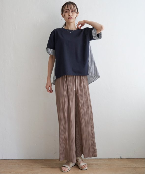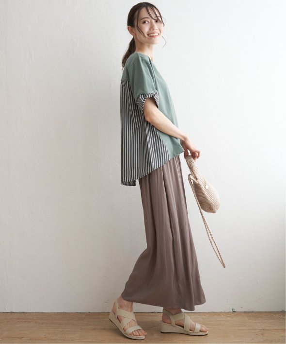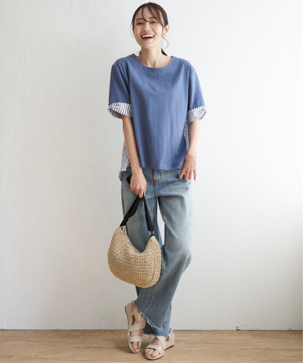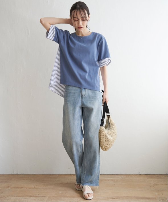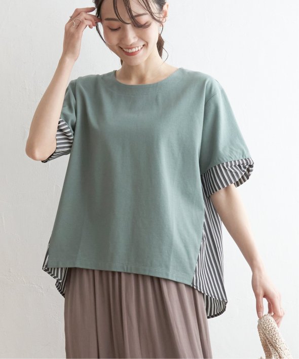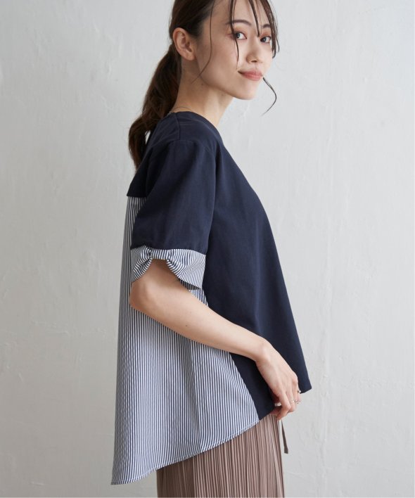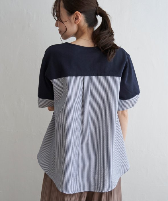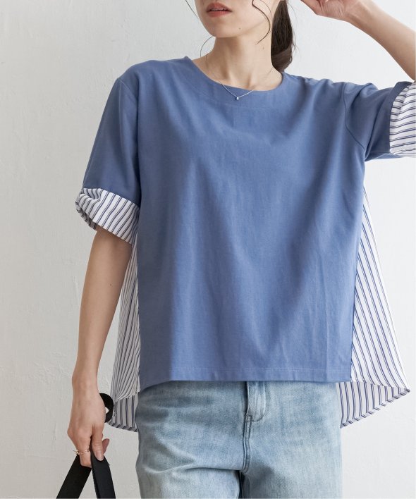 ほどよいカジュアル感がありながら、きれいめなカットソーとストライプシャツ地のコンビ素材。