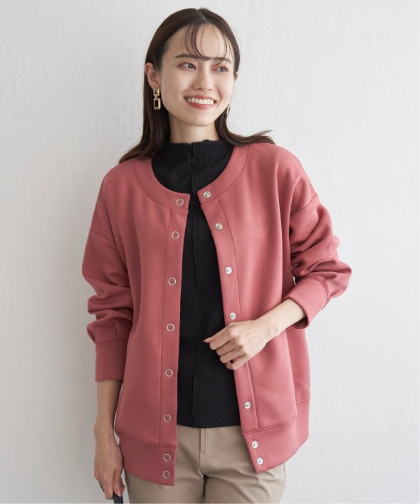 お尻が隠れるミドル丈のカーディガンで、中間アウターと