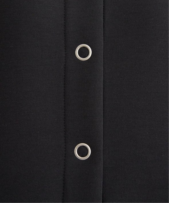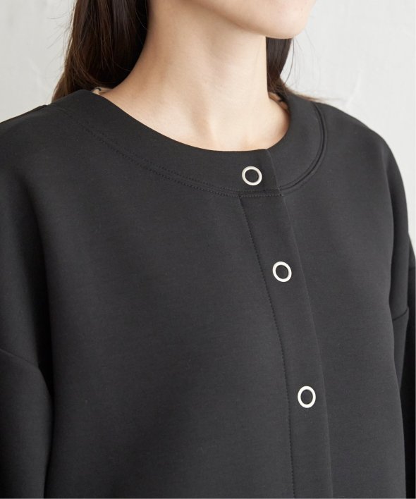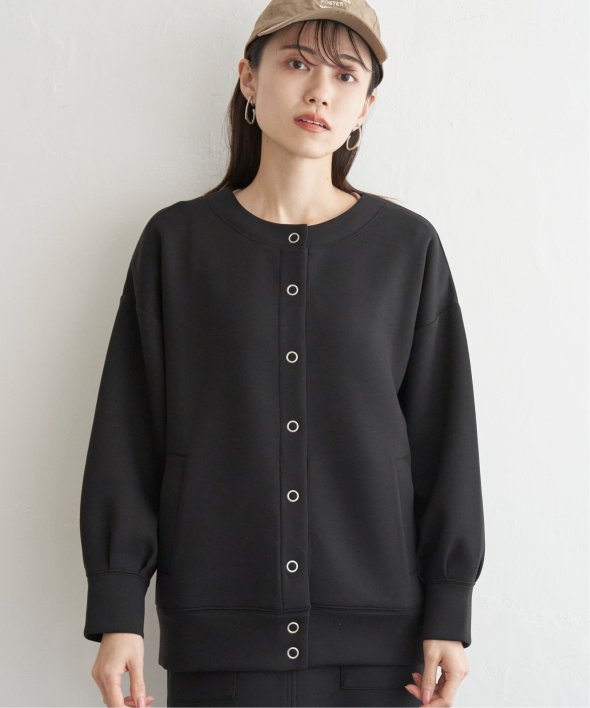 大きめのリングドットがついたノーカラーのミドル丈カーディガン。