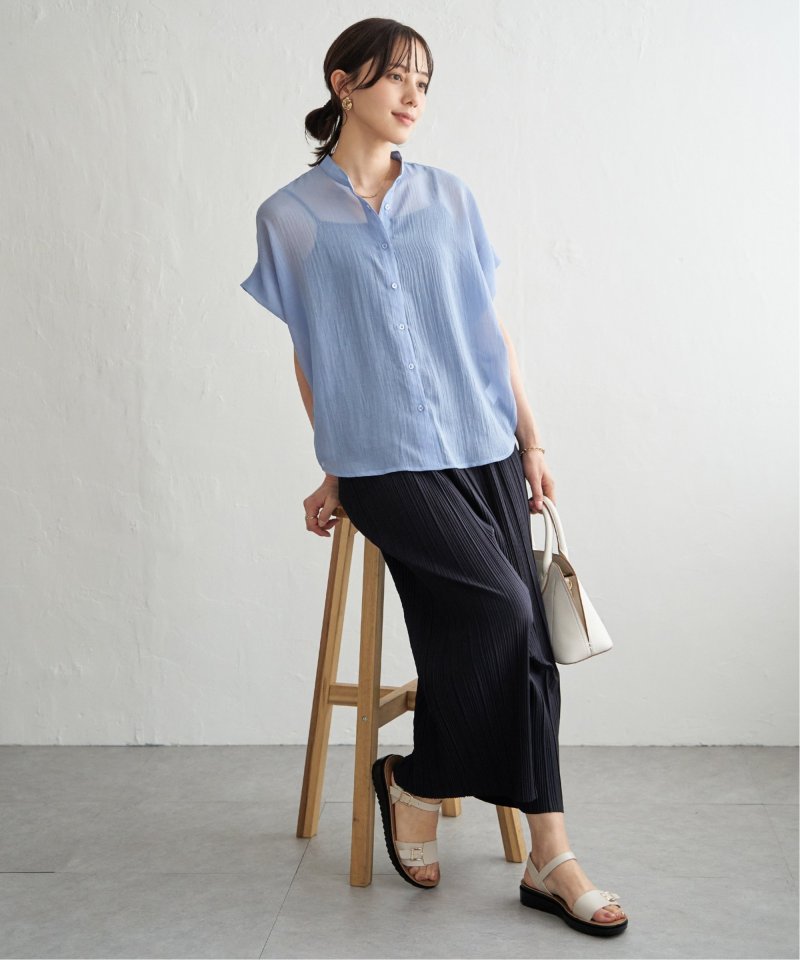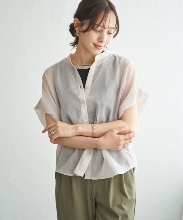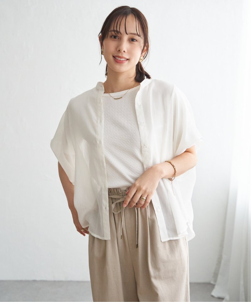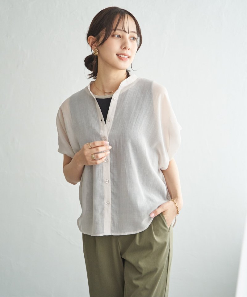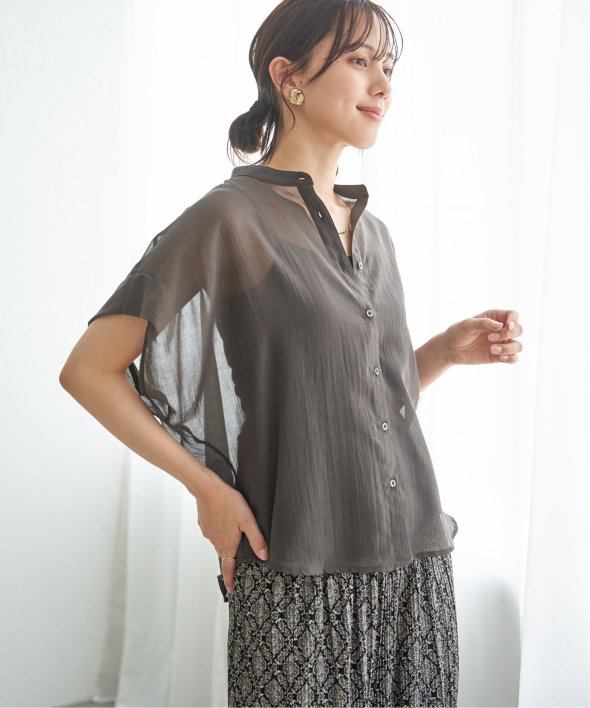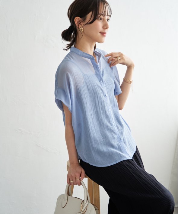 ほどよいシアー感が魅力のブラウスを、着こなしやすいドルマンシルエットできれいめ見えするデザインに。