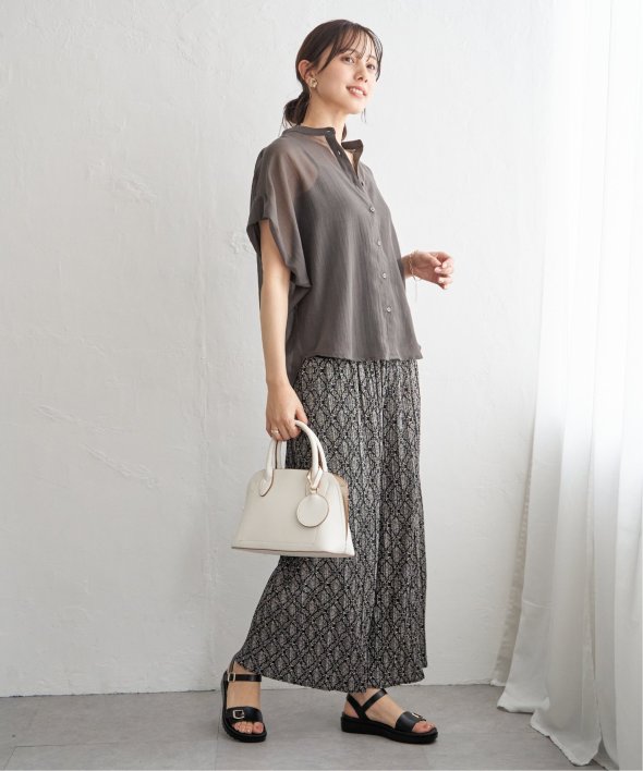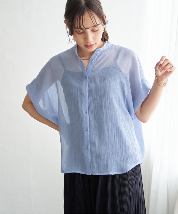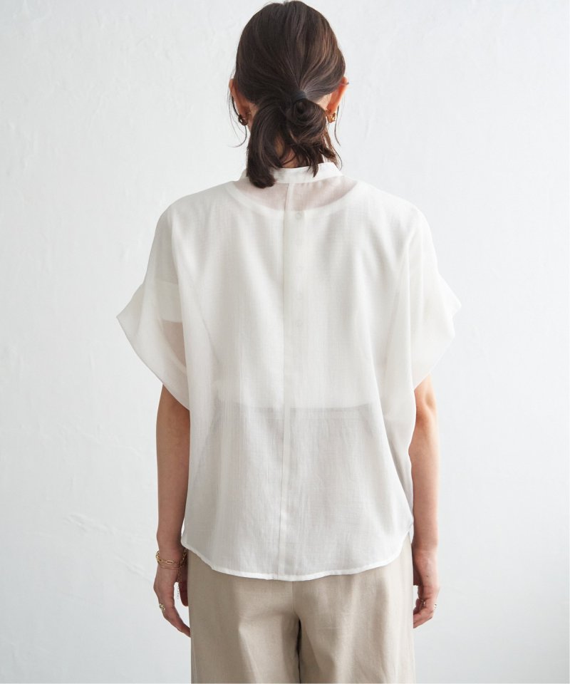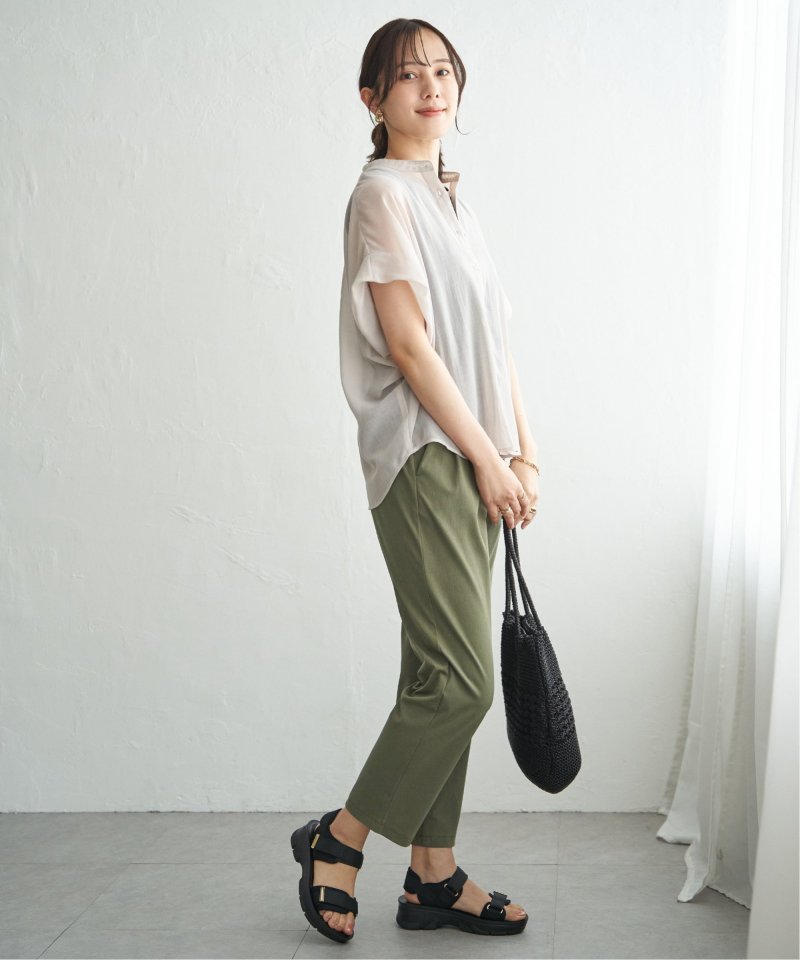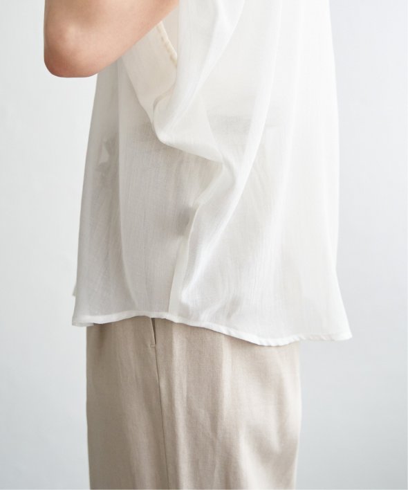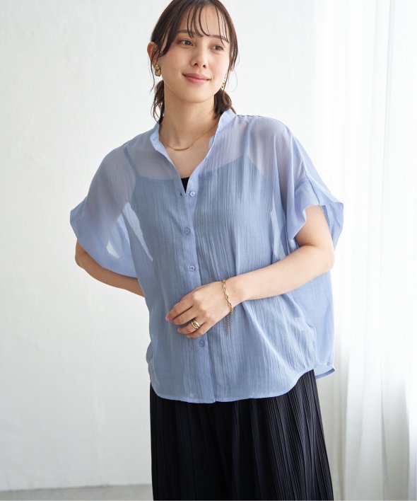 ほどよいシアー感が魅力のブラウスを、着こなしやすいドルマンシルエットできれいめ見えするデザインに。