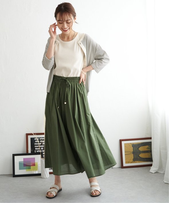 たっぷり贅沢に生地を使っているのでフレアシルエットが可愛いスカート風ワイドパンツ。
