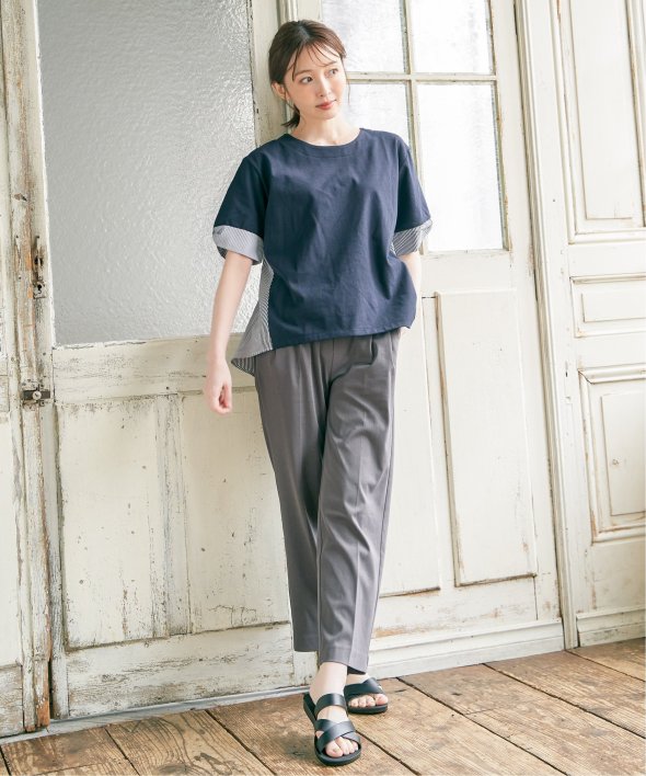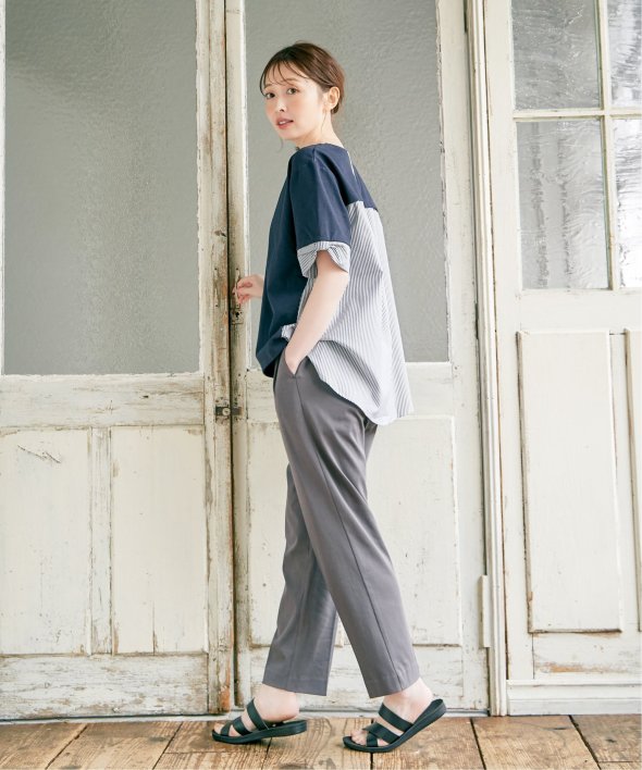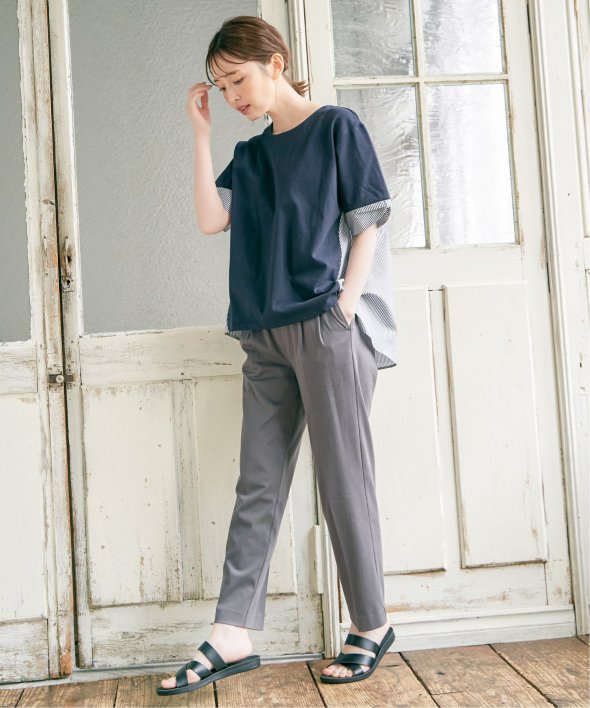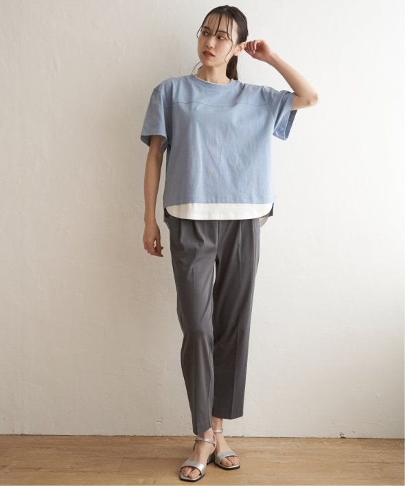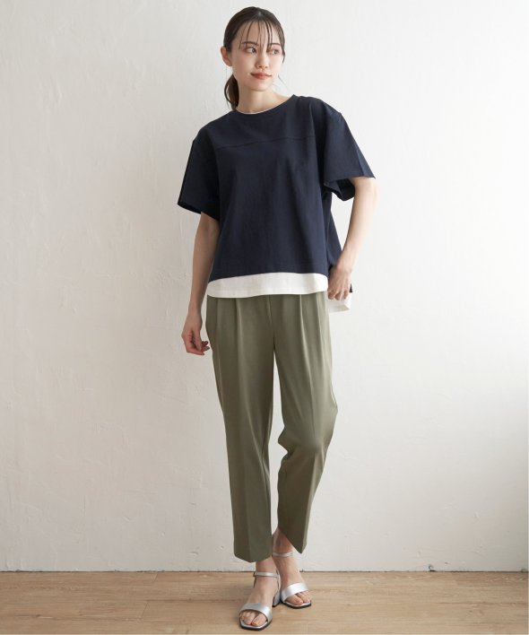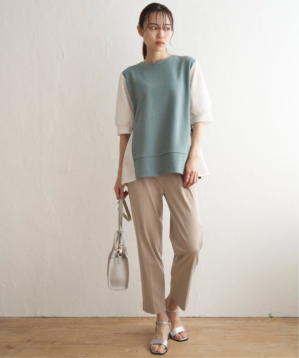 ウエストのタックで気になるお腹周りもしっかりとカバーしながら、伸縮性のある布帛見えカットソーでアクティブな動きも◎