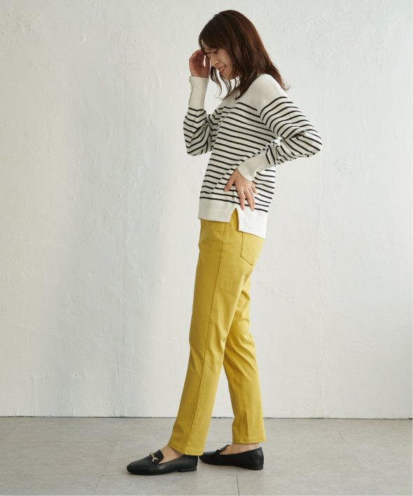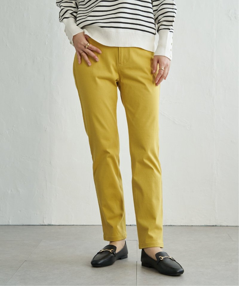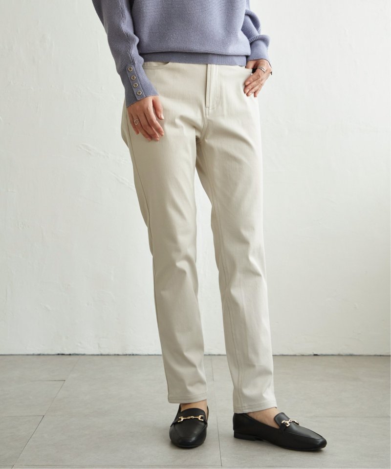 縦横に伸びる快適ストレッチ素材を使用したストレートパンツ。すっきりとしたスリムストレートシルエットは、脚のラインをきれいに見せながら、窮屈さを感じさせないのが魅力。「ラクしてきれい」を叶える、頼れる定番パンツです。【素材】伸縮性があり着心地のいいGOKU楽カット素材を使用。ツイル見えする表面感でカジュアルな印象です。【デザイン】フロントファスナー開き。5ポケットのベーシックデザイン。ベルト裏にプリントがNEW。【ikkaポイント】・まるで布帛!のパンツに見えますが、カット素材でタテヨコに伸縮性があり、動きやすくて快適な素材を使用。・新シルエット。膝から裾にかけて身体に張り付かないようにし、脚が真っ直ぐにスッキリ見えするシルエット。 [洗濯方法]洗濯の際はネットを使用してください