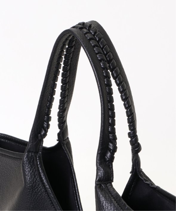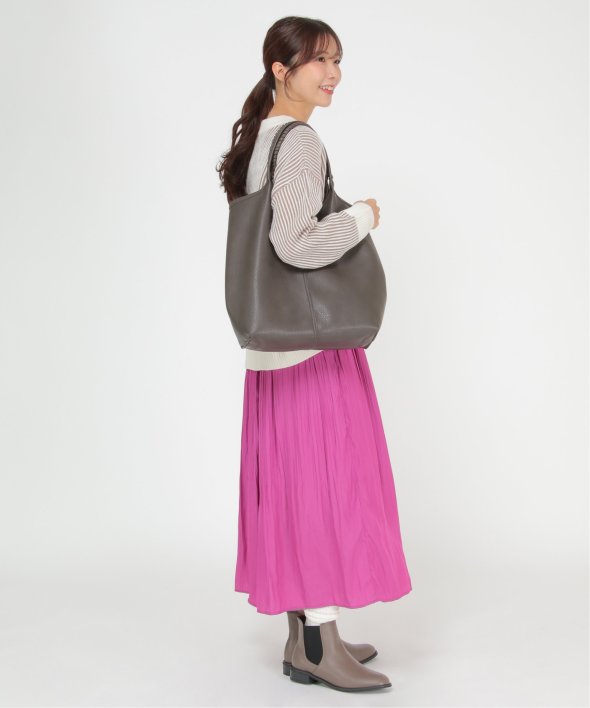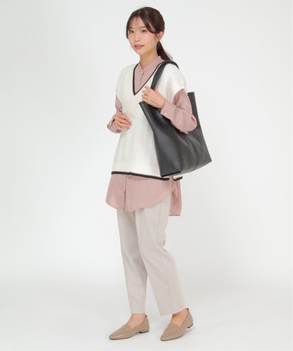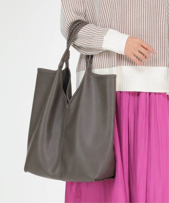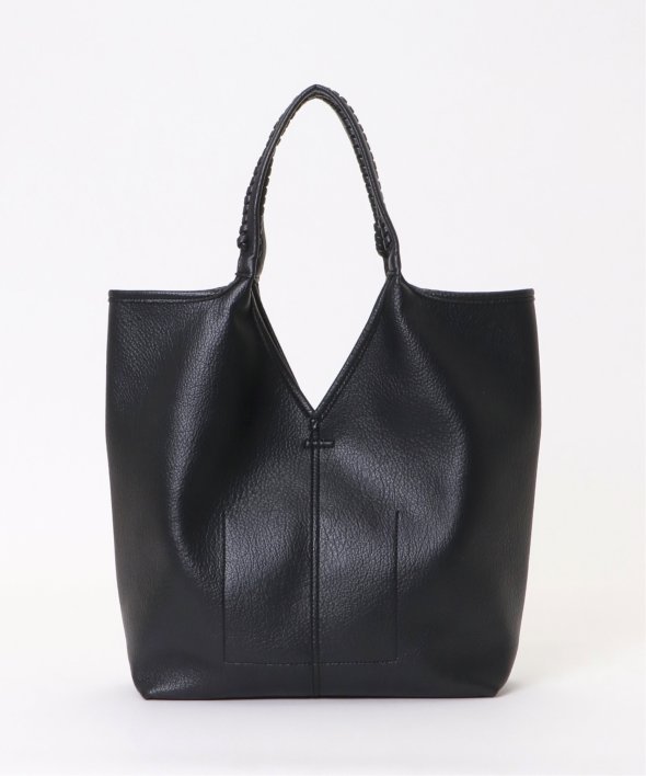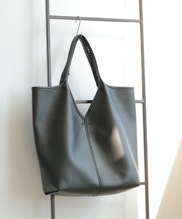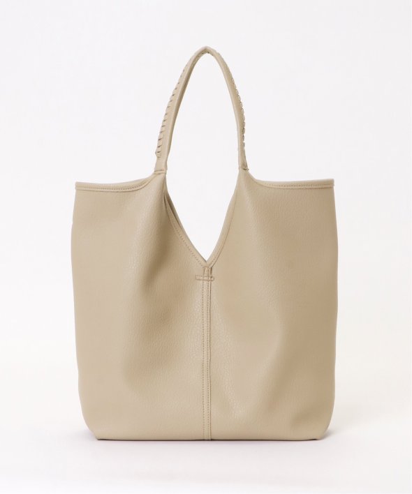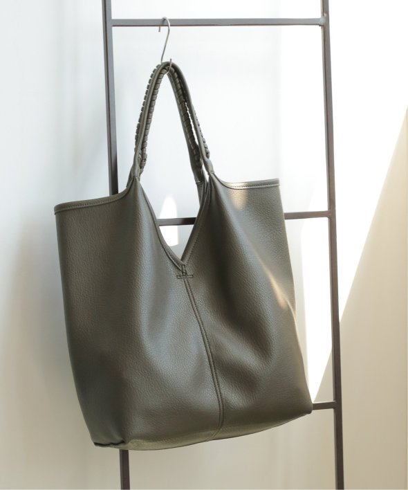 持ち手のかがりステッチや、本革風のフェイクレザーなど、シンプルながらもワンテクの効いたトートバッグ。
