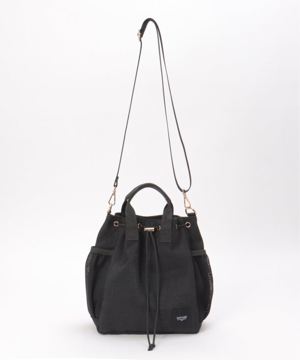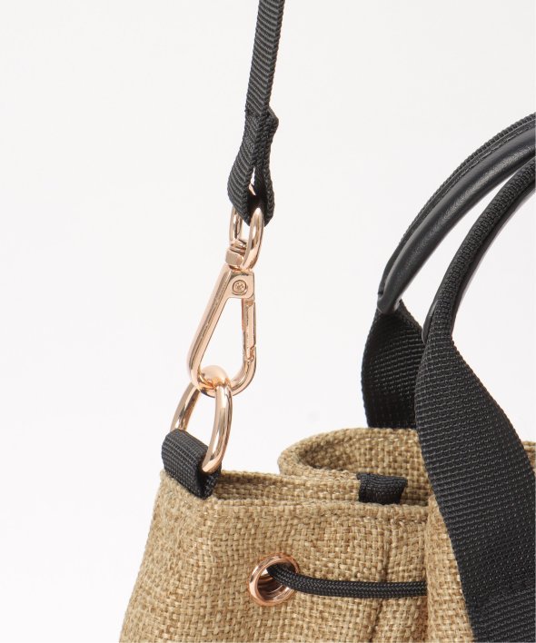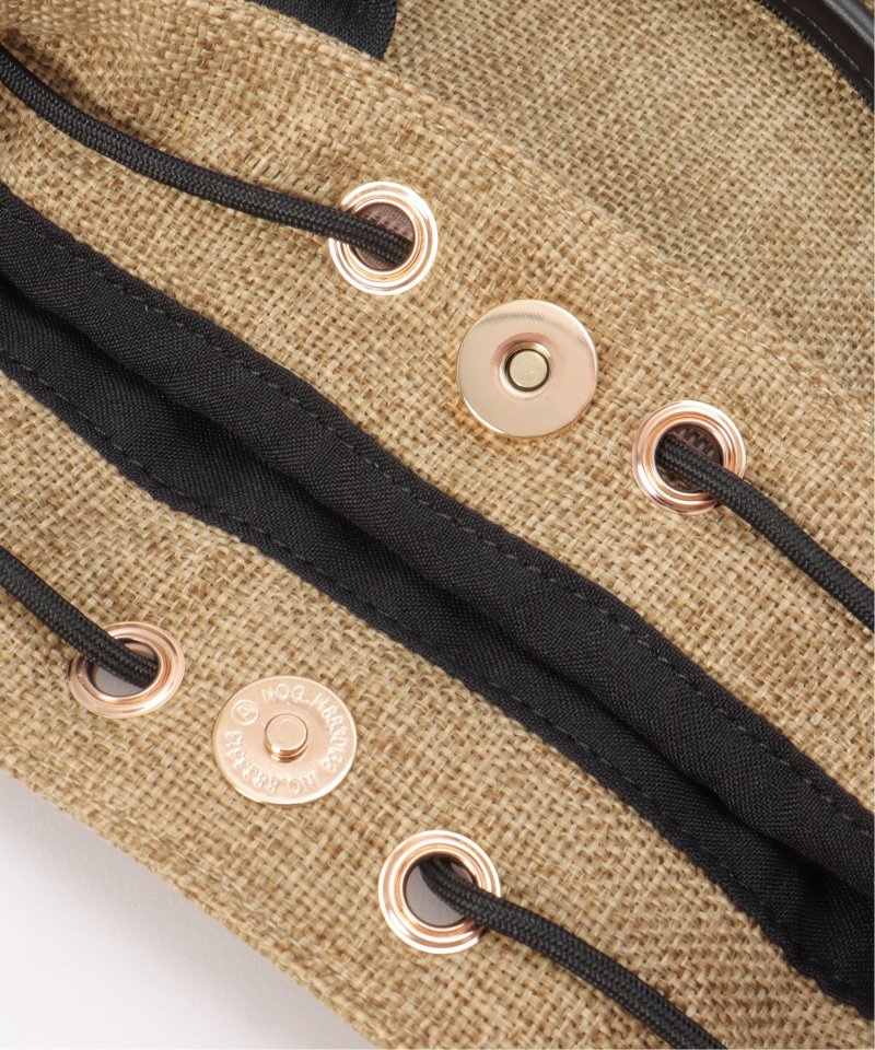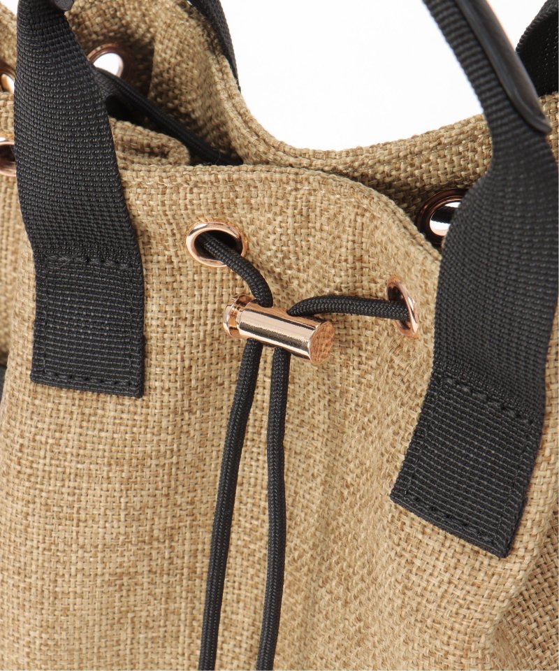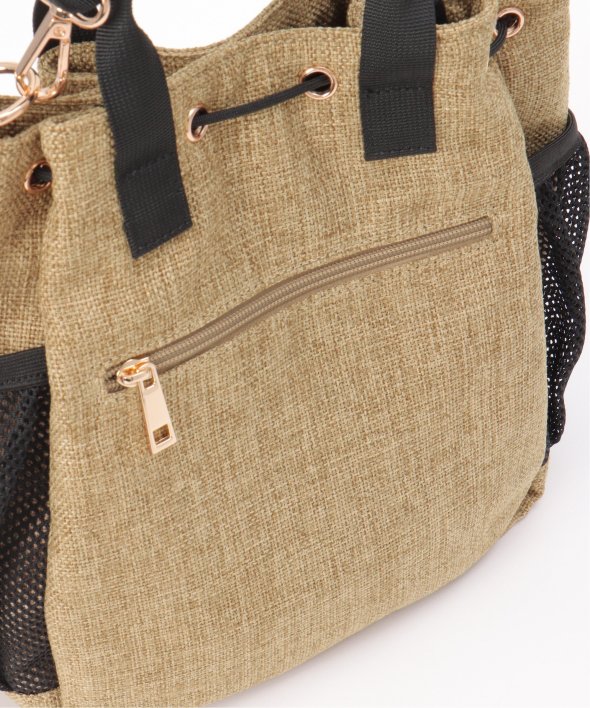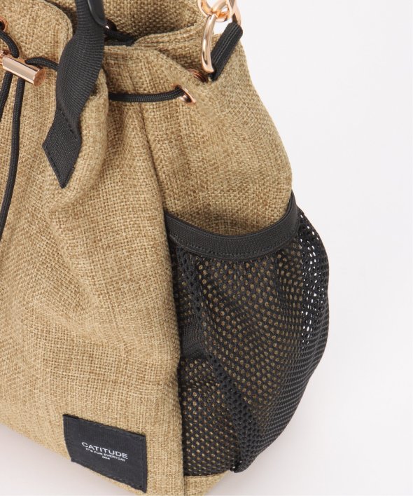 ポリエステルジュート生地にメッシュ素材のポケットが付いた、さり気ないスポーティーさのある2WAYバッグ。