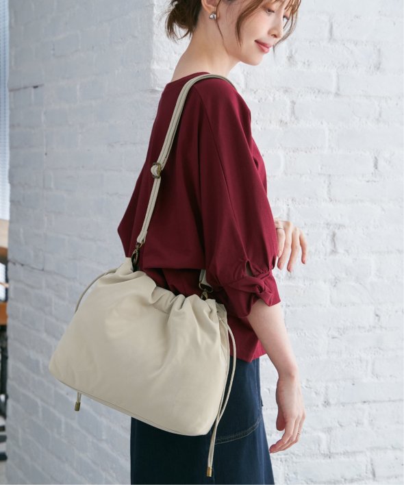 【雑誌InRed(宝島社)11月号掲載】ふんわりとしたフォルムが目を引く巾着ショルダーバッグ。巾着型の開け口は中身が見えにくく実用性も◎長さ調整できるショルダーで、デイリーはもちろん、ちょっとしたお出かけにも活躍してくれるアイテムです。【素材】滑り感あるヌバック調の合成皮革。【デザイン】中綿入りの巾着ショルダーバッグです。【ikkaポイント】・軽量 約250グラム・ショルダーを取り外して巾着持ち可能な2WAY仕様・中綿入りで身体に沿うソフトなタッチ・隠しマグ仕様、凹凸なくストレスフリーの使い心地