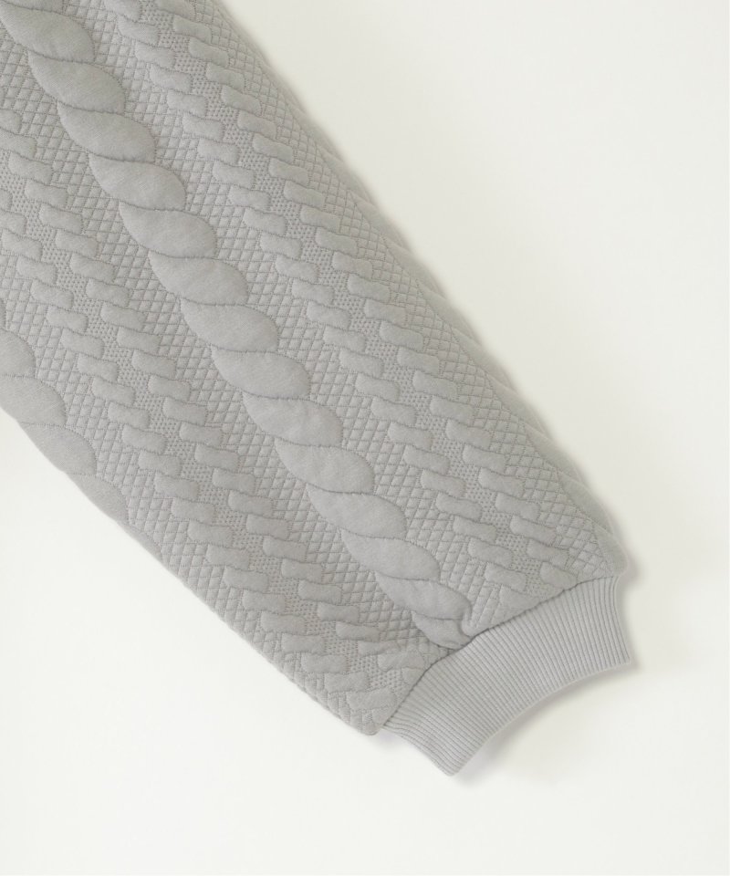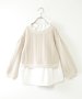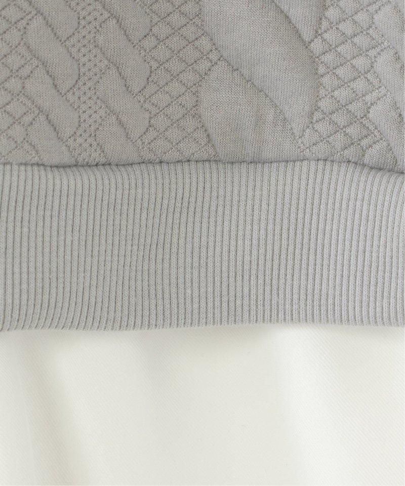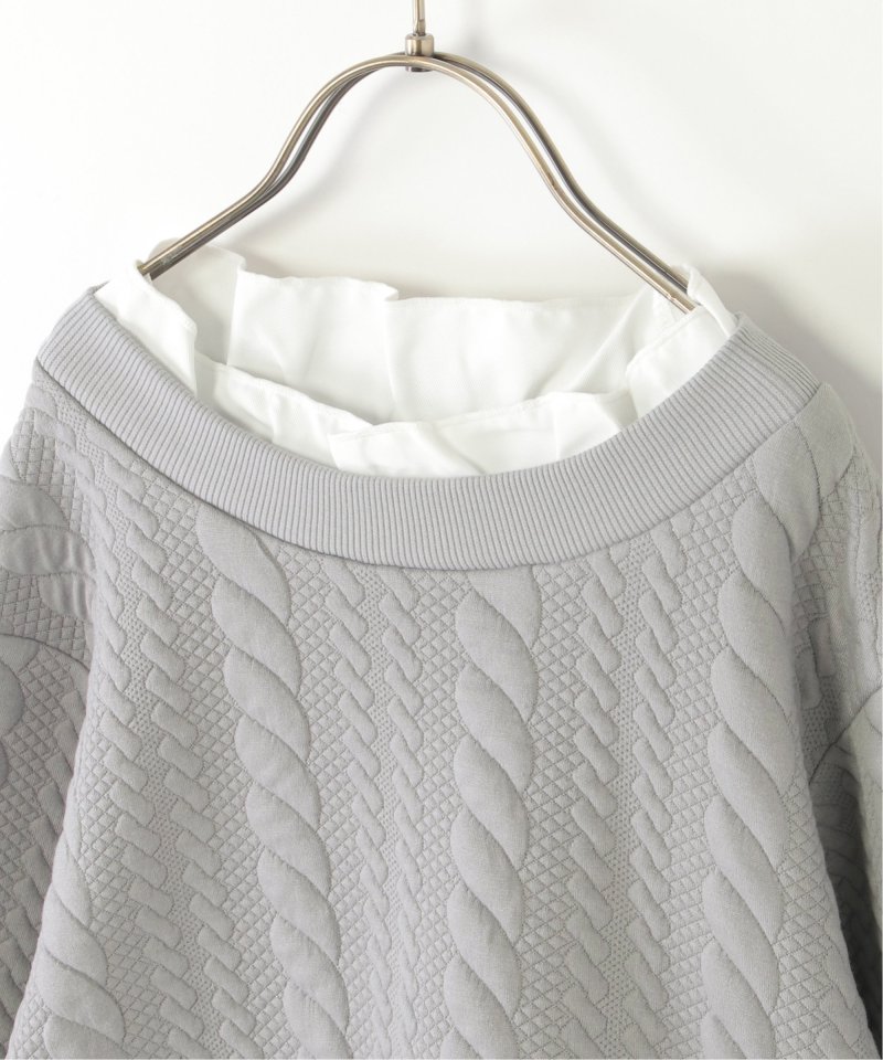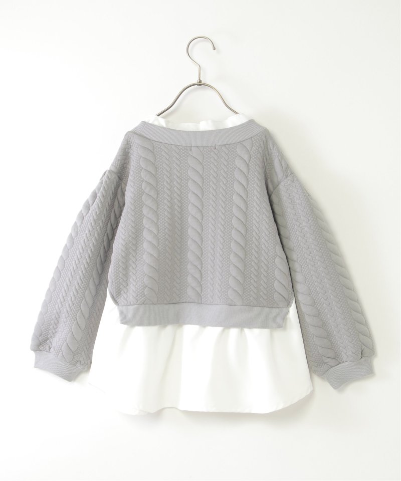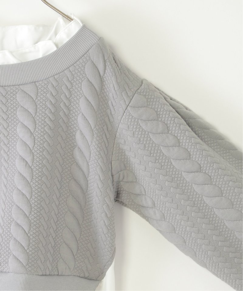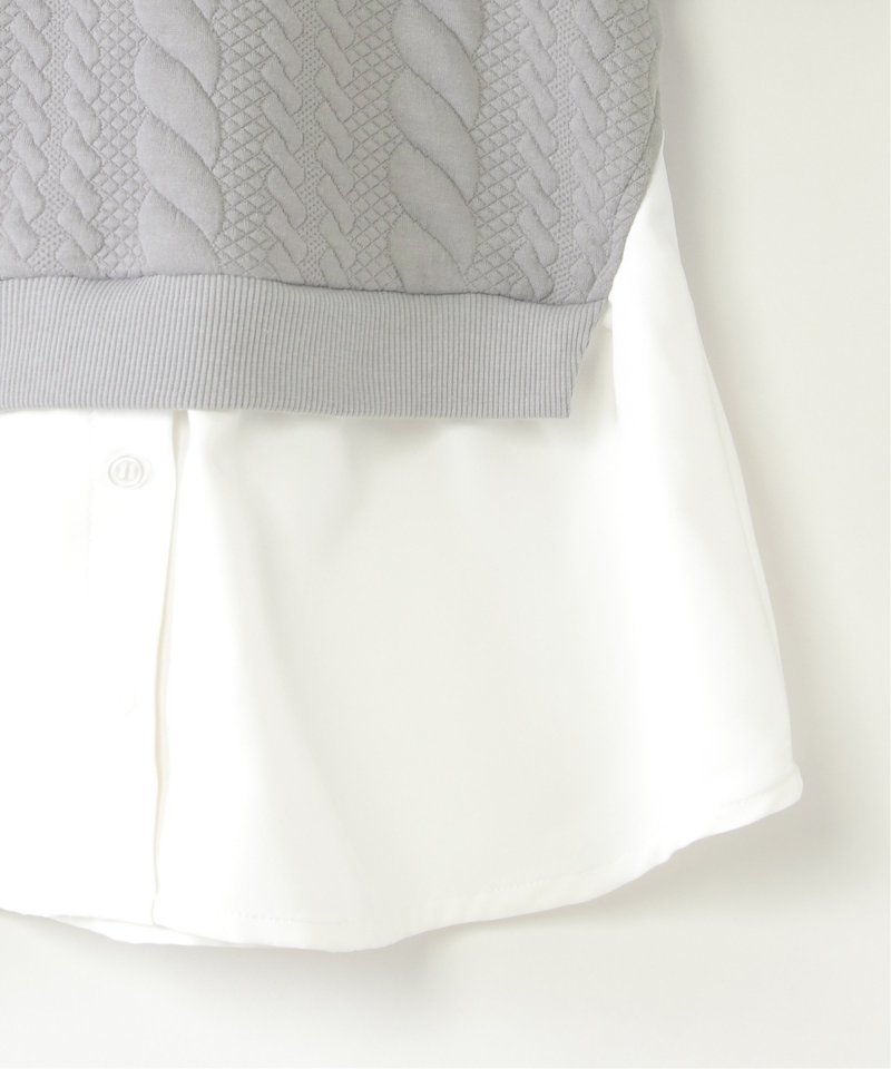 シャツとケーブル柄のフクレジャカードカットソーを重ね着したレイヤード風デザイン。