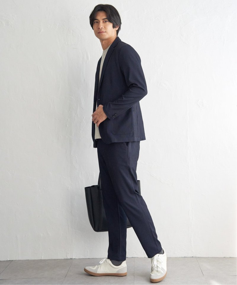 凹凸感のあるサッカージャージー素材を使用した、軽やかな着心地のテーラードジャケット。