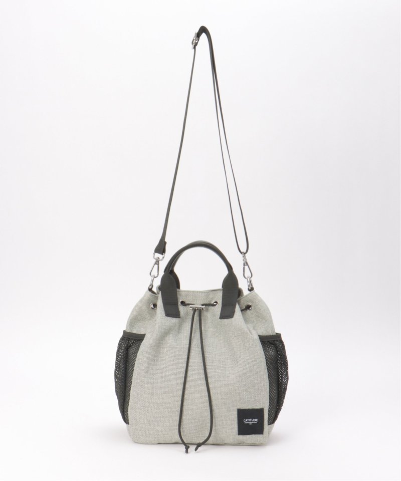 ポリエステルジュート生地にメッシュ素材のポケットが付いた、さり気ないスポーティーさのある2WAYバッグ。