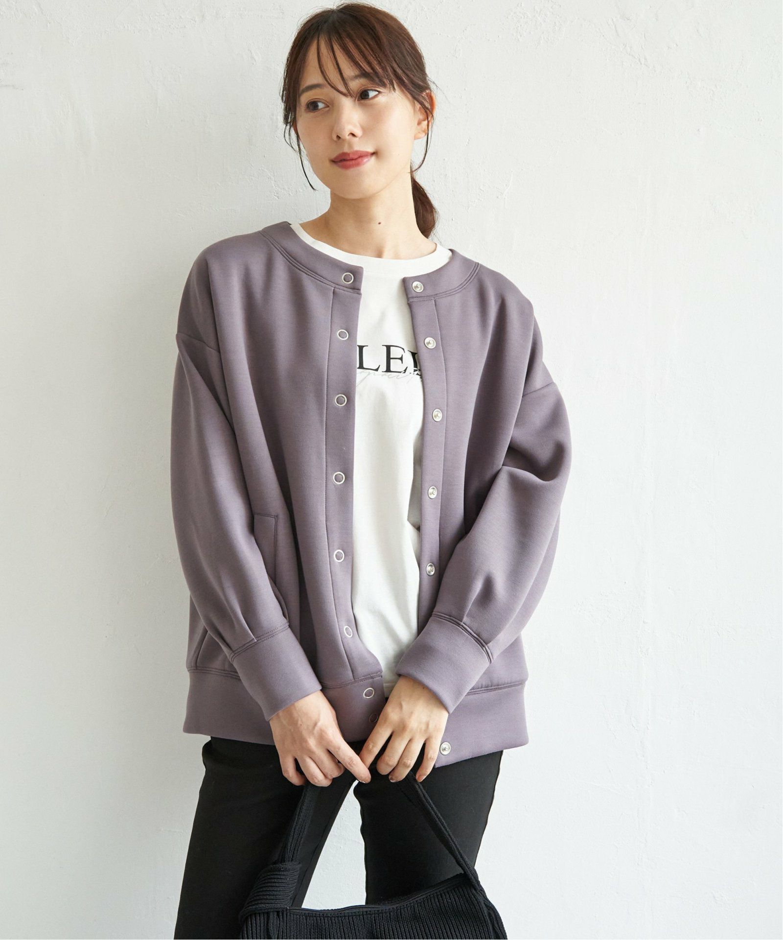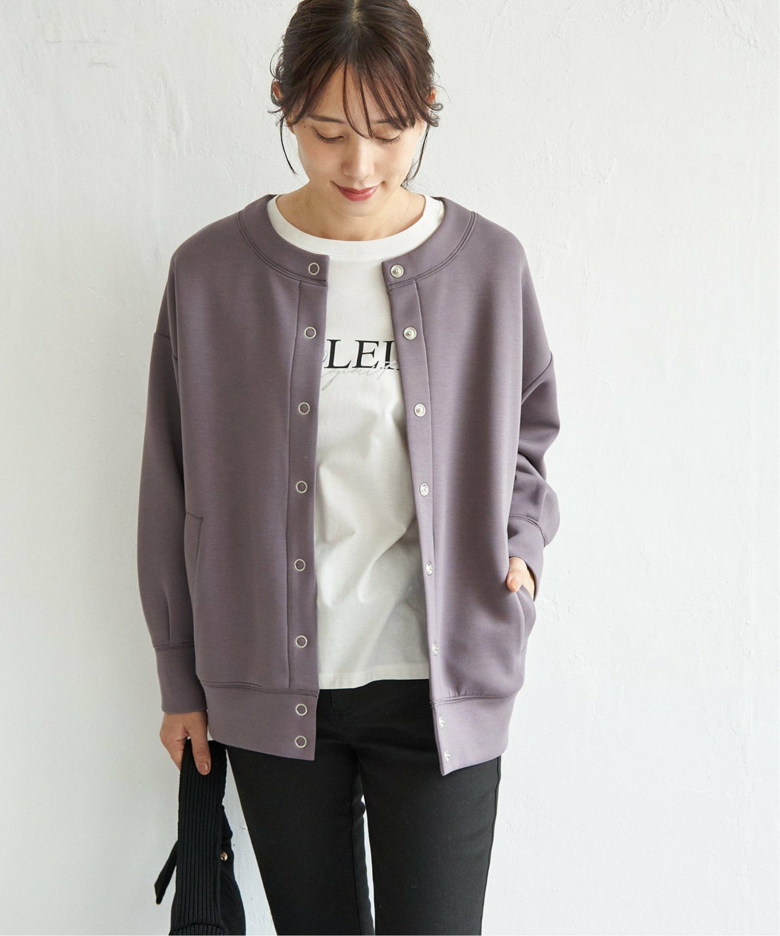 動きにフィットする2WAYストレッチで快適 【洗濯機で洗える】ダンボールニットノーカラーカーディガン