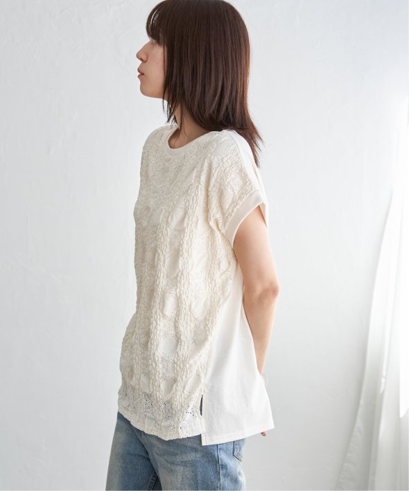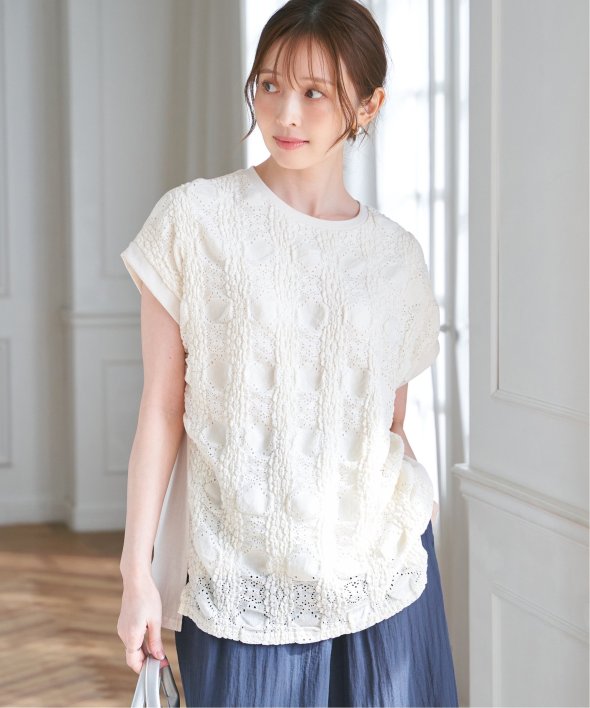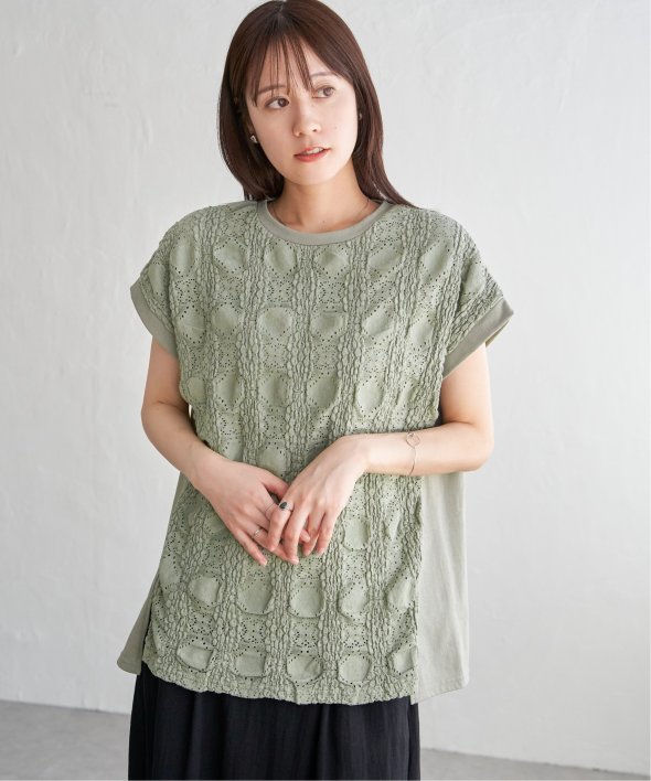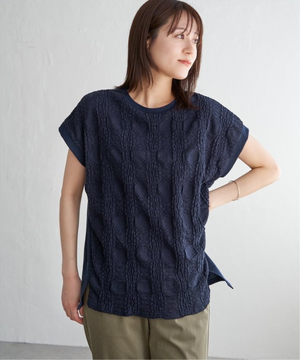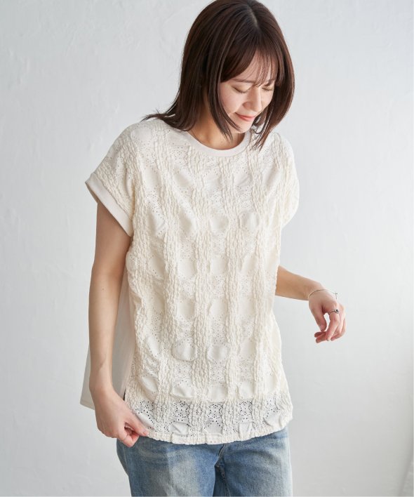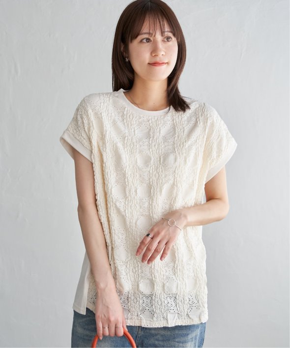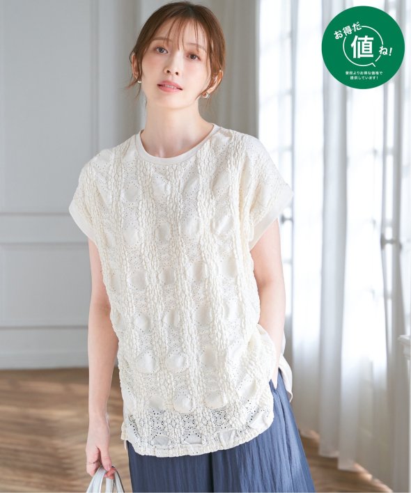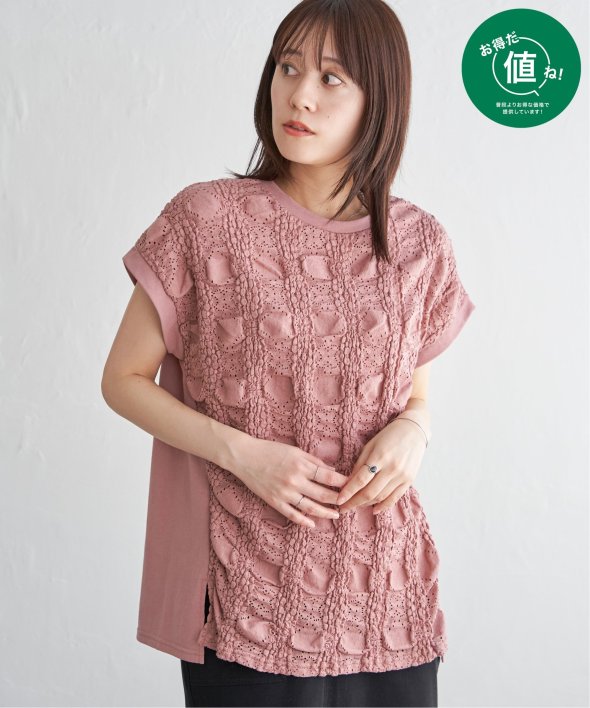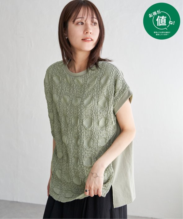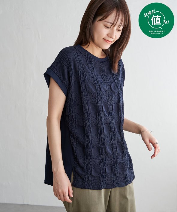 【お得だ値!対象】定価でもお求めやすくご用意しております。前後で表情を変える、異素材コンビが魅力のプルオーバーです。フロントには凹凸のあるレースジャガードを使用し、視覚にも立体感を。バックにはやわらかく肌あたりの良い天竺素材を採用し、着心地と動きやすさにも配慮しました。【素材】フロントはポコポコした凹凸感のあるレースジャカード。高級感のあるデザイン的な見え感が魅力的です。裏地がついているので白トップスでも透けがきになりません。更に後ろ身頃は無地になっており、切り替えデザインもお楽しみいただけます。【デザイン】夏らしく女性らしさを感じるフレンチスリーブは、二の腕カバーができる袖丈にしました。首元はクルーネックで、カジュアルなTシャツデザインに敢えてすることで素材感を生かしました。サイドにはスリットを施し、前後差をつけることでこなれ感も感じられます。【ikkaポイント】涼し気なレース素材で、シンプルになりがちなTシャツを奥行感のある高見えTシャツに進化。夏らしい白に加えて、柄がはっきりとわかりやすいカーキやピンク、お出かけにも最適なネイビーを採用しました。■スタッフ着用コメント160cm/オフホワイト/Mサイズどうしても夏のTシャツはシンプルでカジュアルなものが多い中、フェミニンで華やかなTシャツが出て嬉しいです♪夏らしいオフホワイトは、ジャガードレースがおしゃれでスカートにも合います。1,990円って安すぎたので、洗い替えで2枚ゲットしました!裏地がついているので、安心して着られます。■ お得だ値 (ね)!とは?普段より「お得な価格」で提供している商品です。- コストダウンの取り組み -・生産地を見直し、製造コストをダウン・工場の閑散期に生産することで、製造コストをダウン・オリジナル素材を開発し、素材コストをダウン今シーズンは「値下げ」をしない安心価格です! [洗濯方法]洗濯の際はネットを使用してください