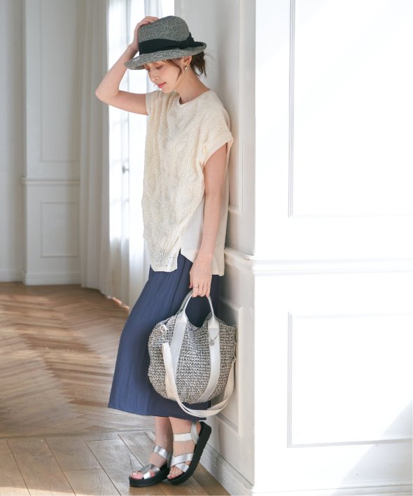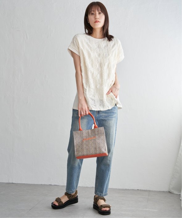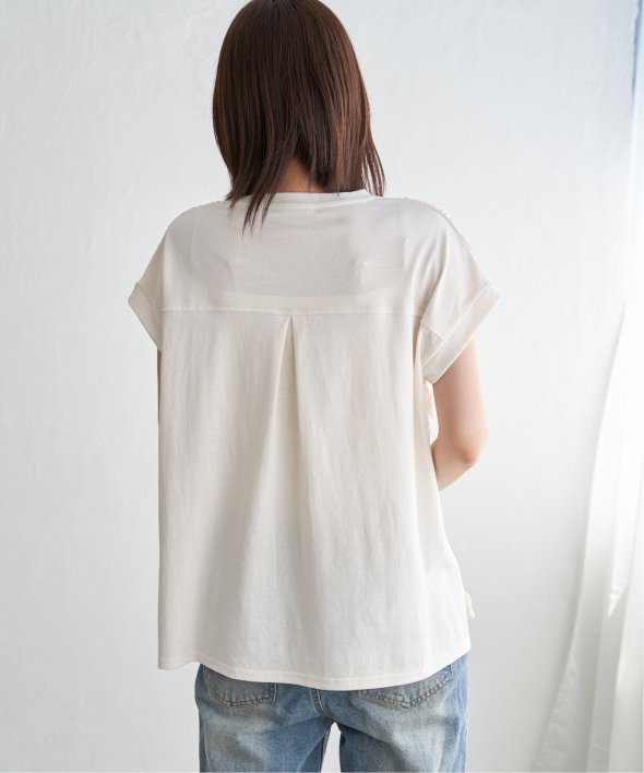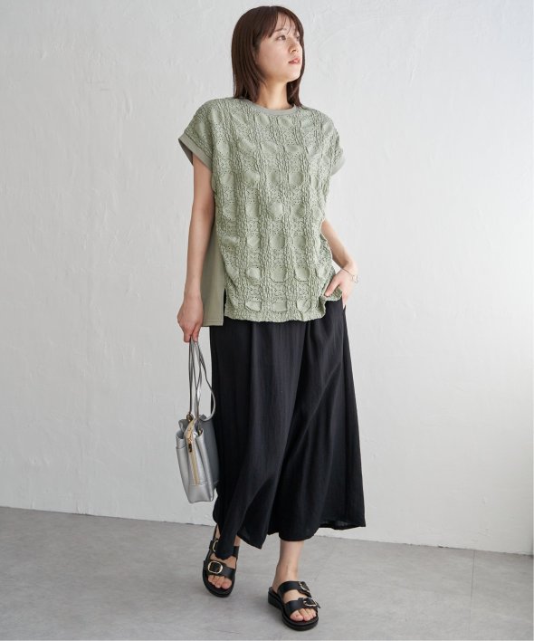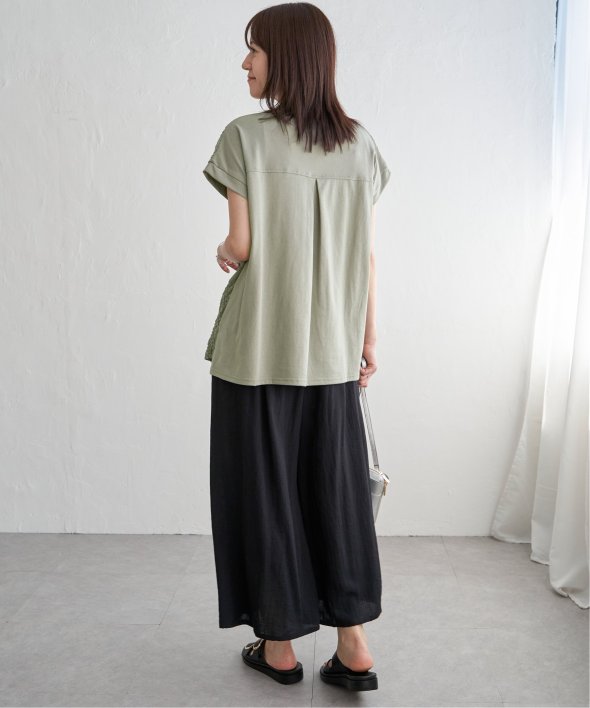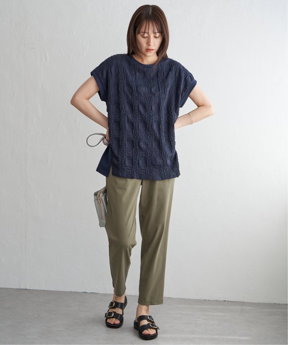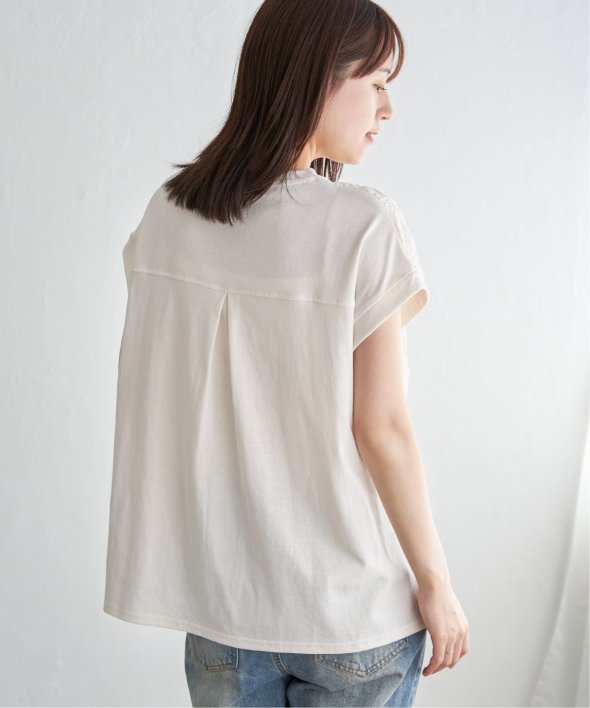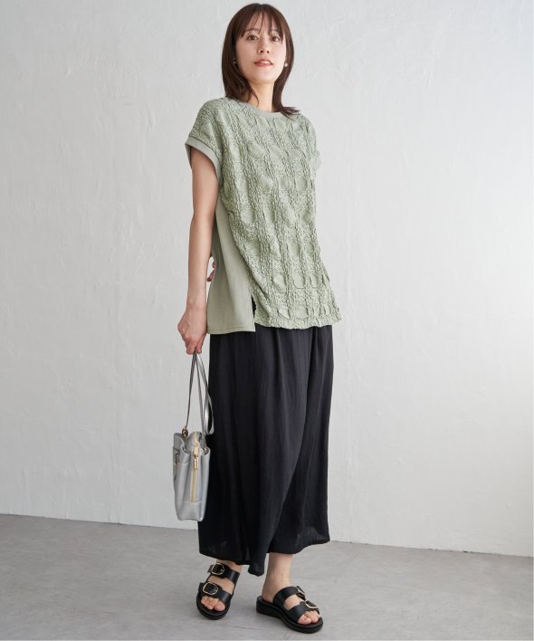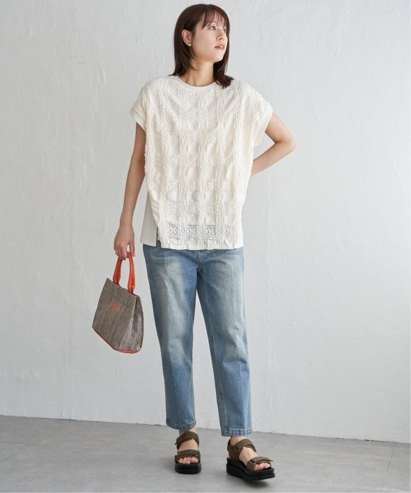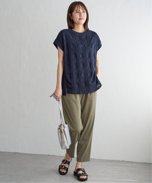 【お得だ値!対象】定価でもお求めやすくご用意しております。前後で表情を変える、異素材コンビが魅力のプルオーバーです。フロントには凹凸のあるレースジャガードを使用し、視覚にも立体感を。バックにはやわらかく肌あたりの良い天竺素材を採用し、着心地と動きやすさにも配慮しました。【素材】フロントはポコポコした凹凸感のあるレースジャカード。高級感のあるデザイン的な見え感が魅力的です。裏地がついているので白トップスでも透けがきになりません。更に後ろ身頃は無地になっており、切り替えデザインもお楽しみいただけます。【デザイン】夏らしく女性らしさを感じるフレンチスリーブは、二の腕カバーができる袖丈にしました。首元はクルーネックで、カジュアルなTシャツデザインに敢えてすることで素材感を生かしました。サイドにはスリットを施し、前後差をつけることでこなれ感も感じられます。【ikkaポイント】涼し気なレース素材で、シンプルになりがちなTシャツを奥行感のある高見えTシャツに進化。夏らしい白に加えて、柄がはっきりとわかりやすいカーキやピンク、お出かけにも最適なネイビーを採用しました。■スタッフ着用コメント160cm/オフホワイト/Mサイズどうしても夏のTシャツはシンプルでカジュアルなものが多い中、フェミニンで華やかなTシャツが出て嬉しいです♪夏らしいオフホワイトは、ジャガードレースがおしゃれでスカートにも合います。1,990円って安すぎたので、洗い替えで2枚ゲットしました!裏地がついているので、安心して着られます。■ お得だ値 (ね)!とは?普段より「お得な価格」で提供している商品です。- コストダウンの取り組み -・生産地を見直し、製造コストをダウン・工場の閑散期に生産することで、製造コストをダウン・オリジナル素材を開発し、素材コストをダウン今シーズンは「値下げ」をしない安心価格です! [洗濯方法]洗濯の際はネットを使用してください